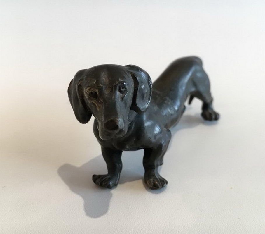 Small bronze teckelSmall bronze teckel. Circa 1880Request priceDimensionsWidth3.54 inch9 cmDepth1.38 inch3.5 cmHeight1.77 inch4.5 cmInformationProduct codeAni-569