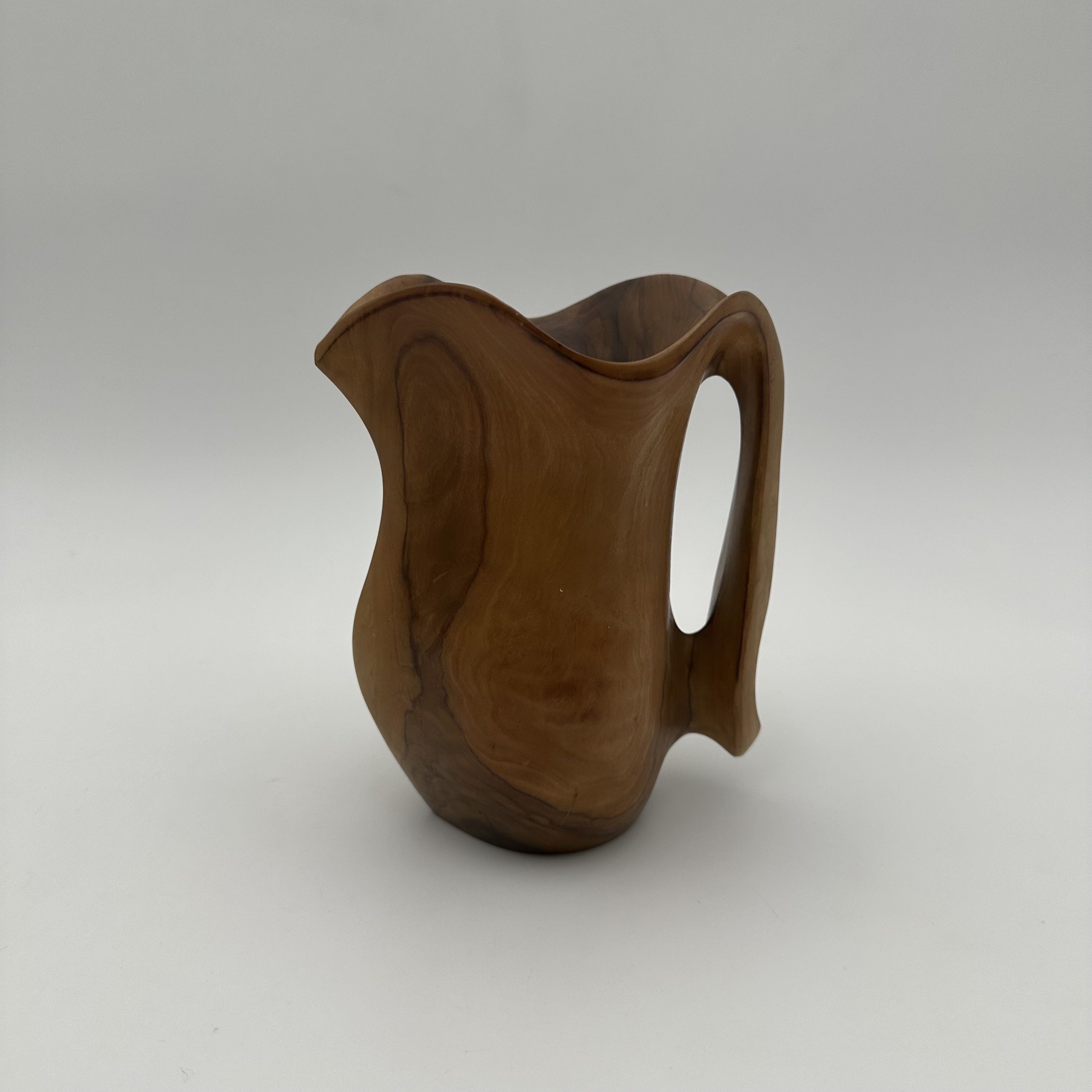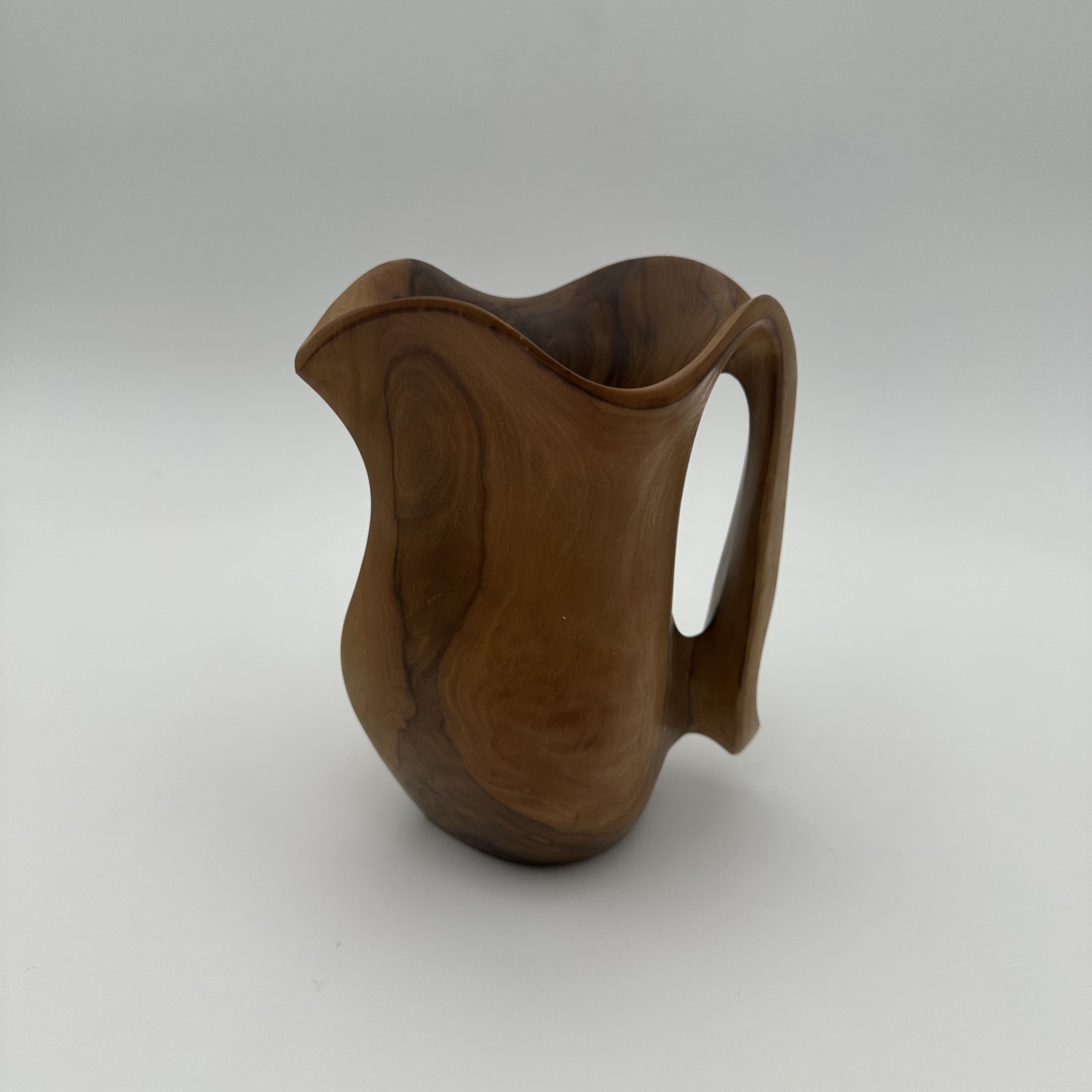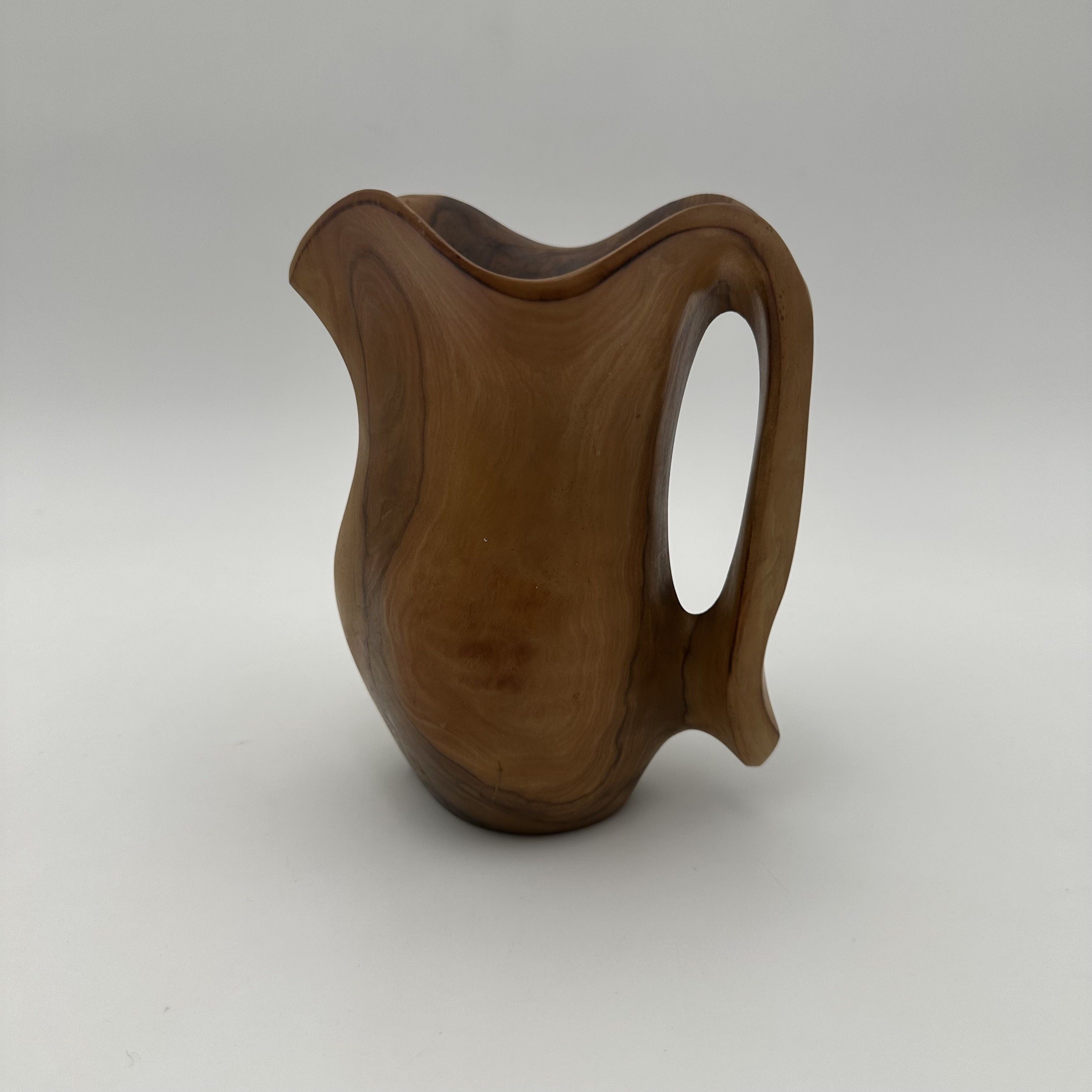 This delightful sculptural walnut pitcher perfectly illustrates the organic aesthetic that profoundly marked mid-20th-century decorative arts. Carved directly from a solid block of wood, this free-form piece is fully in the spirit of the masterful works by the famous French sculptor and cabinetmaker Alexandre Noll. It bears witness to a desire to elevate organic material through pure and sensual lines, breaking free from any strict geometry. With its compact dimensions, the object captivates with the exceptional fluidity of its curves and the elegance of its handle, which seems to spring naturally from the body of the pitcher. The choice of walnut wood is highly significant: the careful polishing of the surface beautifully highlights the sinuous grain and warm tones of this noble wood. The pattern of the wood grain follows the roundness of the object, elevating this everyday piece to the status of a true small abstract sculpture. Consequently, every viewing angle offers a different perspective. Offered in excellent vintage condition, with a soft and luminous patina, this pitcher is a highly distinctive decorative piece. It will blend seamlessly into a contemporary, 'wabi-sabi', or mid-century modern interior, delicately placed on a sideboard, a coffee table, or the shelves of a bookcase, bringing a touch of nature and warmth.