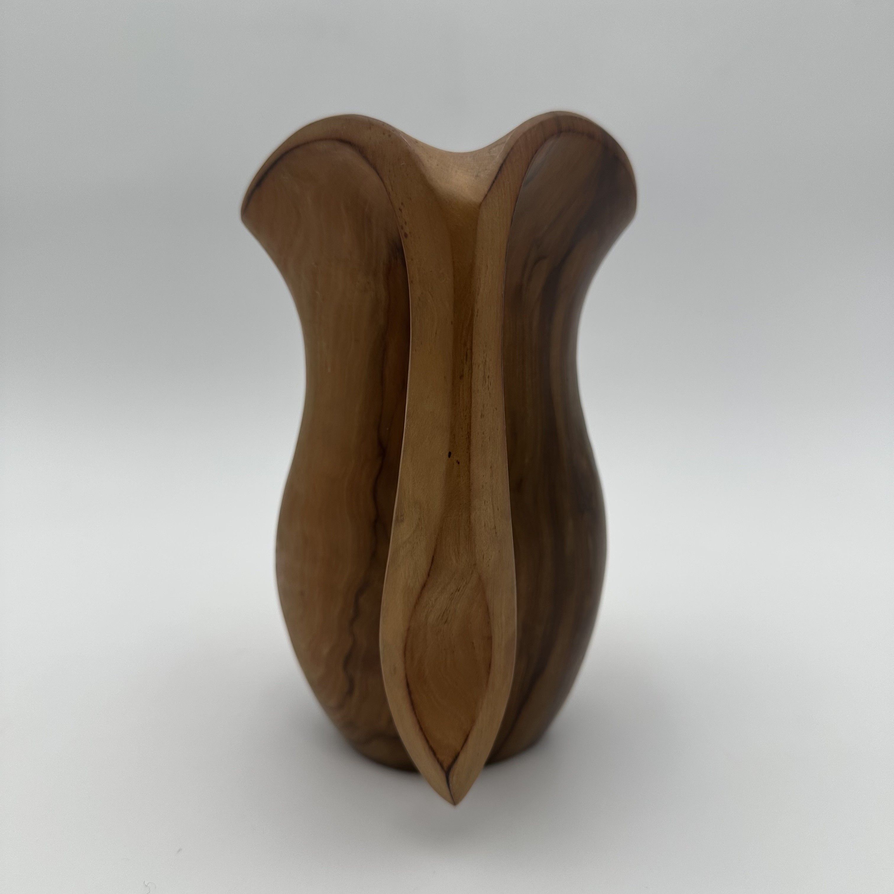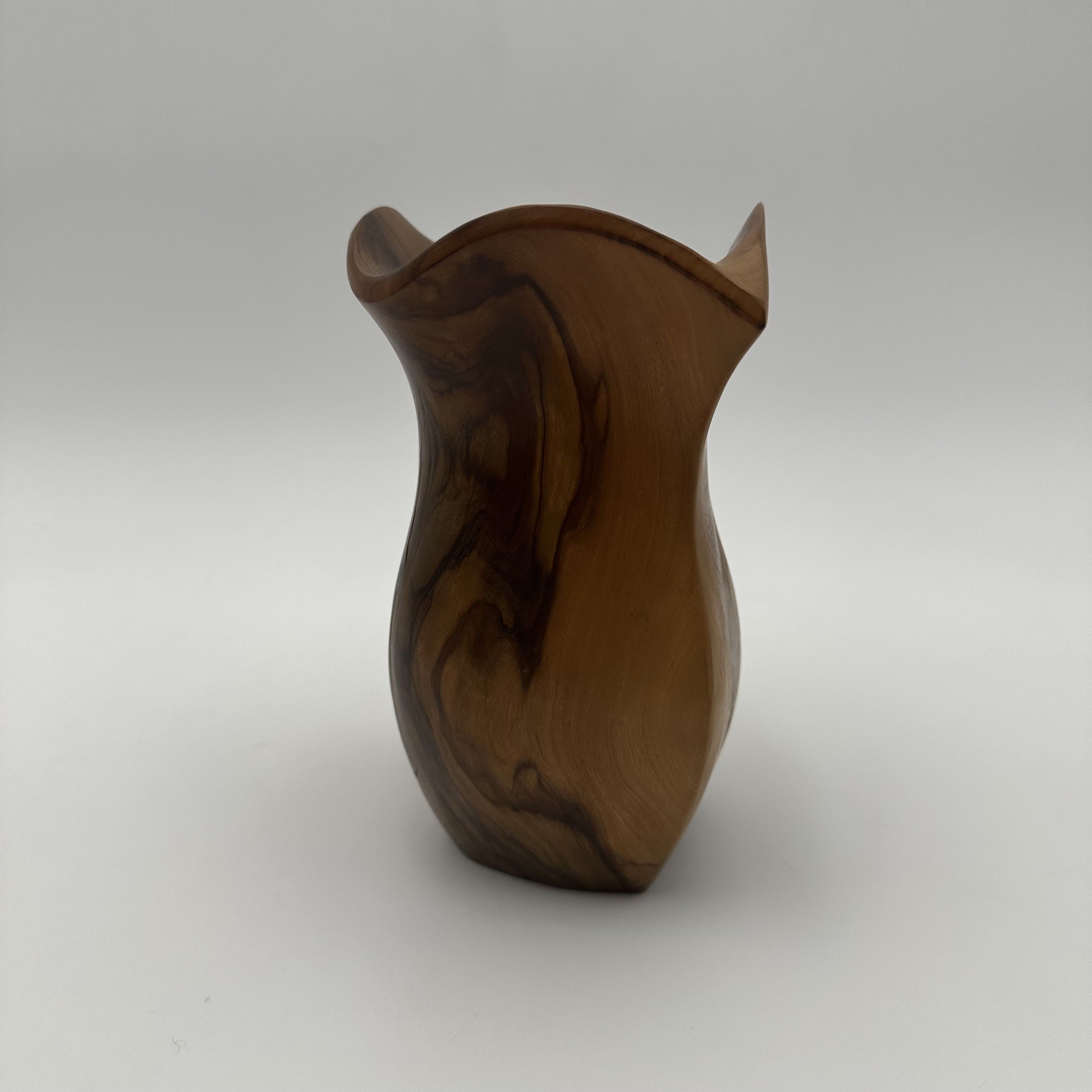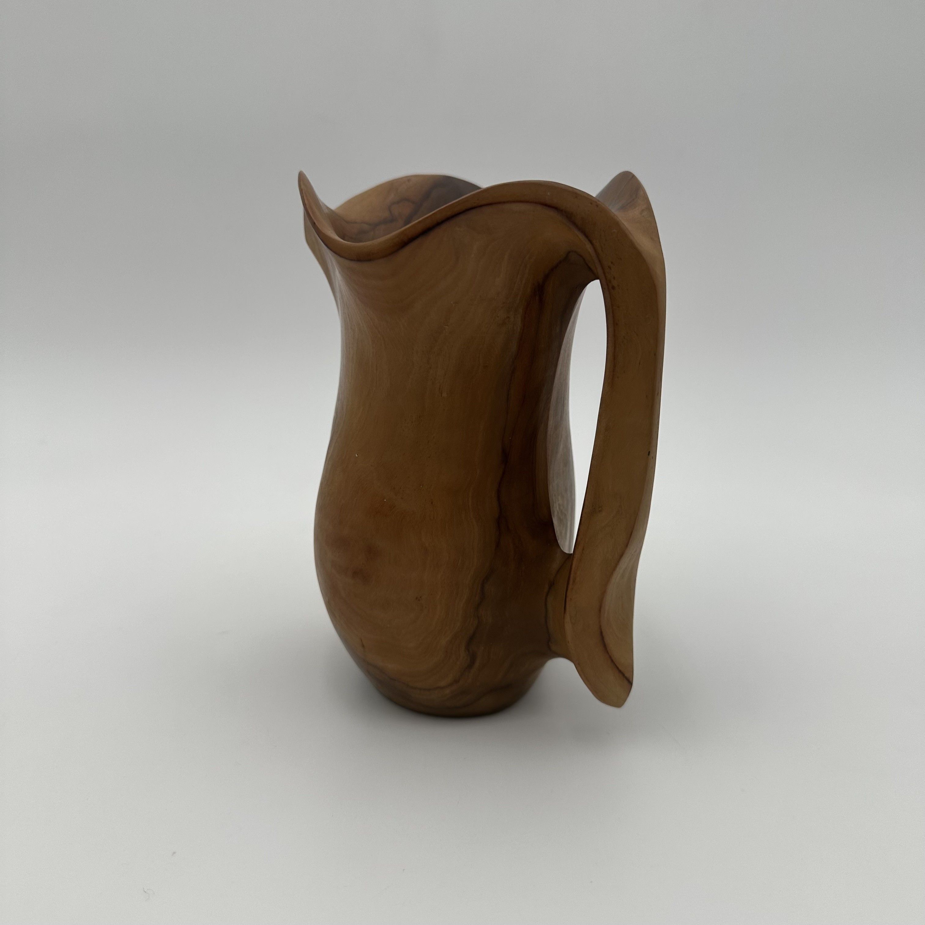 This delightful sculptural walnut pitcher perfectly illustrates the organic aesthetic that profoundly marked mid-20th-century decorative arts. Carved directly from a solid block of wood, this free-form piece is fully in the spirit of the masterful works by the famous French sculptor and cabinetmaker Alexandre Noll. It bears witness to a desire to elevate organic material through pure and sensual lines, breaking free from any strict geometry. With its compact dimensions, the object captivates with the exceptional fluidity of its curves and the elegance of its handle, which seems to spring naturally from the body of the pitcher. The choice of walnut wood is highly significant: the careful polishing of the surface beautifully highlights the sinuous grain and warm tones of this noble wood. The pattern of the wood grain follows the roundness of the object, elevating this everyday piece to the status of a true small abstract sculpture. Consequently, every viewing angle offers a different perspective. Offered in excellent vintage condition, with a soft and luminous patina, this pitcher is a highly distinctive decorative piece. It will blend seamlessly into a contemporary, 'wabi-sabi', or mid-century modern interior, delicately placed on a sideboard, a coffee table, or the shelves of a bookcase, bringing a touch of nature and warmth.