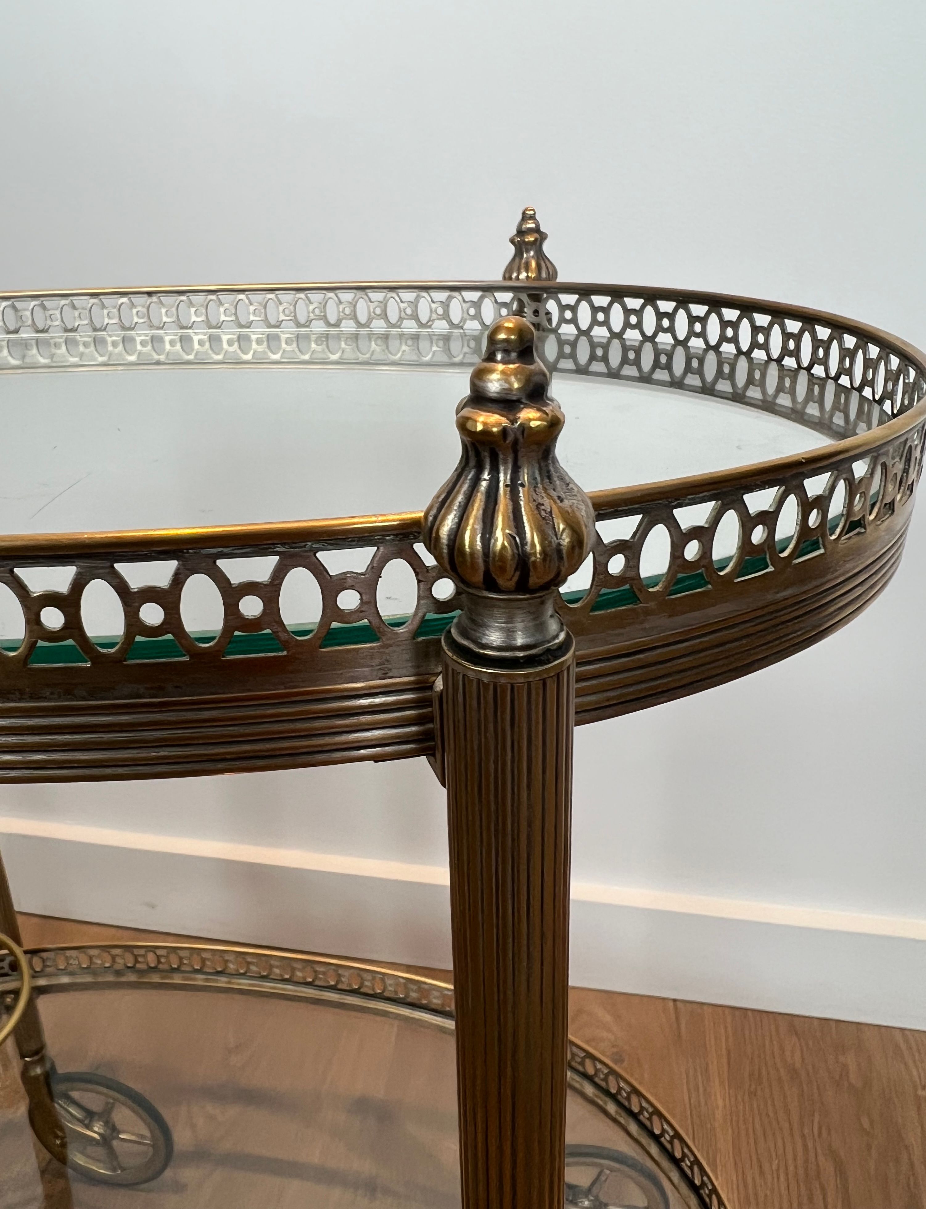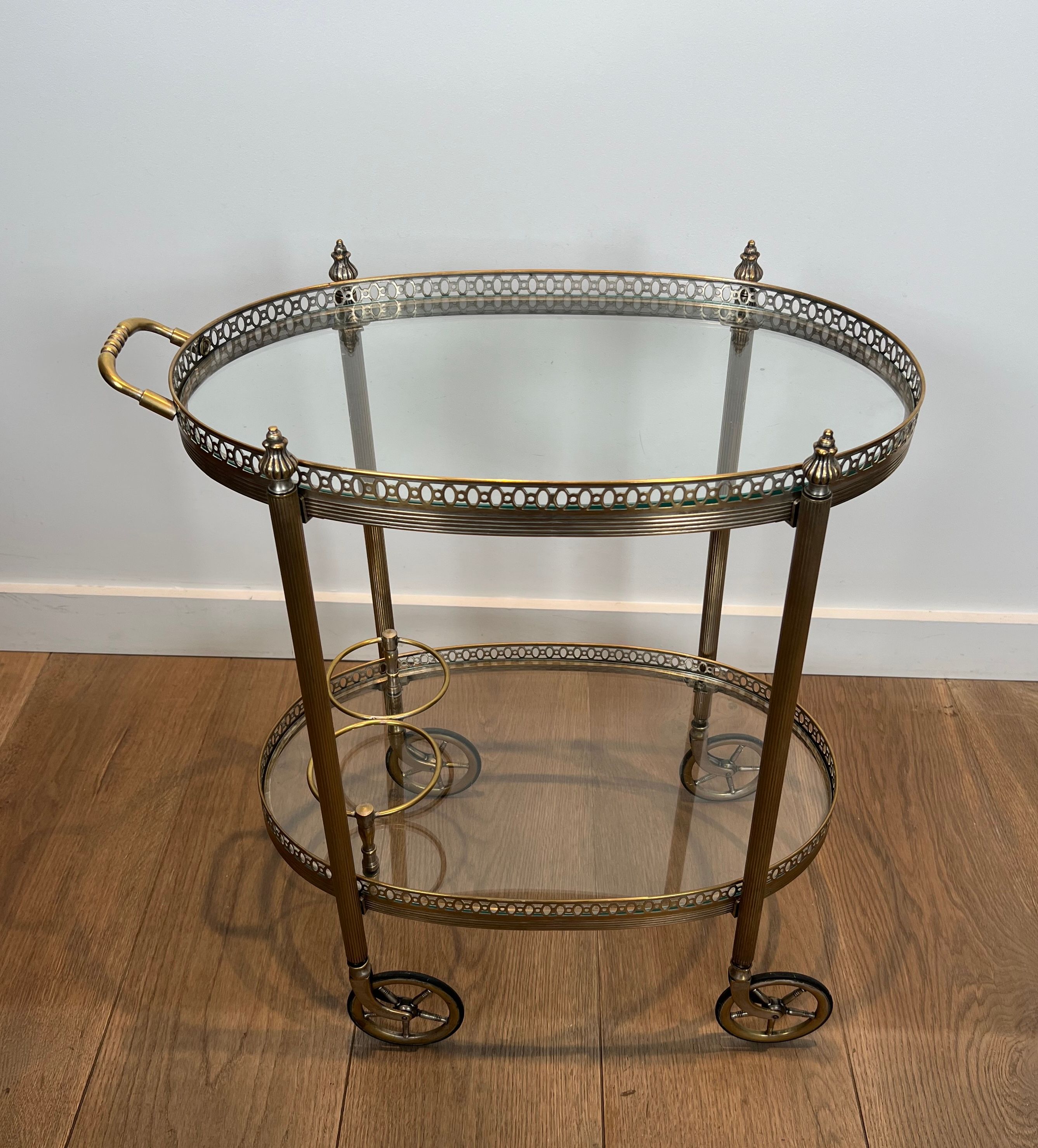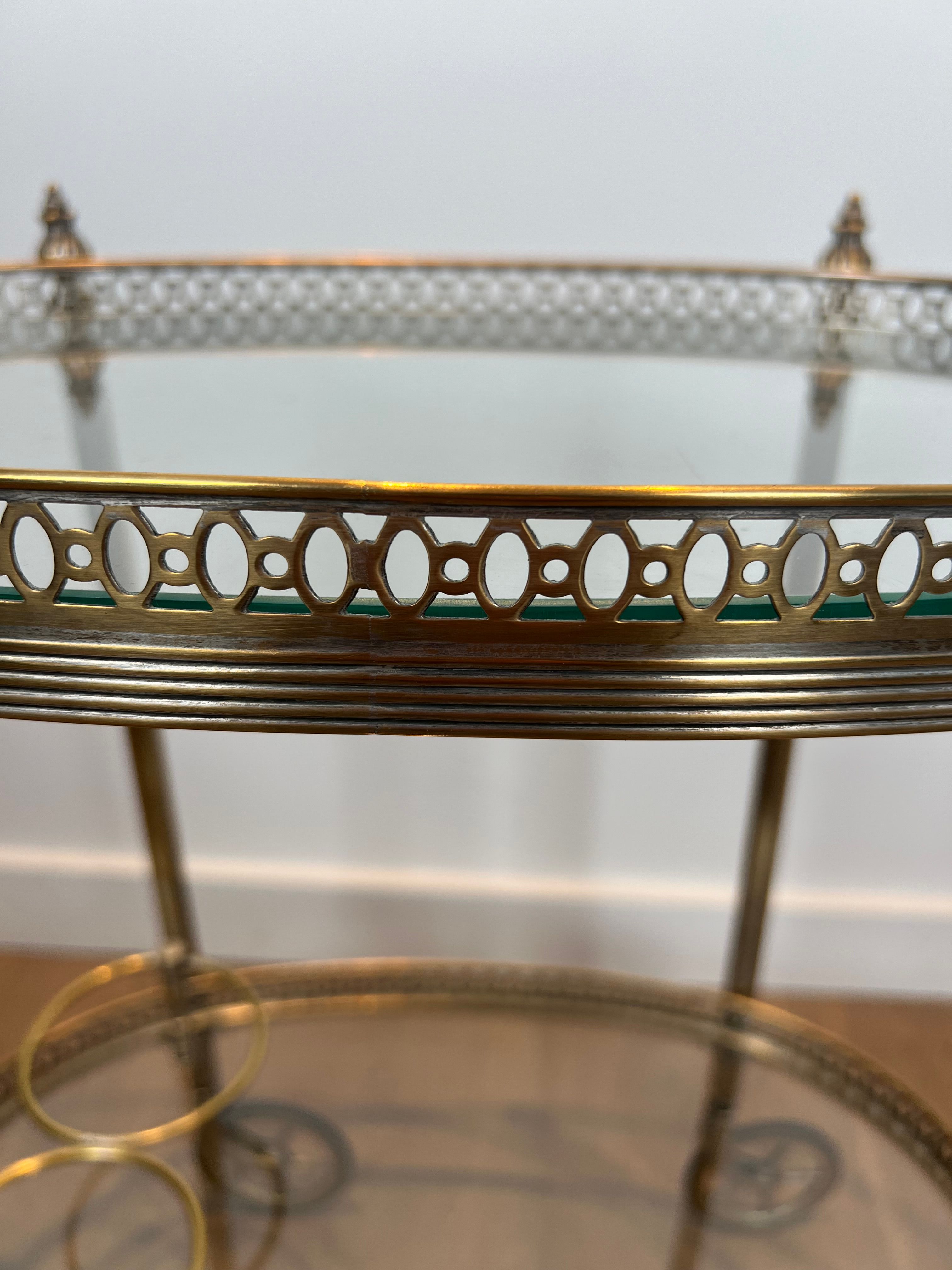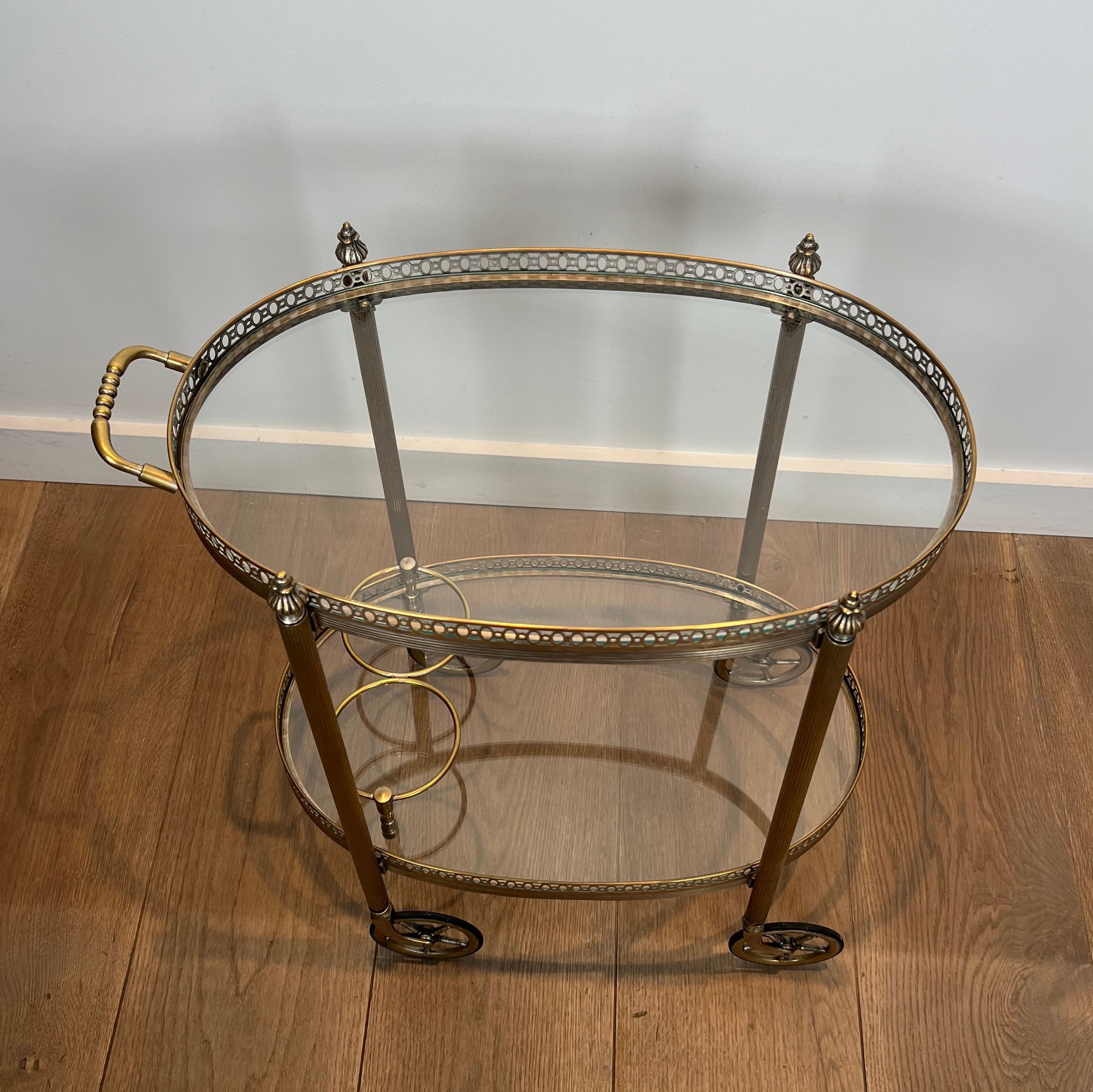 Neoclassical style oval silvered brass drinks trolley with two trays. French work by Maison Bagués. Circa 1940