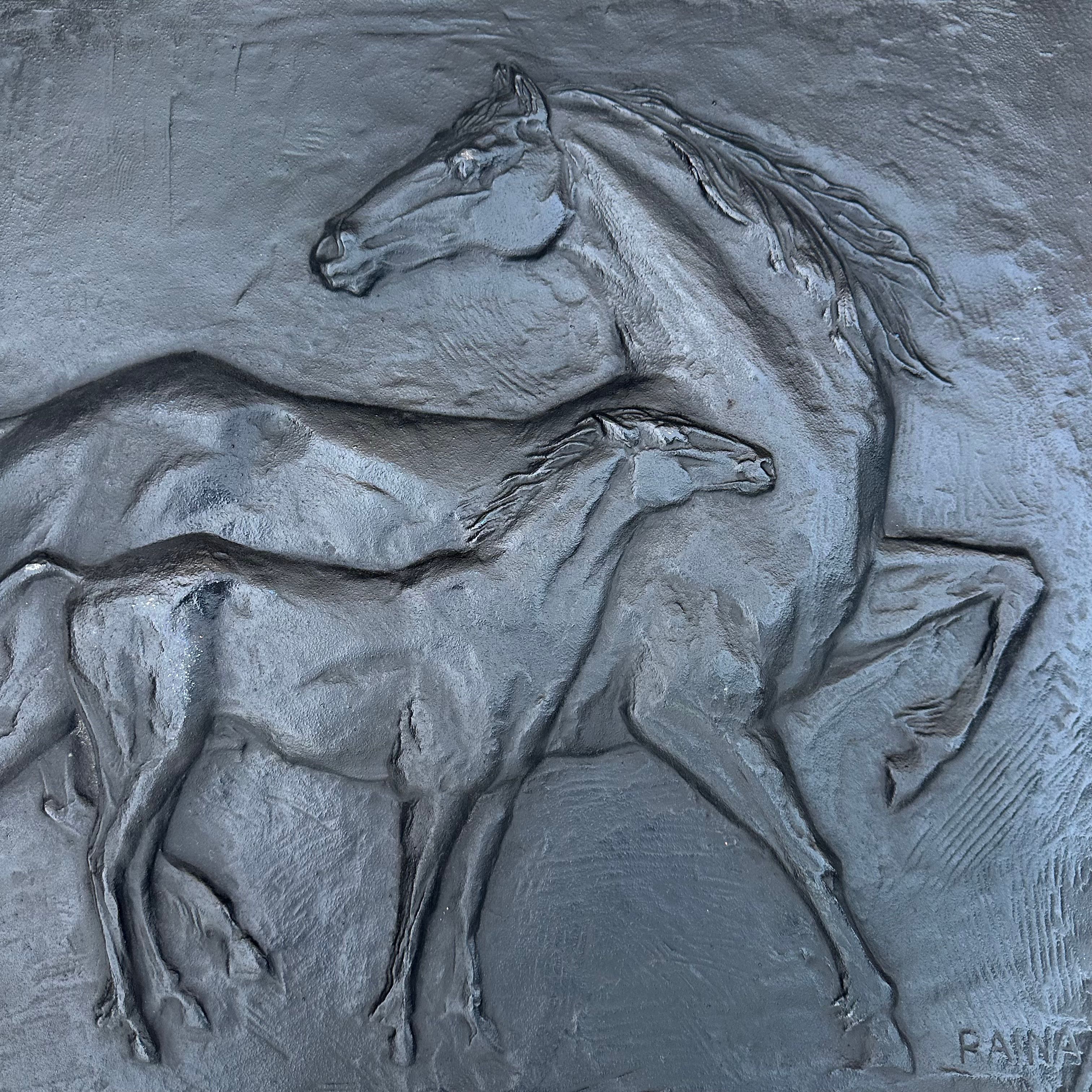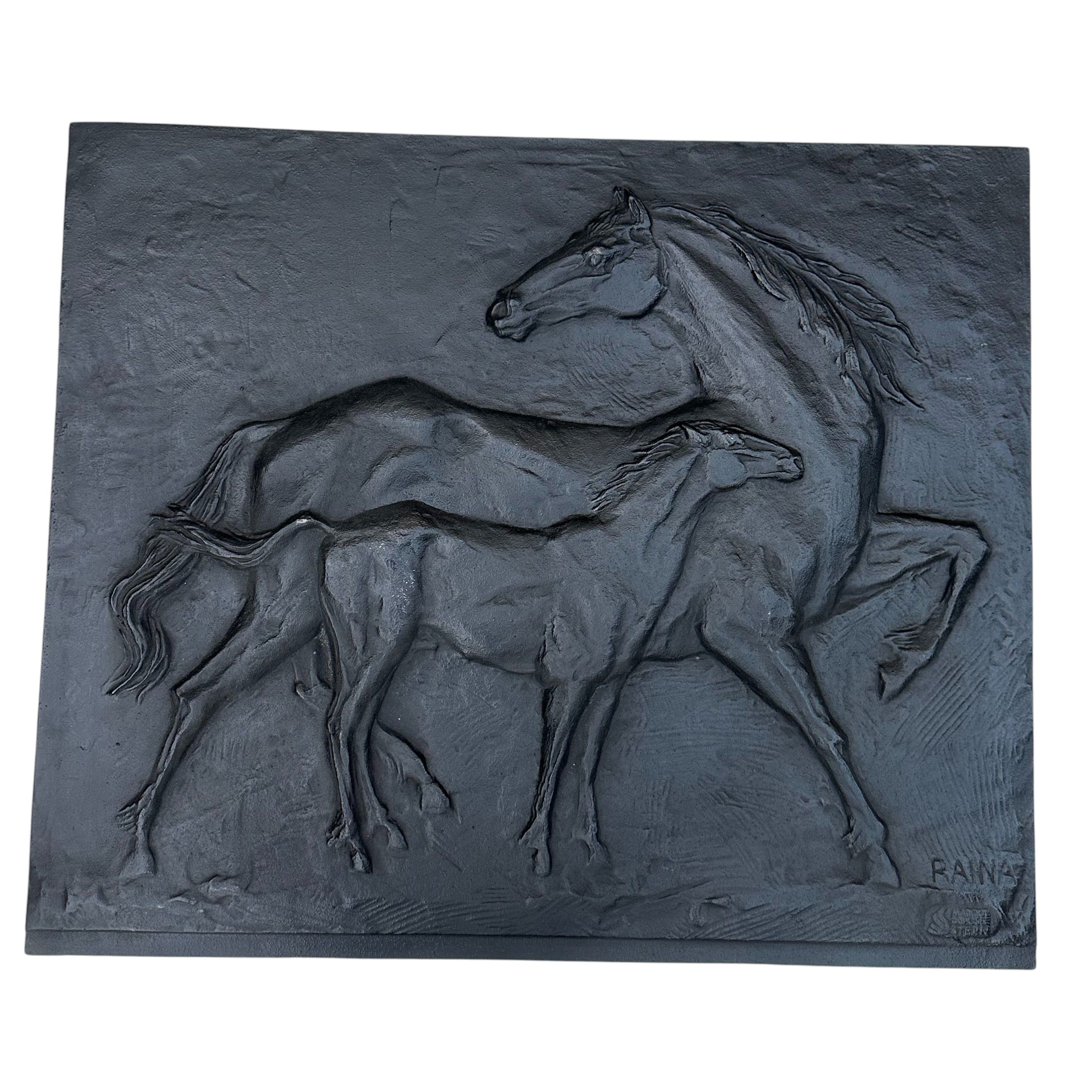 Cast Iron Fireback showing Horses Signed Raina by Foundery SternCast iron fireback showing horses. French work Signed by Raina and Stamped by foundery Stern Circa 1970Request priceDimensionsInformationProduct codeFP-9706