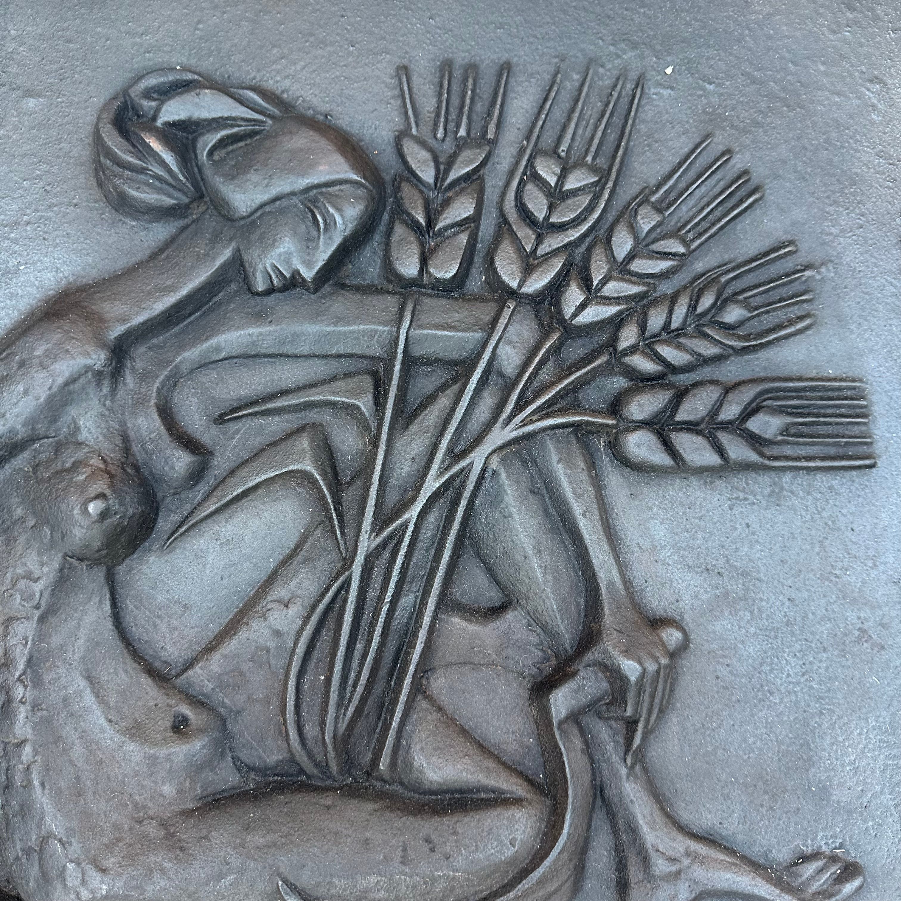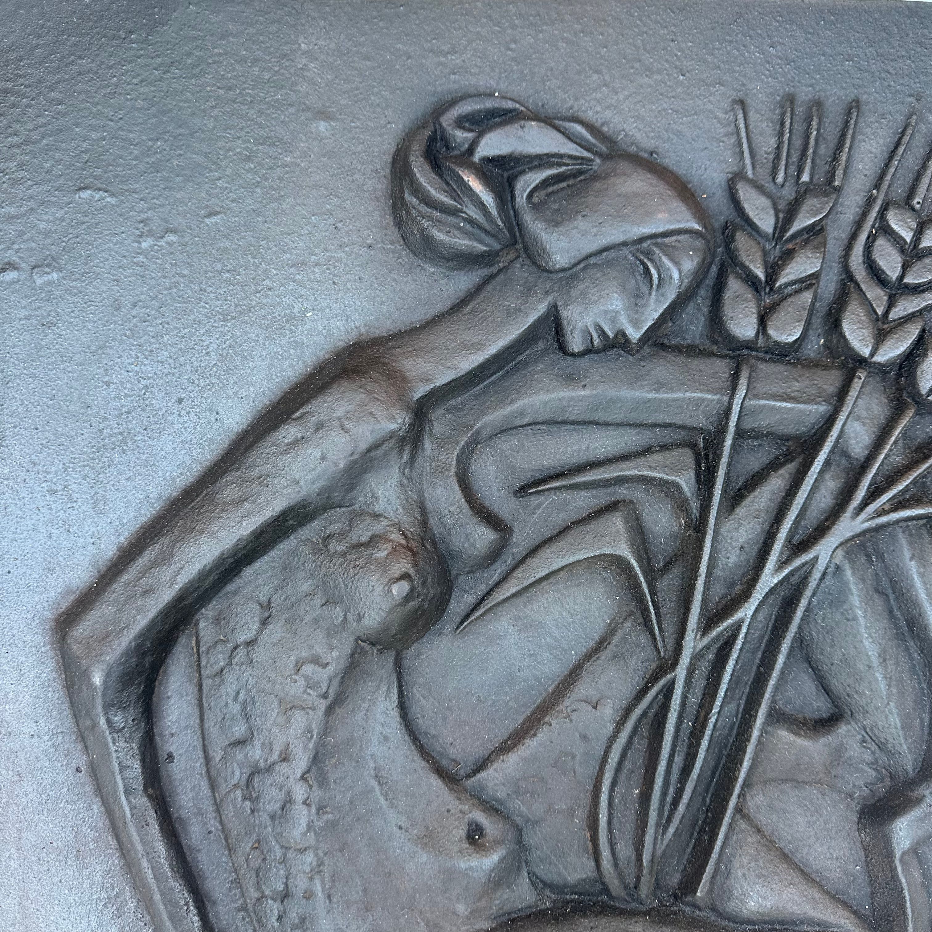 Modernist Cast Iron Fireback Representing a Nude Woman with a Scythe and Ears of Wheat