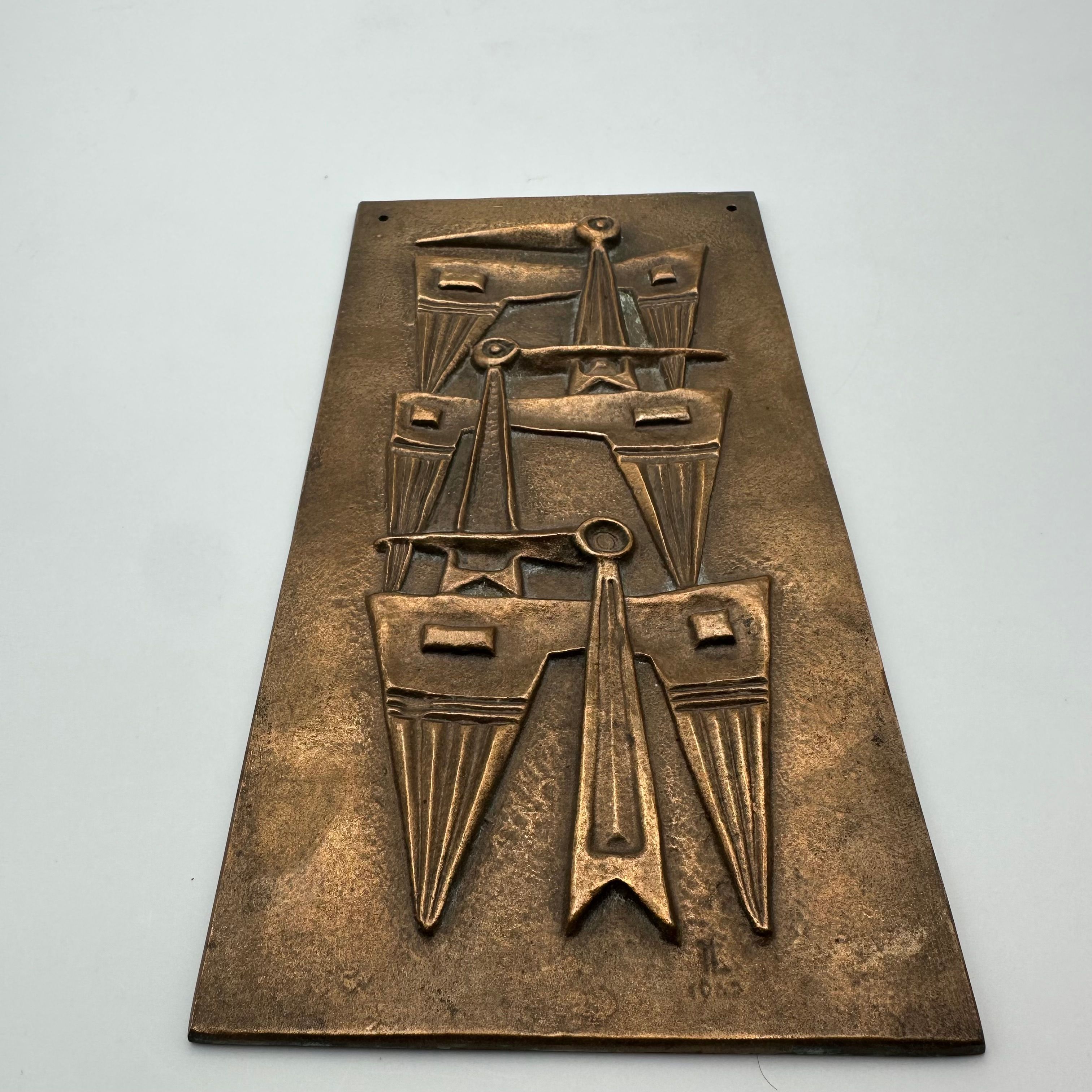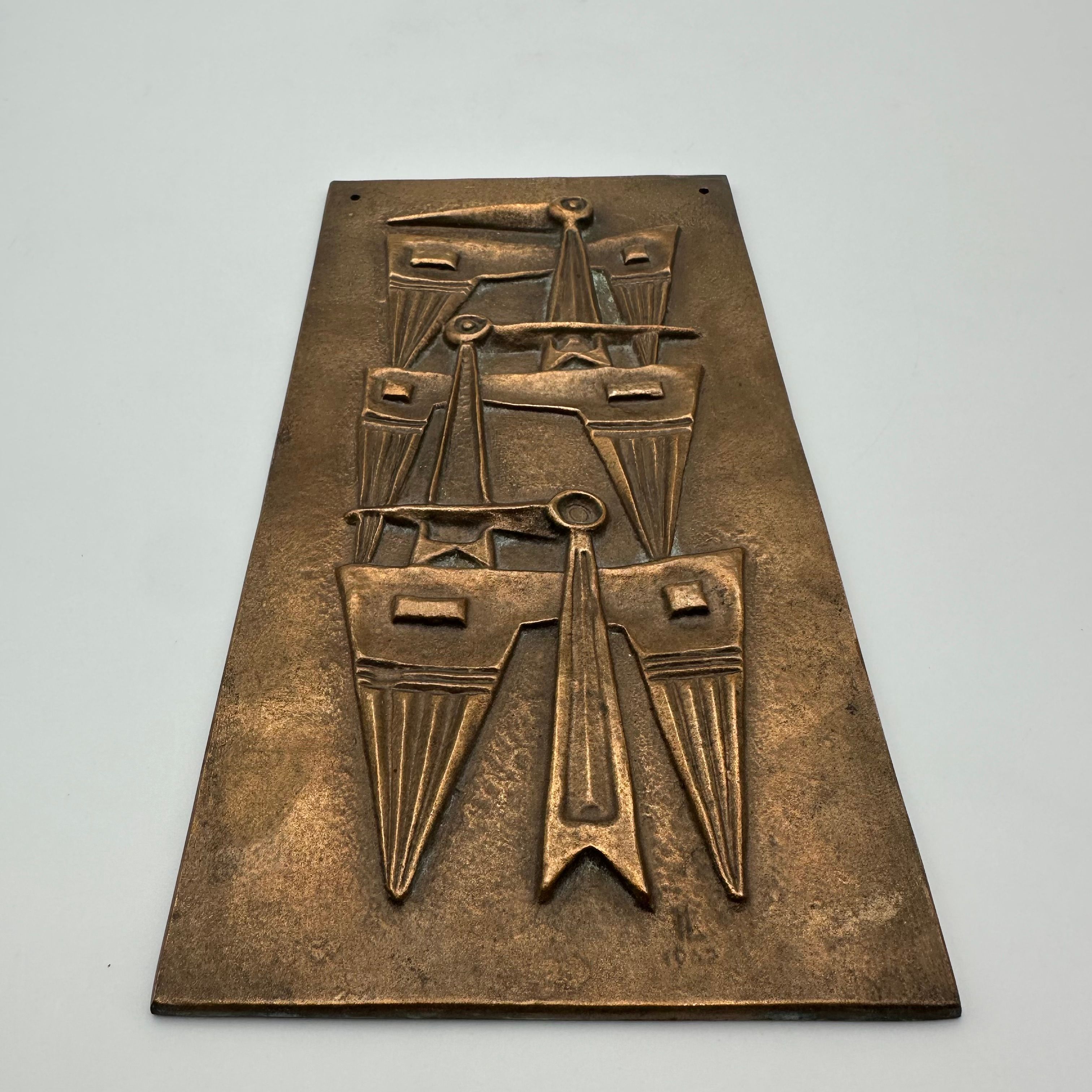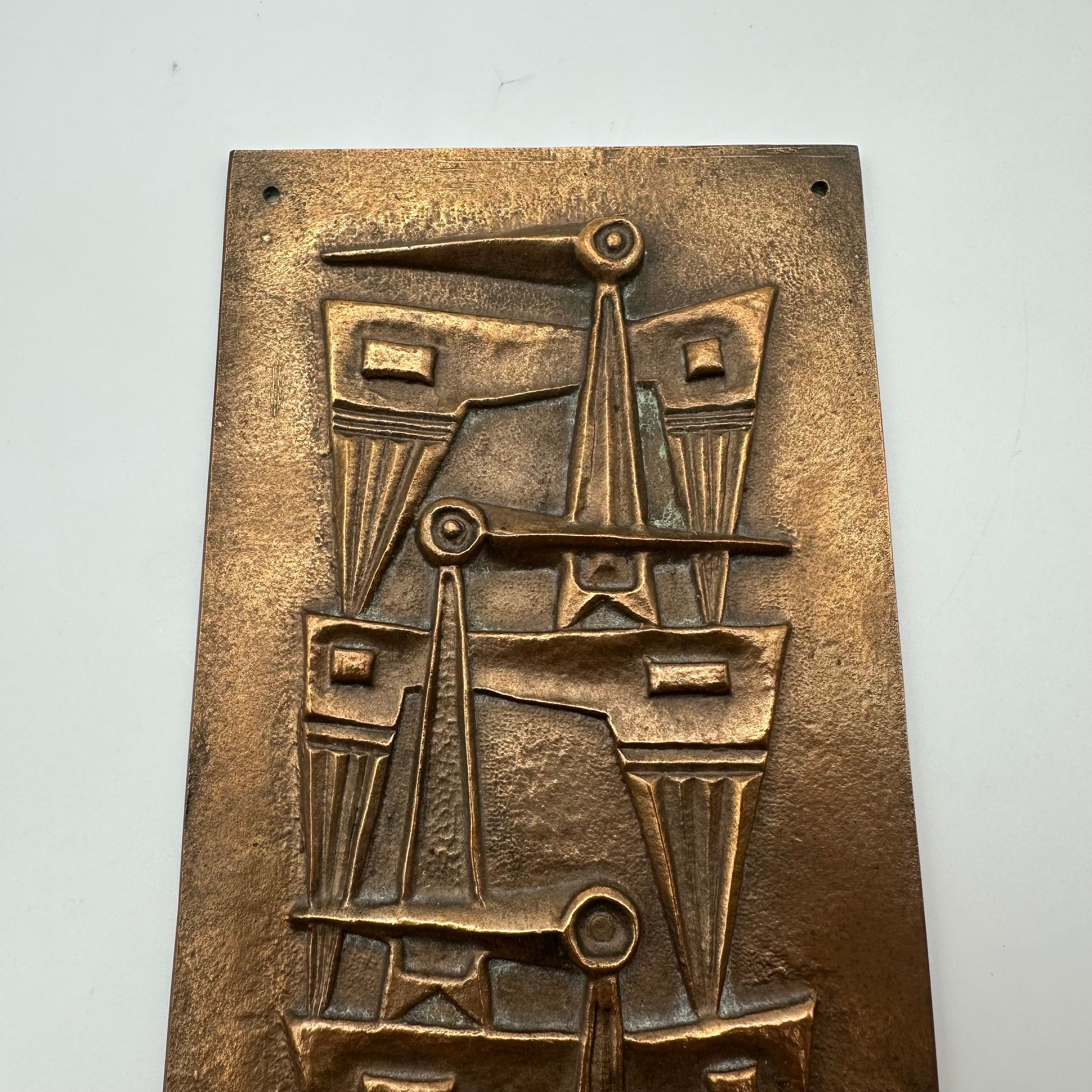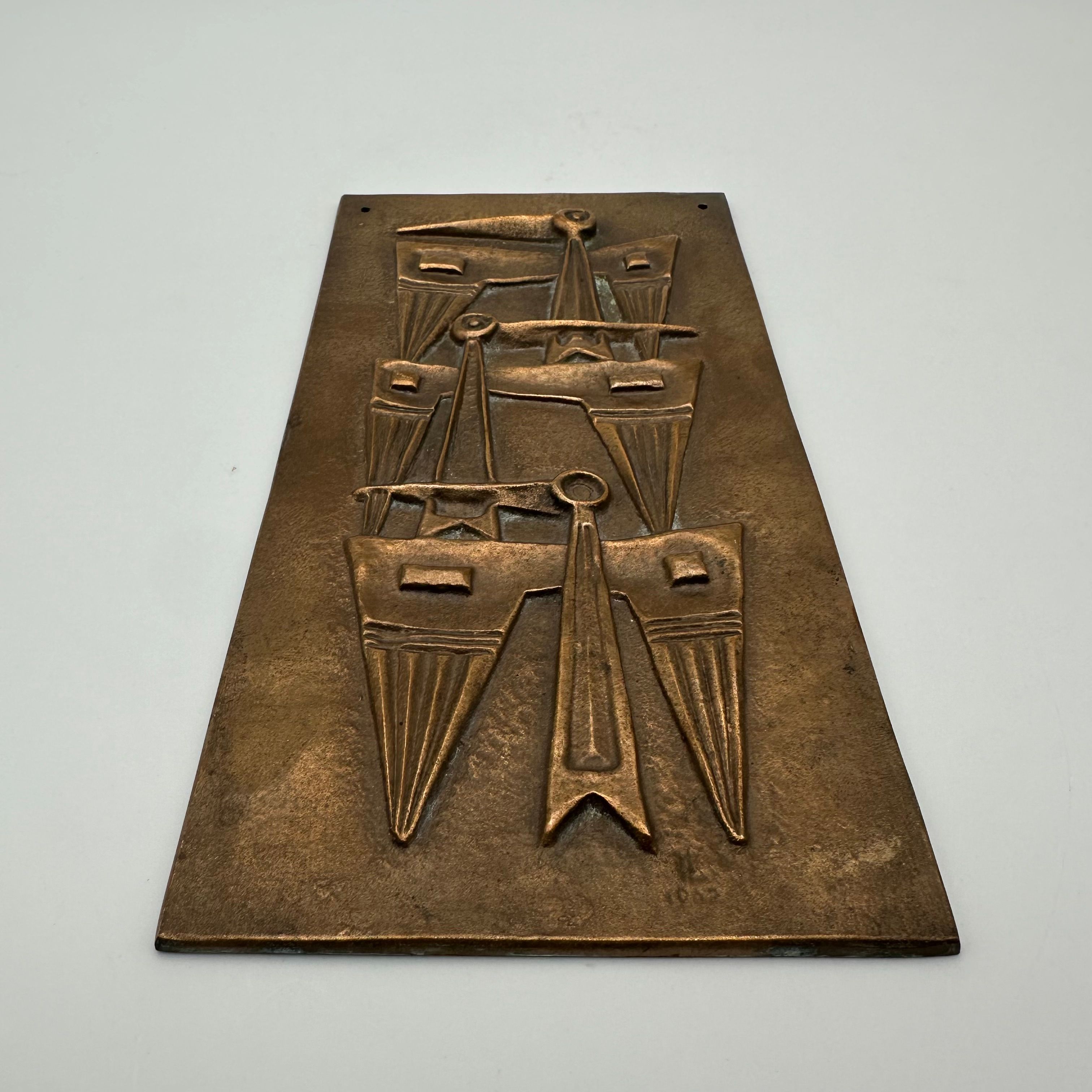 Patinated Bronze Wall Plaque featuring an abstract relief composition, evoking a stylized totemic motif. The vertically structured geometric design fully reflects the modernist and brutalist aesthetic of the second half of the 20th century.