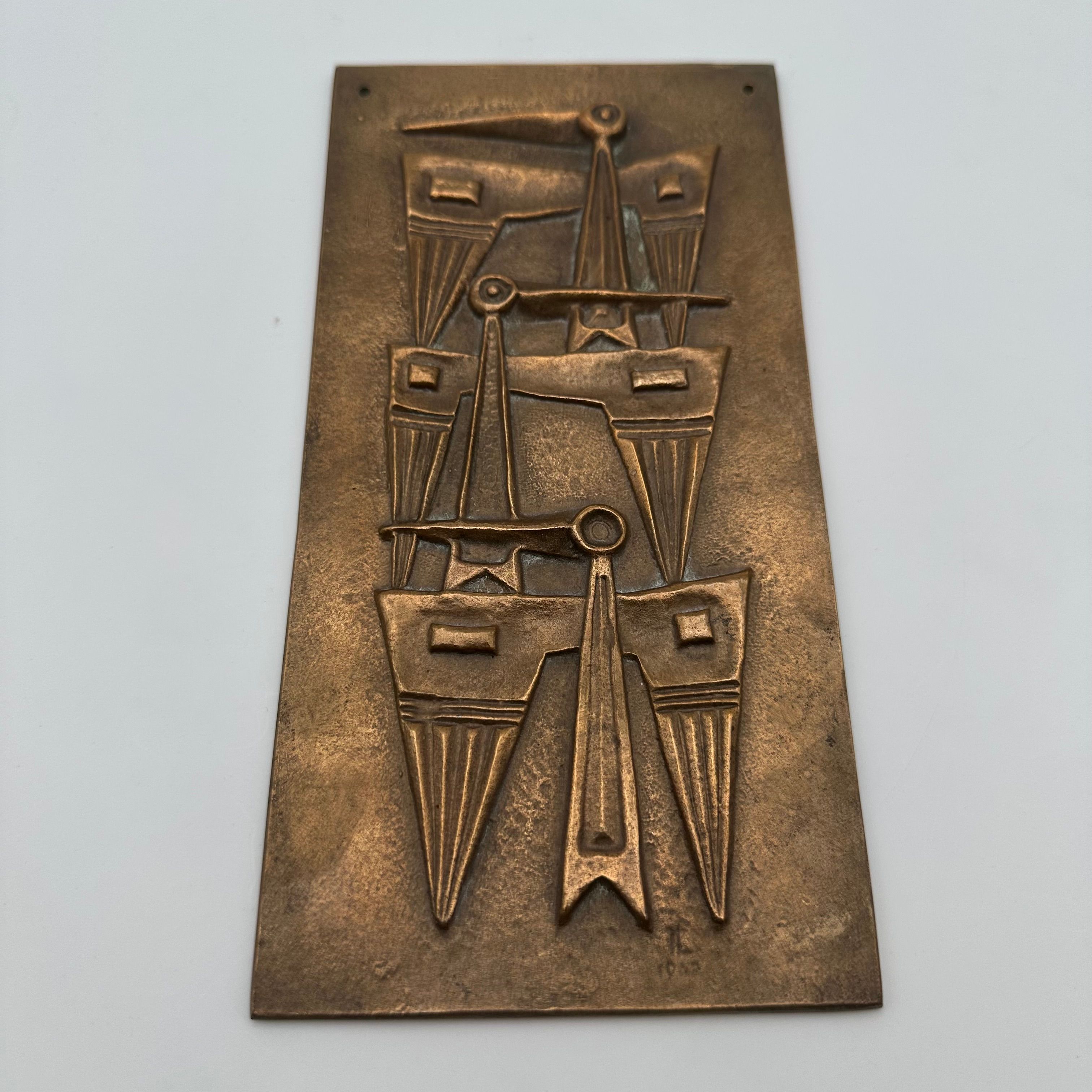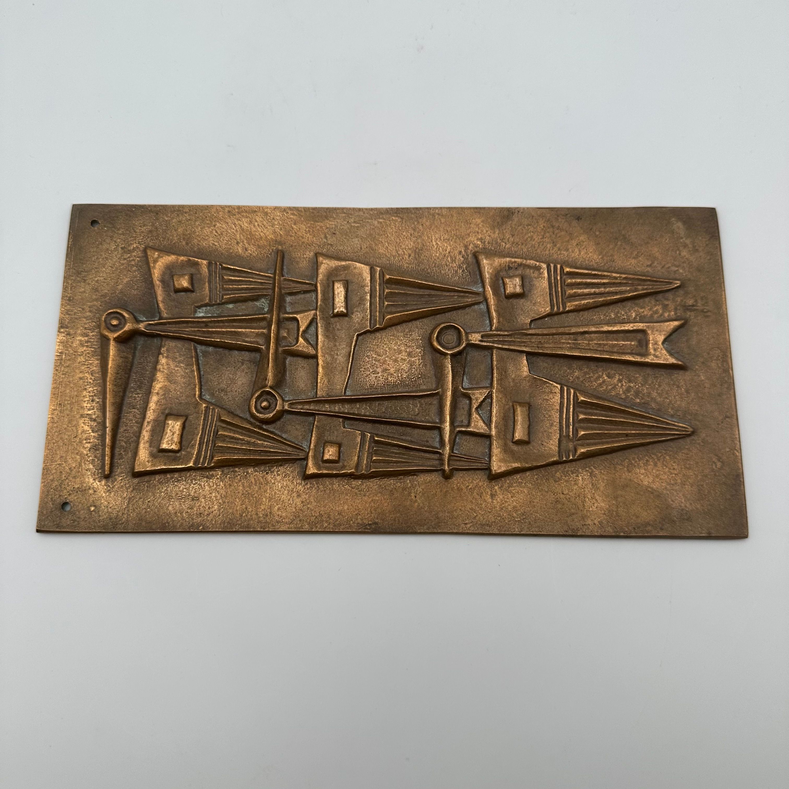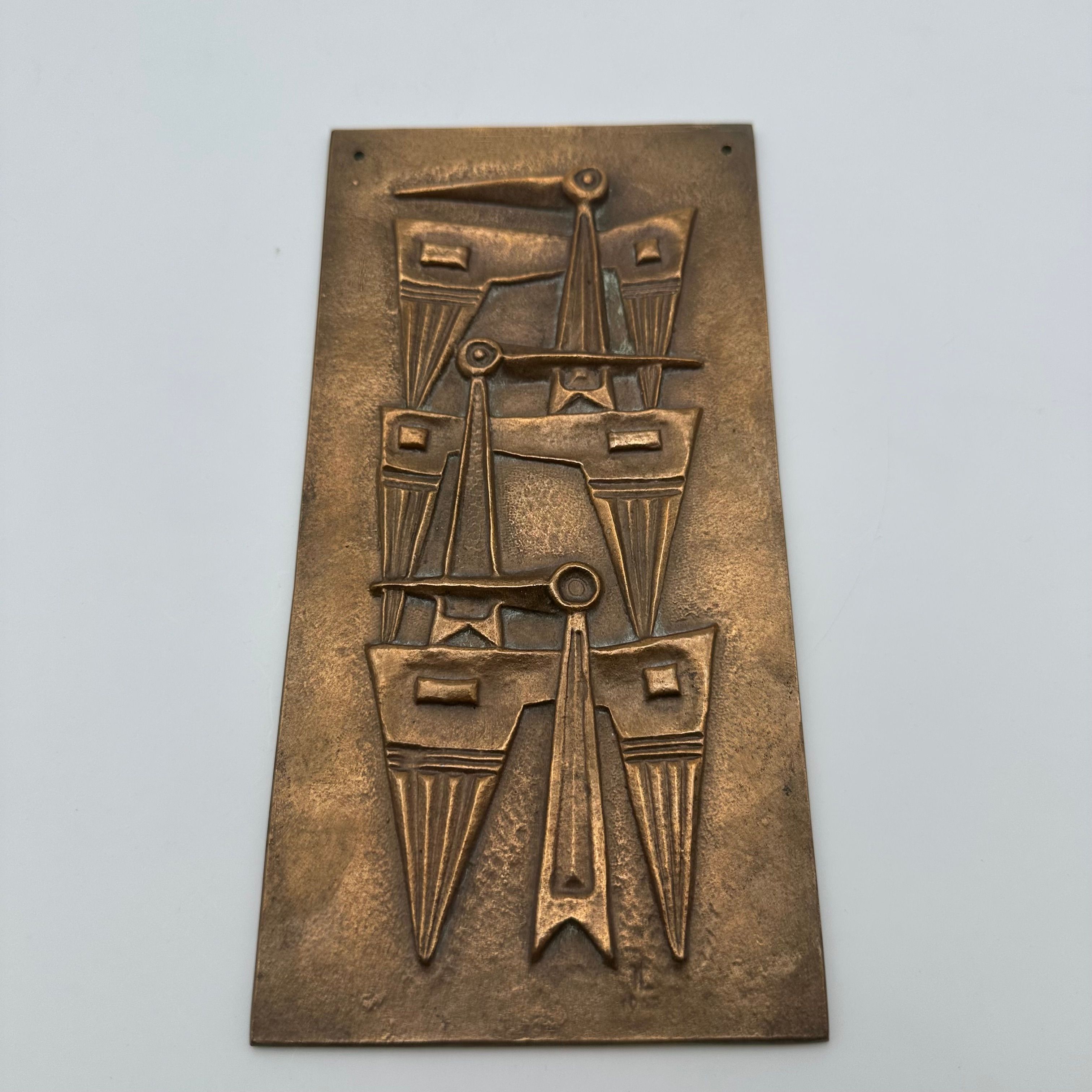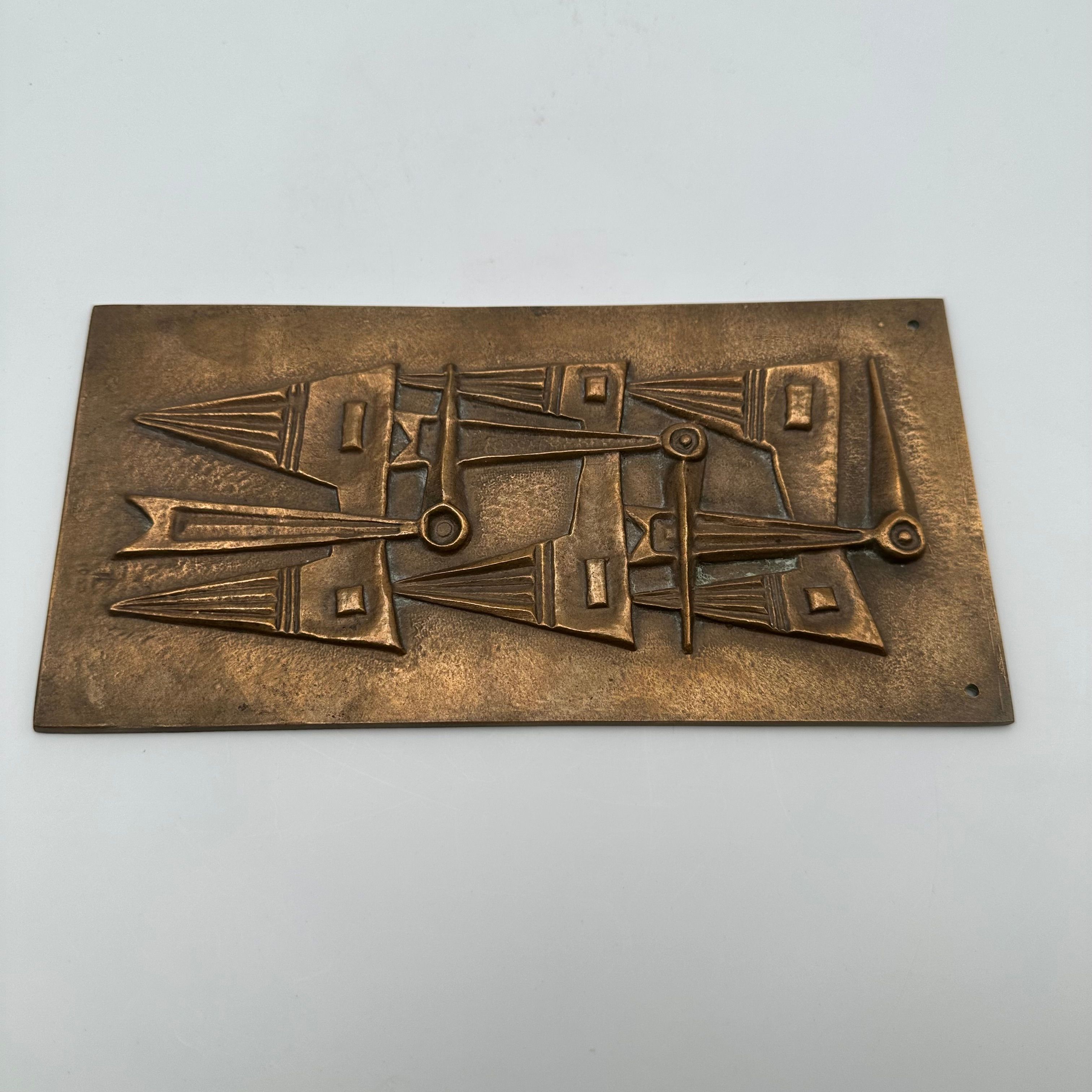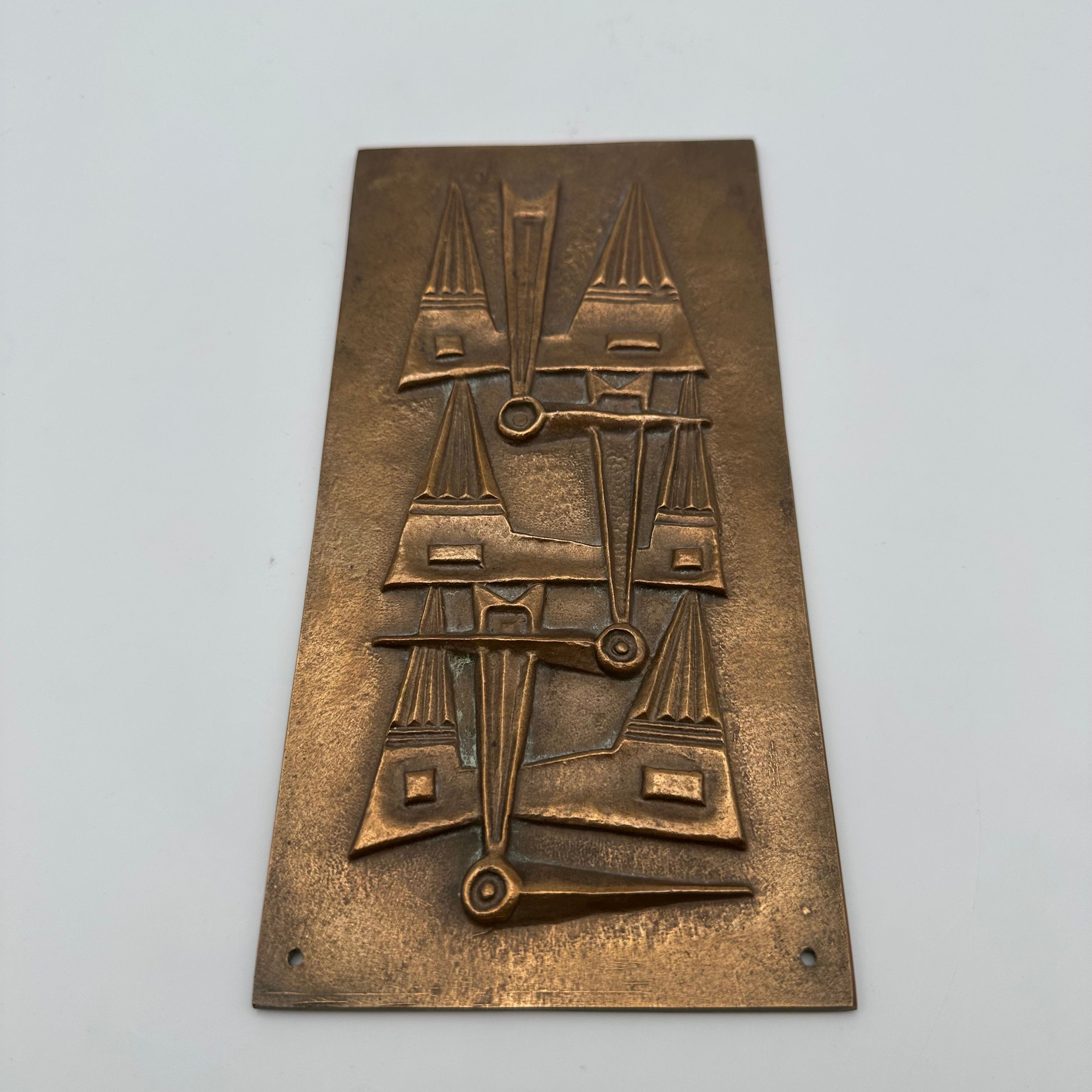 Patinated Bronze Wall Plaque featuring an abstract relief composition, evoking a stylized totemic motif. The vertically structured geometric design fully reflects the modernist and brutalist aesthetic of the second half of the 20th century.