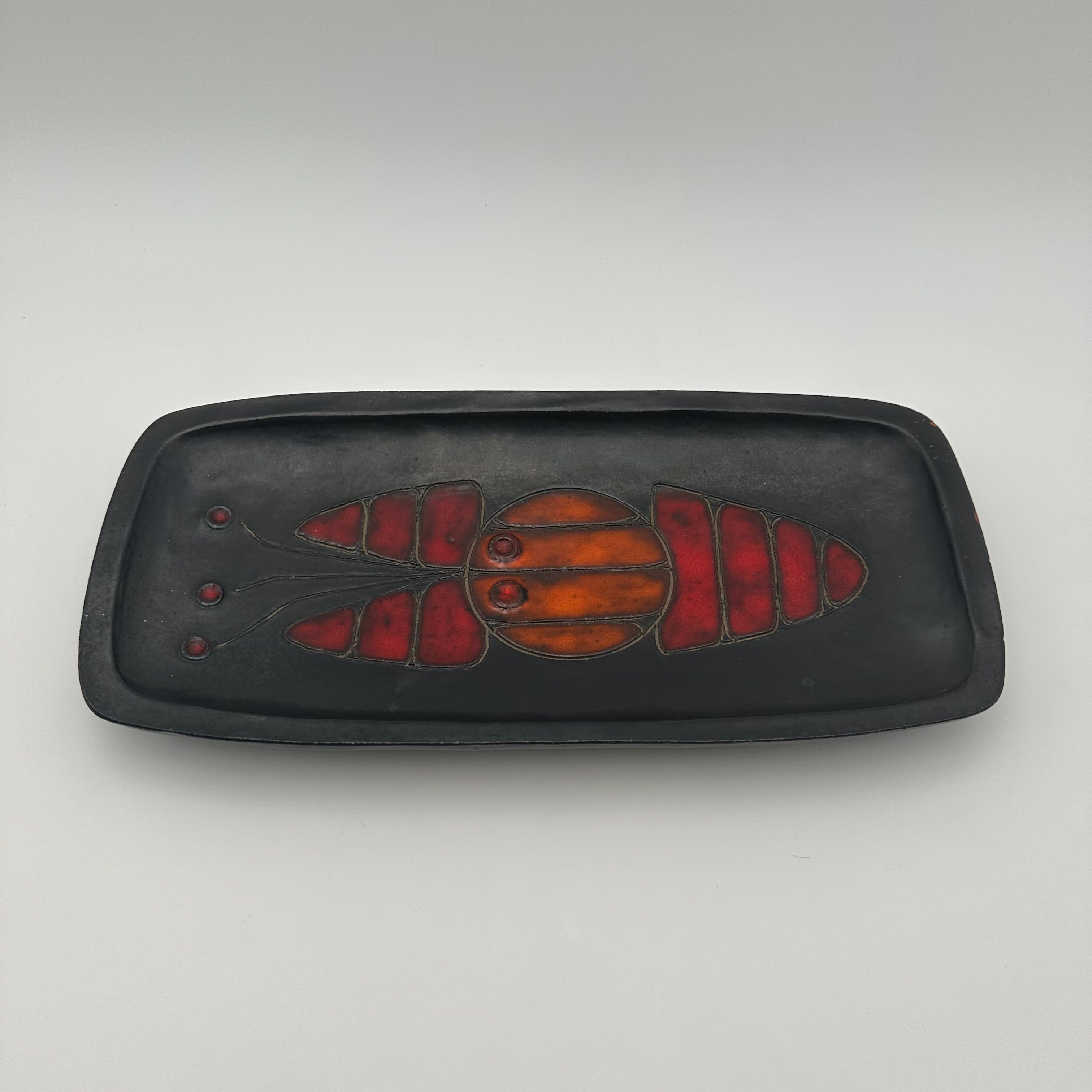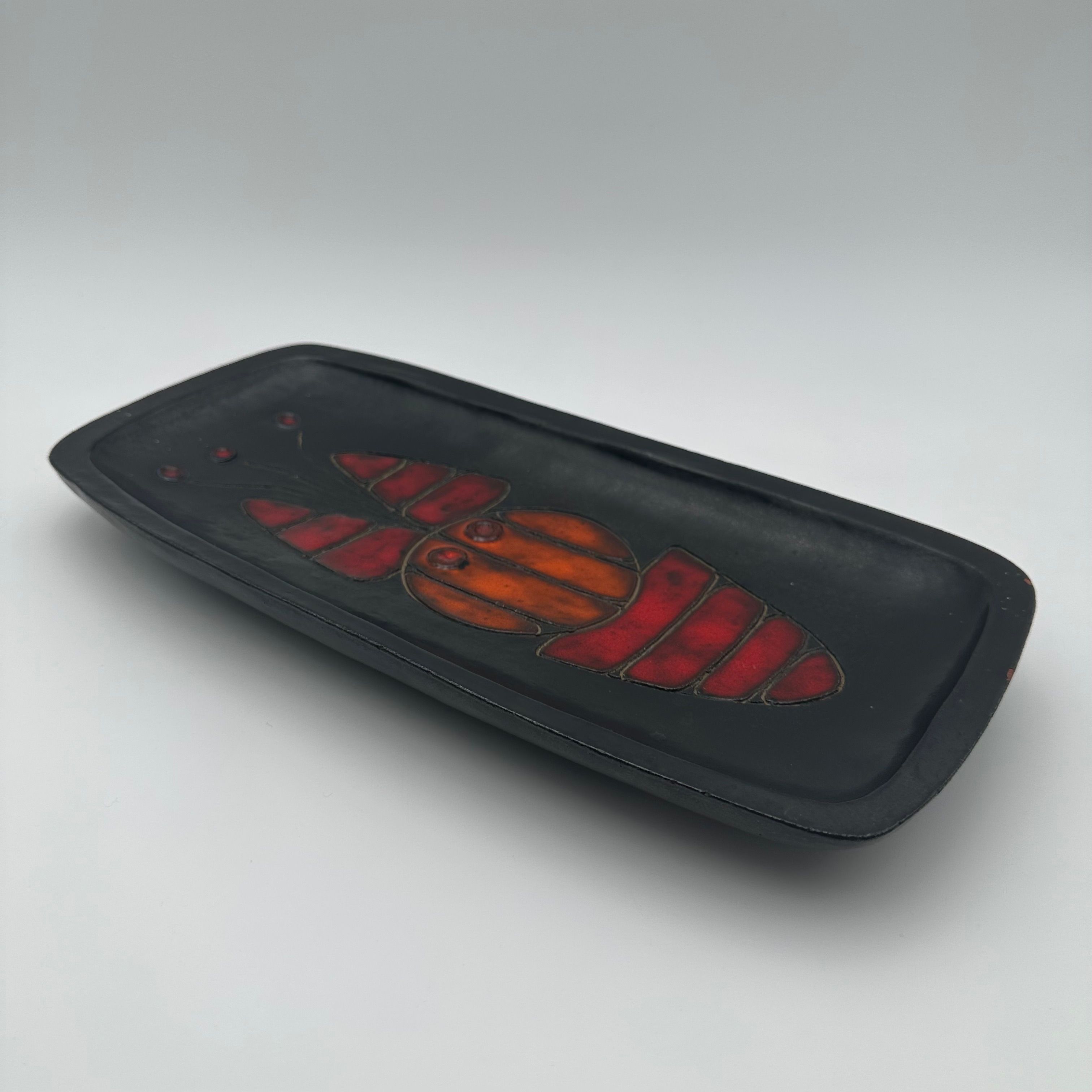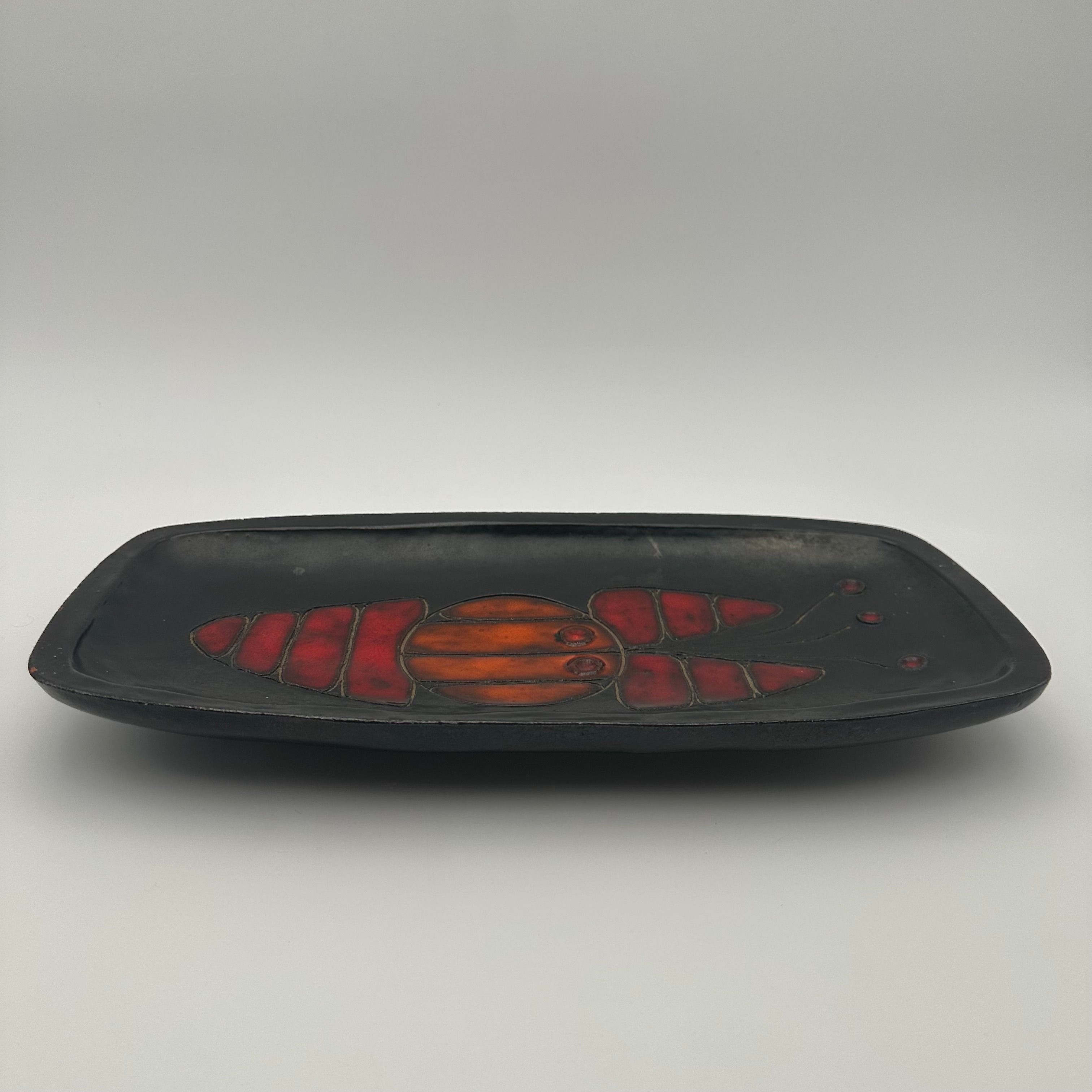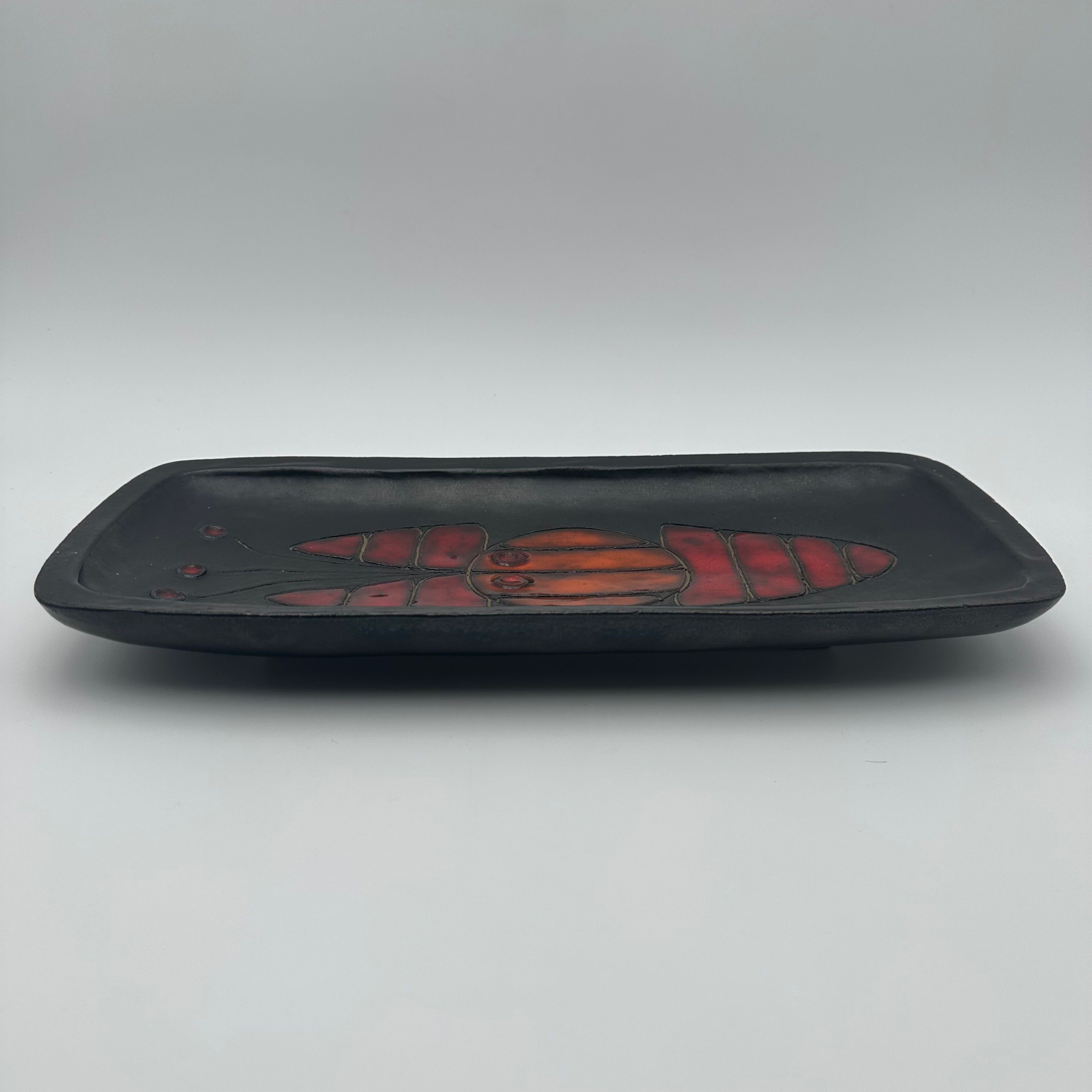Rectangular black ceramic dish, decorated with a stylized fish in orange and red tones. The design, rendered in a graphic and minimalist manner, belongs to the distinctive world of Oswald Tieberghien, a ceramist renowned for his modern compositions and richly glazed works.