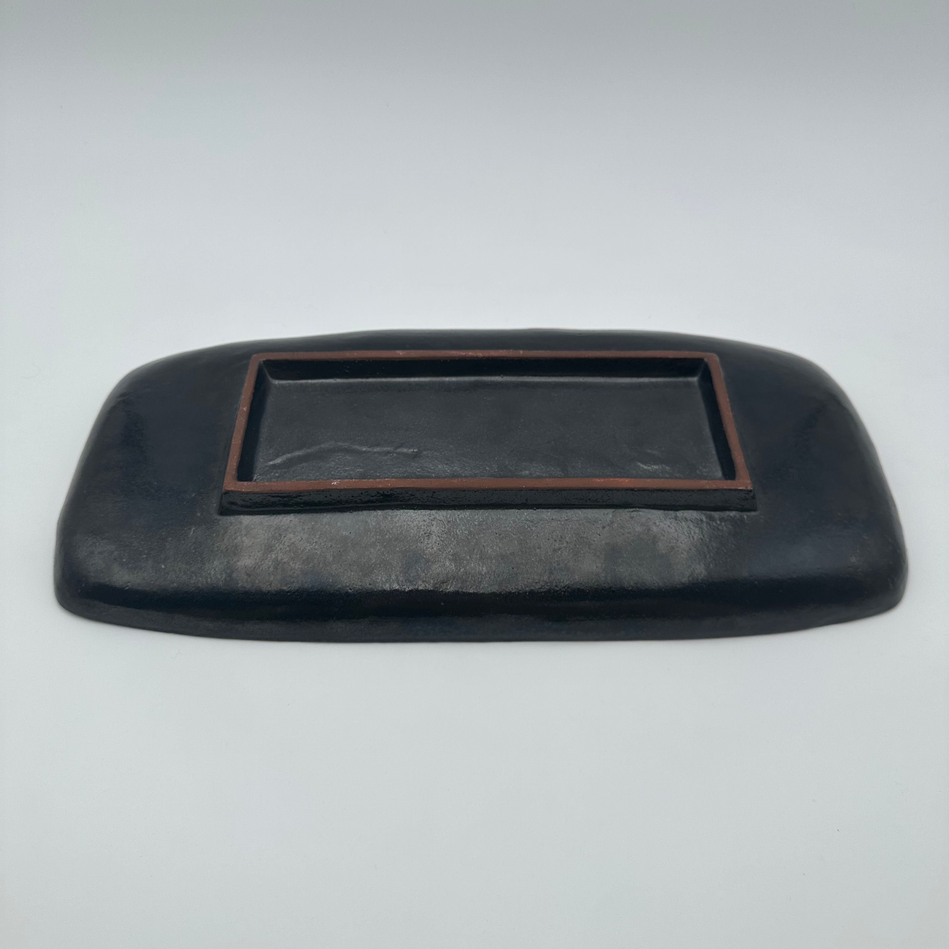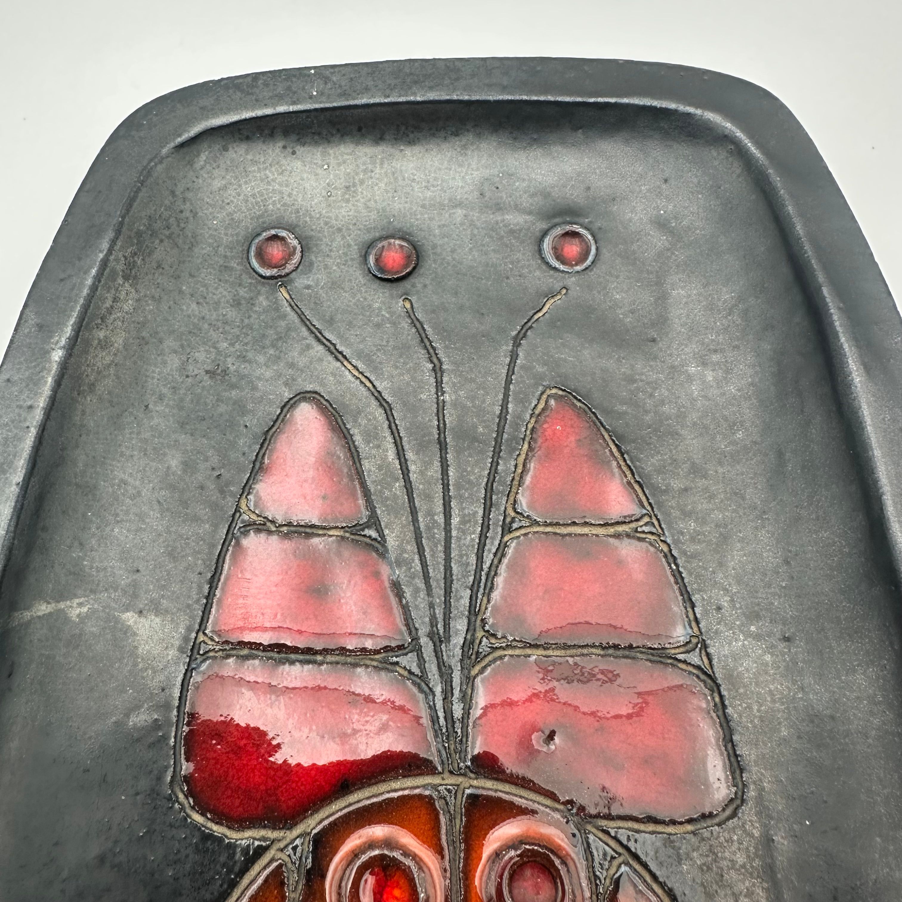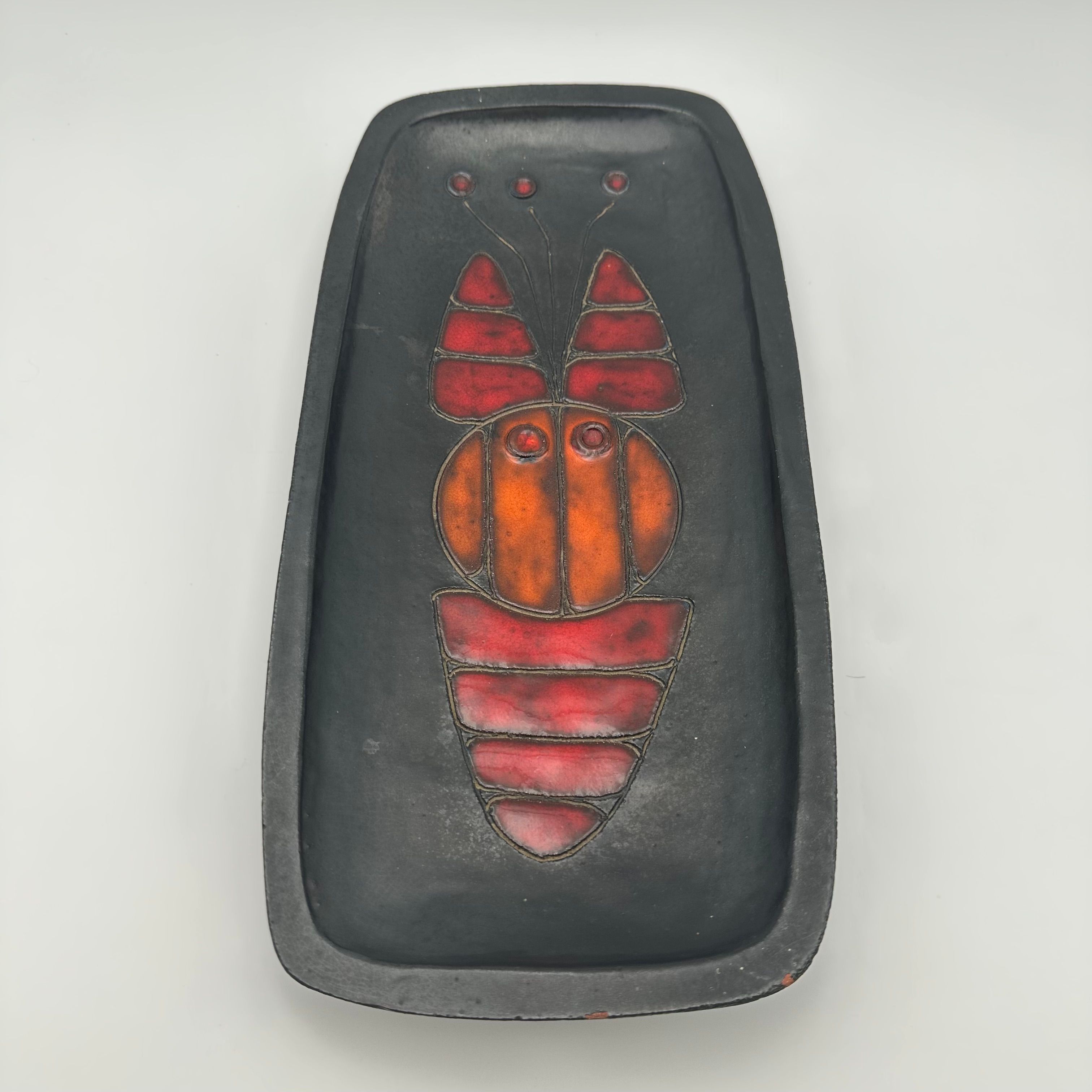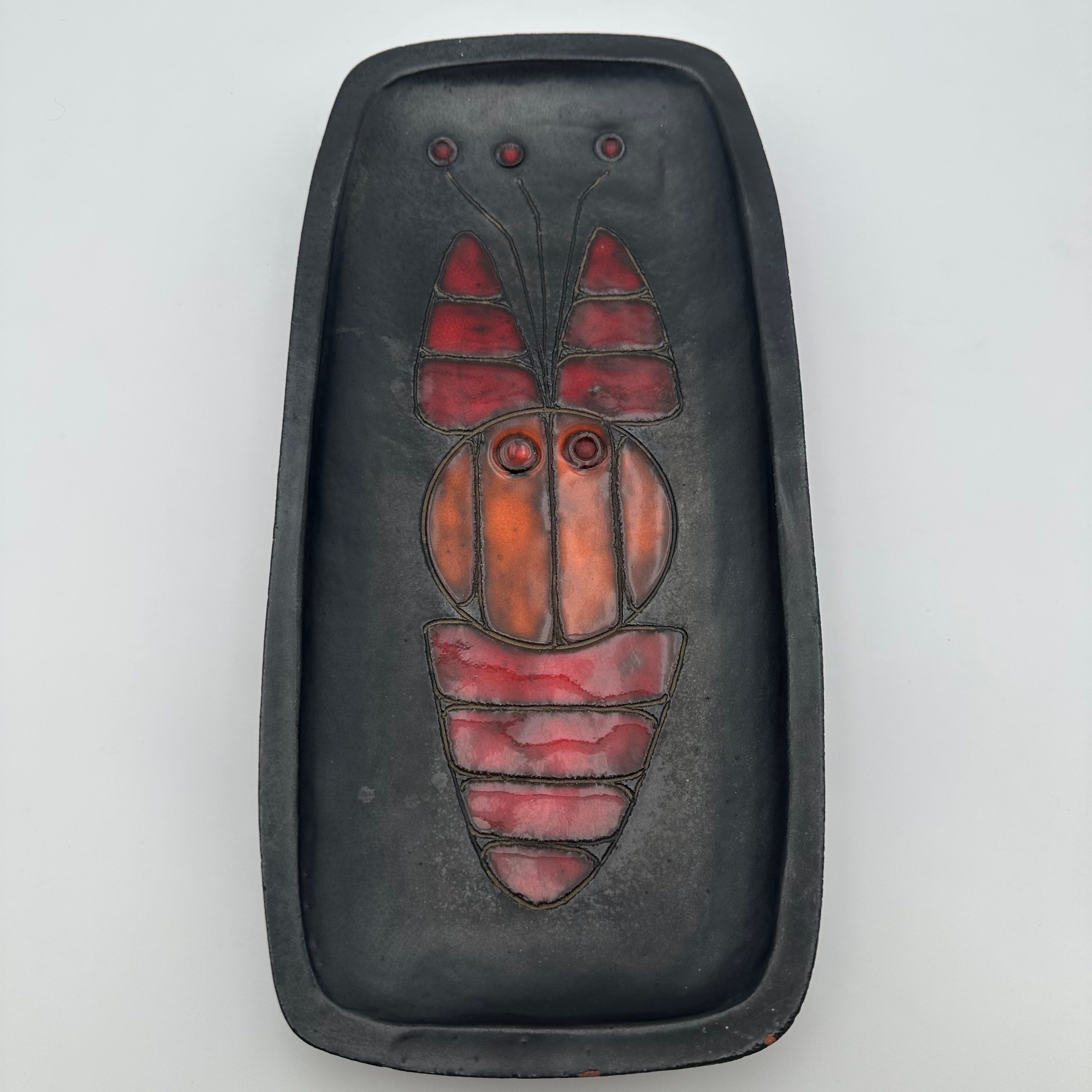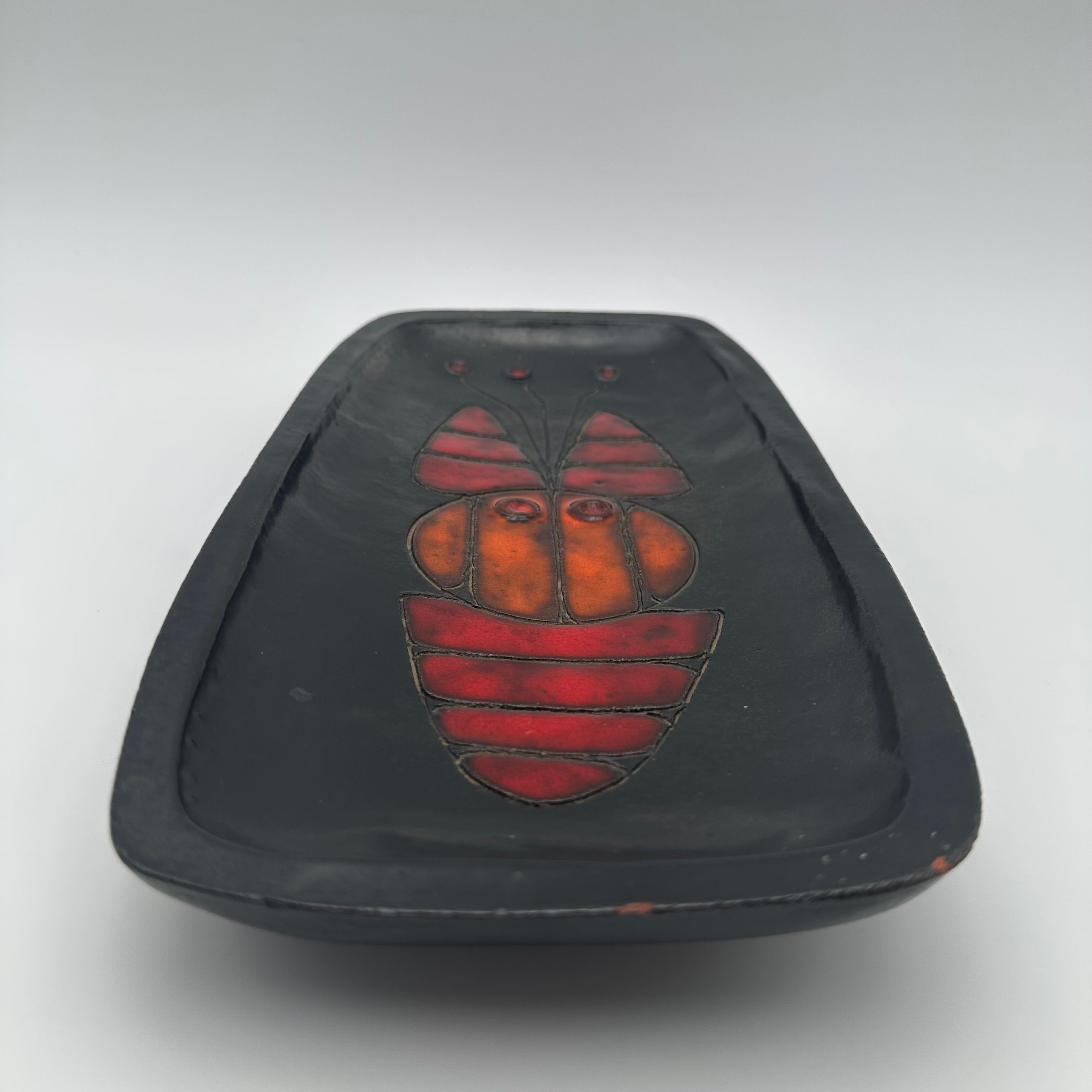 Rectangular black ceramic dish, decorated with a stylized fish in orange and red tones. The design, rendered in a graphic and minimalist manner, belongs to the distinctive world of Oswald Tieberghien, a ceramist renowned for his modern compositions and richly glazed works.