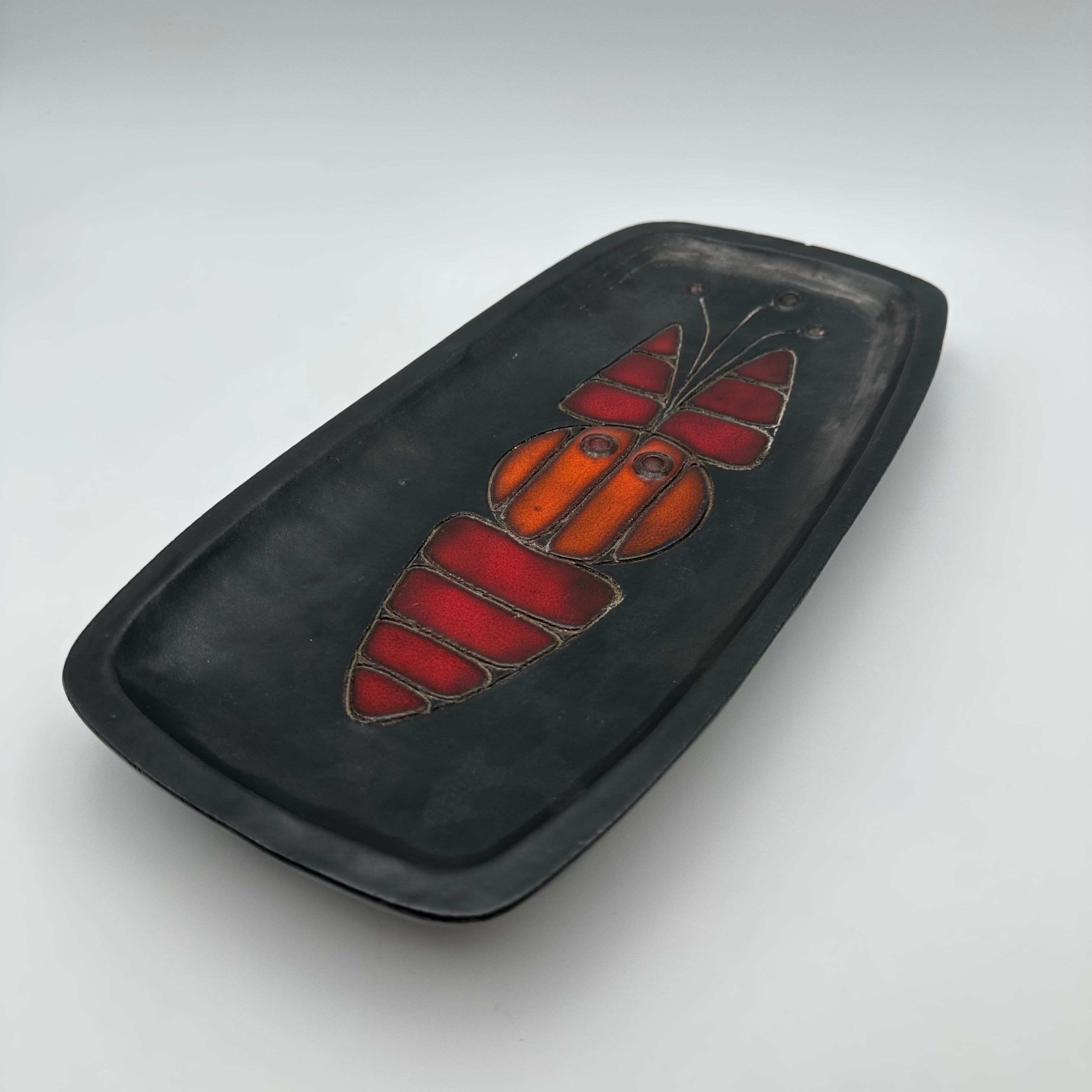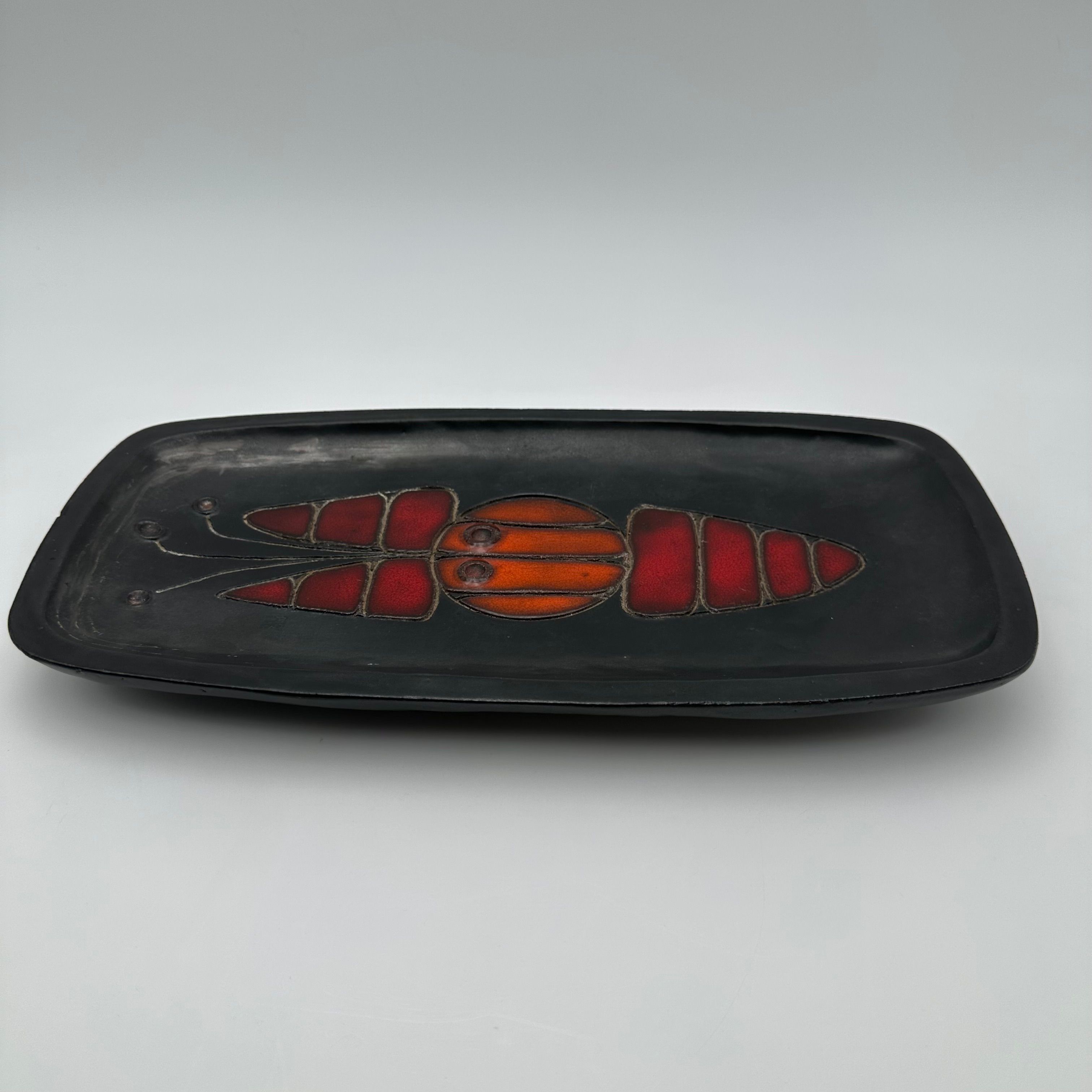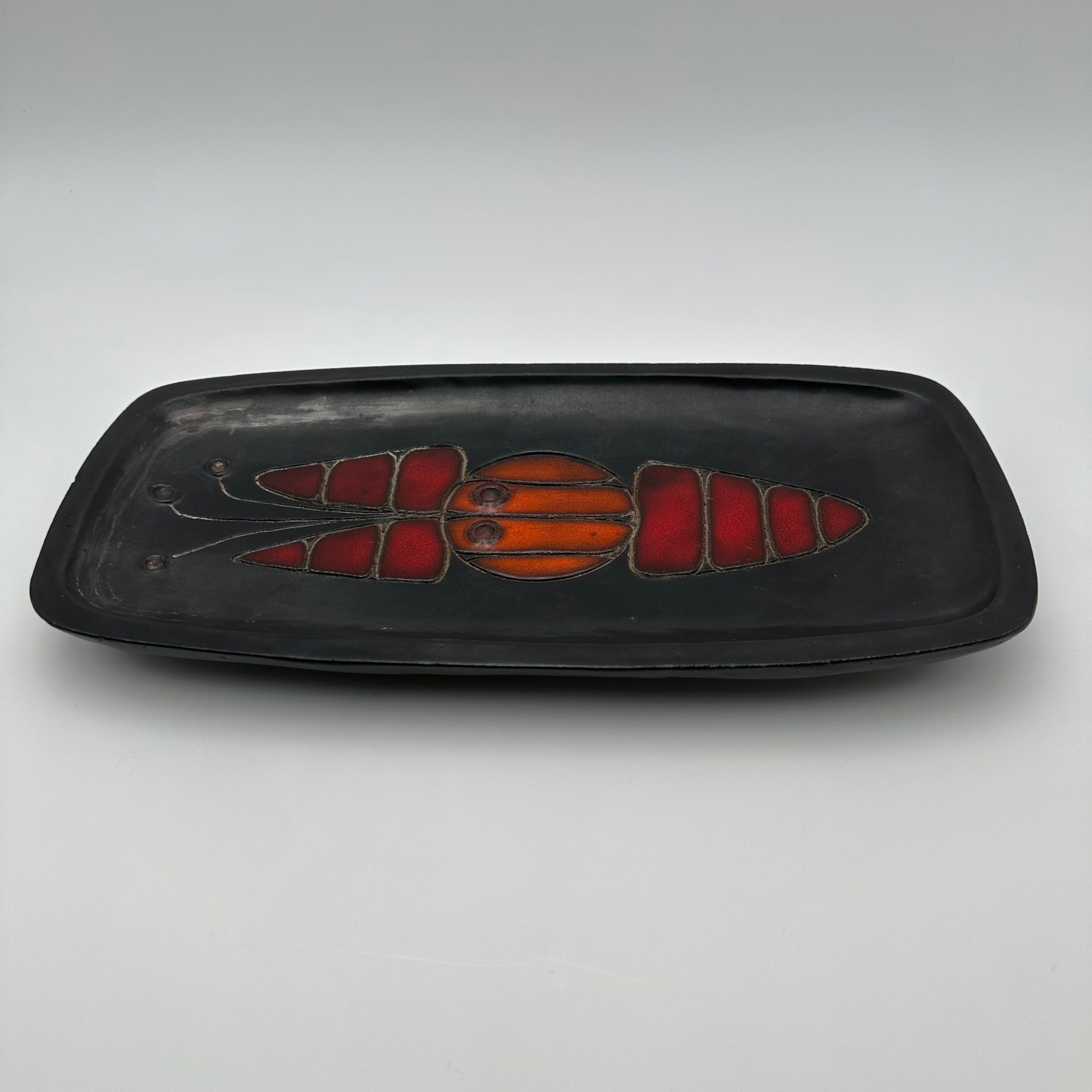 Rectangular black ceramic dish, decorated with a stylized fish in orange and red tones. The design, rendered in a graphic and minimalist manner, belongs to the distinctive world of Oswald Tieberghien, a ceramist renowned for his modern compositions and richly glazed works.