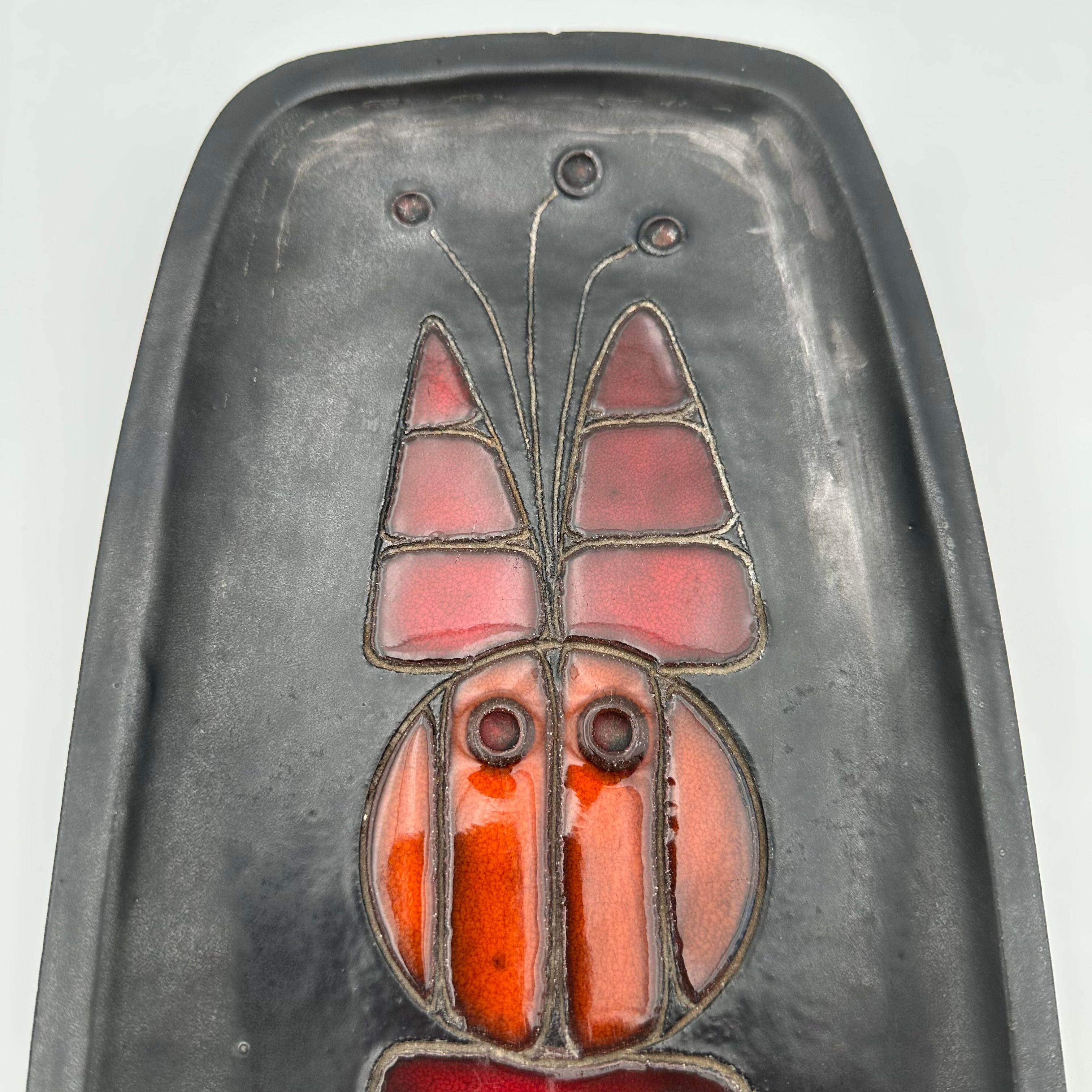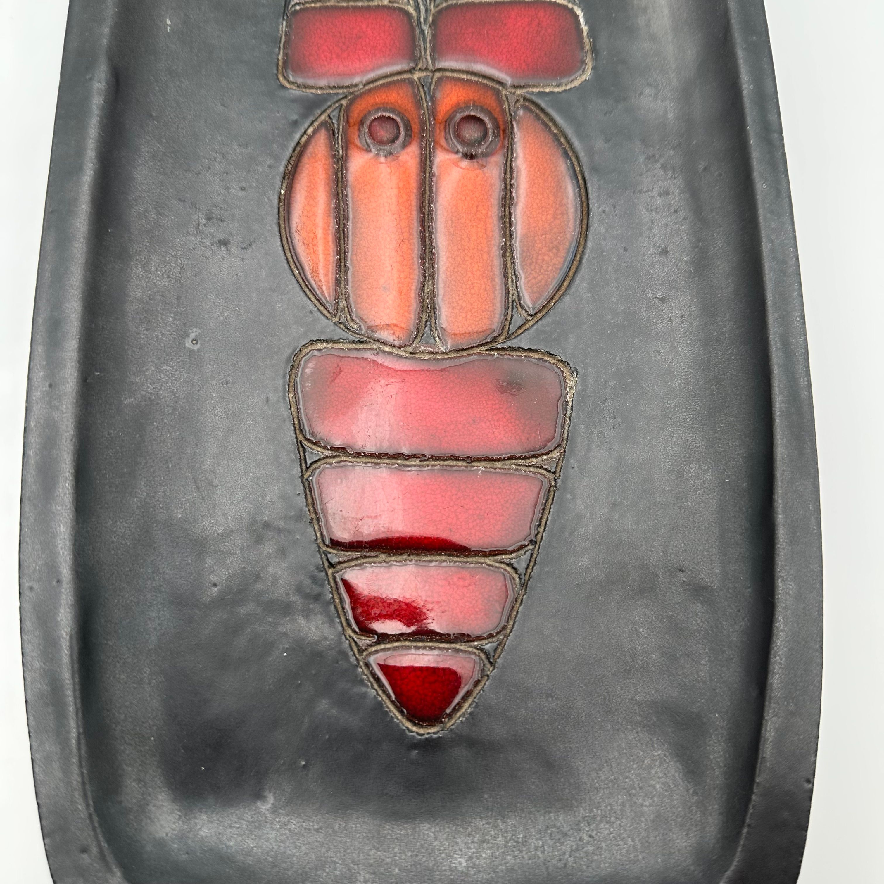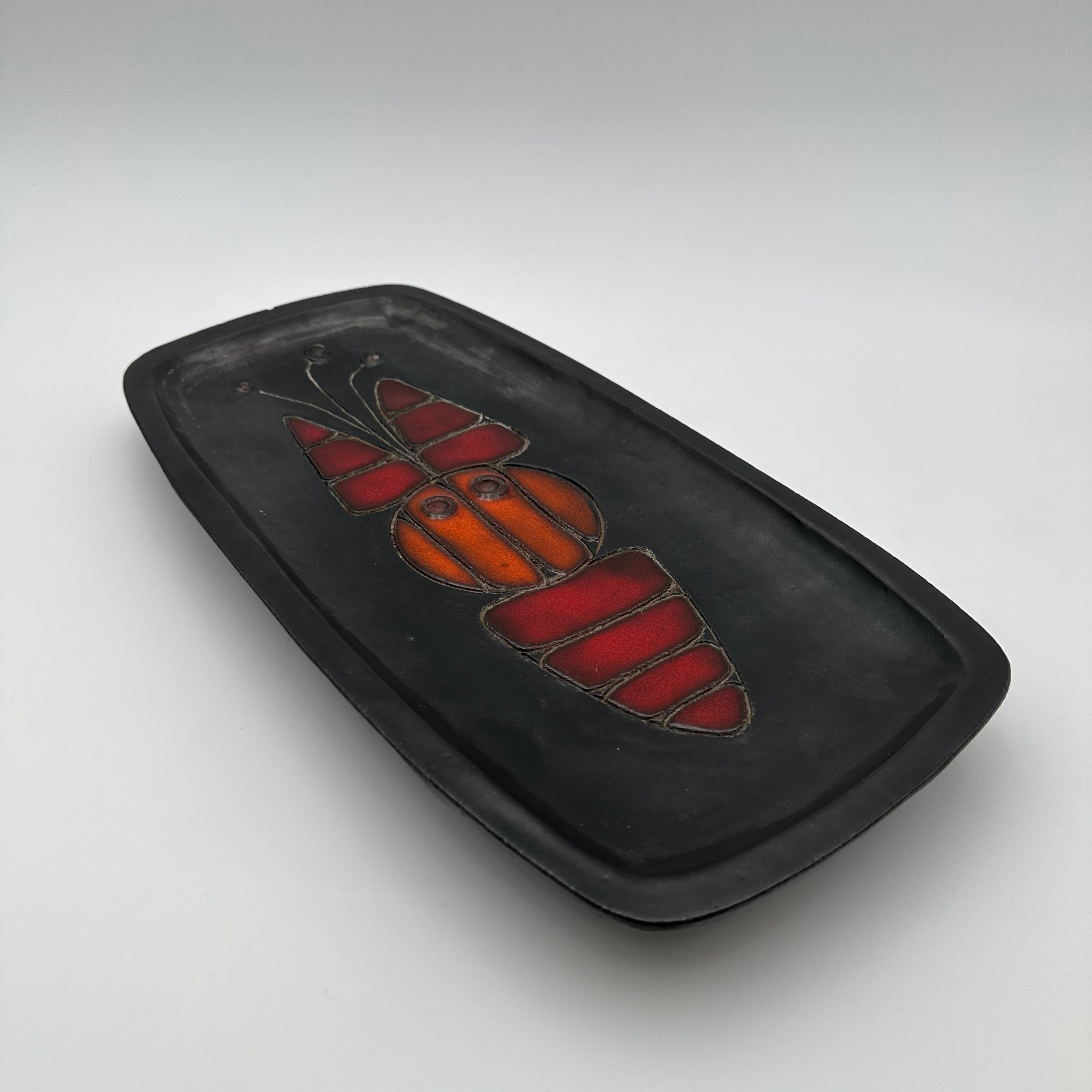 Rectangular black ceramic dish, decorated with a stylized fish in orange and red tones. The design, rendered in a graphic and minimalist manner, belongs to the distinctive world of Oswald Tieberghien, a ceramist renowned for his modern compositions and richly glazed works.