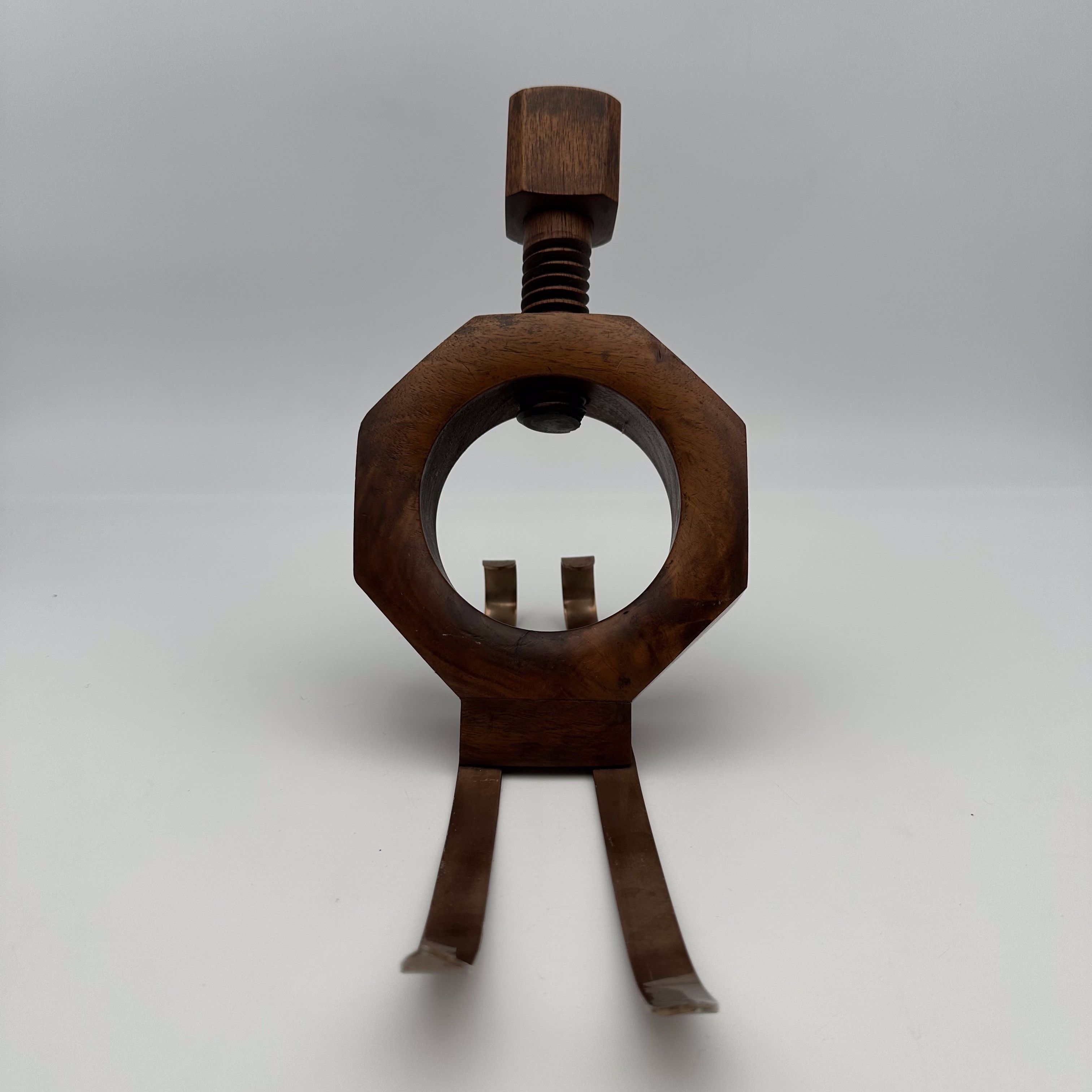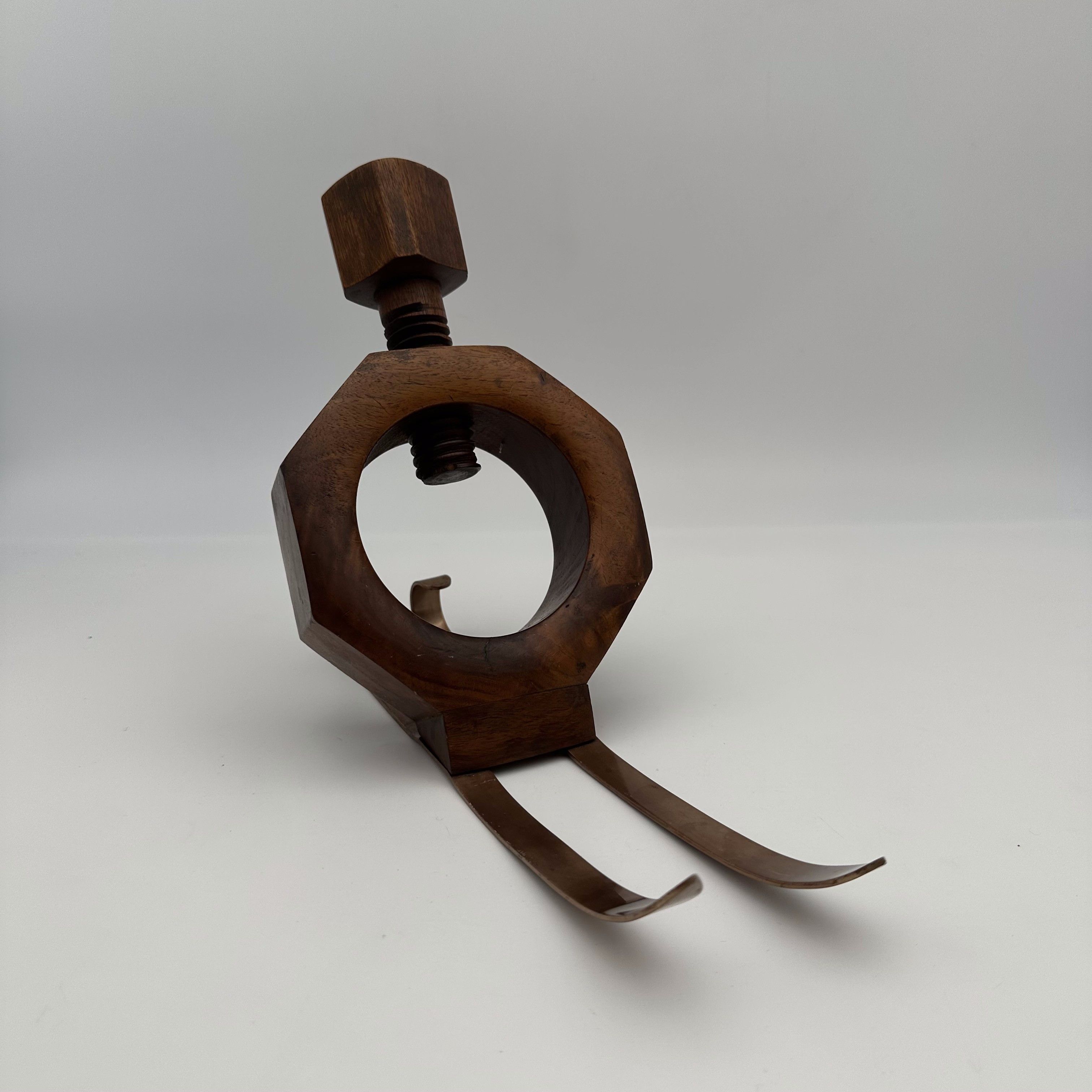 This astonishing bottle holder is a perfect testament to the playful and quirky spirit of 1970s design. Borrowing both from the Pop Art movement (with its concept of an oversized industrial object) and the 'Chalet' style, this transformation of a giant nut into a bar accessory is as amusing as it is aesthetic. Measuring 30 cm in length, the object stands out with its meticulously turned wood craftsmanship. The main body takes the shape of a large hexagonal nut pierced by a fully functional threaded wooden bolt. This ingenious mechanism clamps down on the neck of a wine bottle. The entire piece rests and finds its perfect balance on two beautiful blades of curved metal (brass or copper) reminiscent of old alpine skis. The warm grain of the wood contrasts beautifully with the patina of the metal. Offered in very good vintage condition, this unusual bar accessory boasts a warm patina. It is an ideal curiosity piece to enliven a dining table, decorate a 'mountain cabin' inspired interior, or offer as a unique and sophisticated gift to a wine enthusiast.