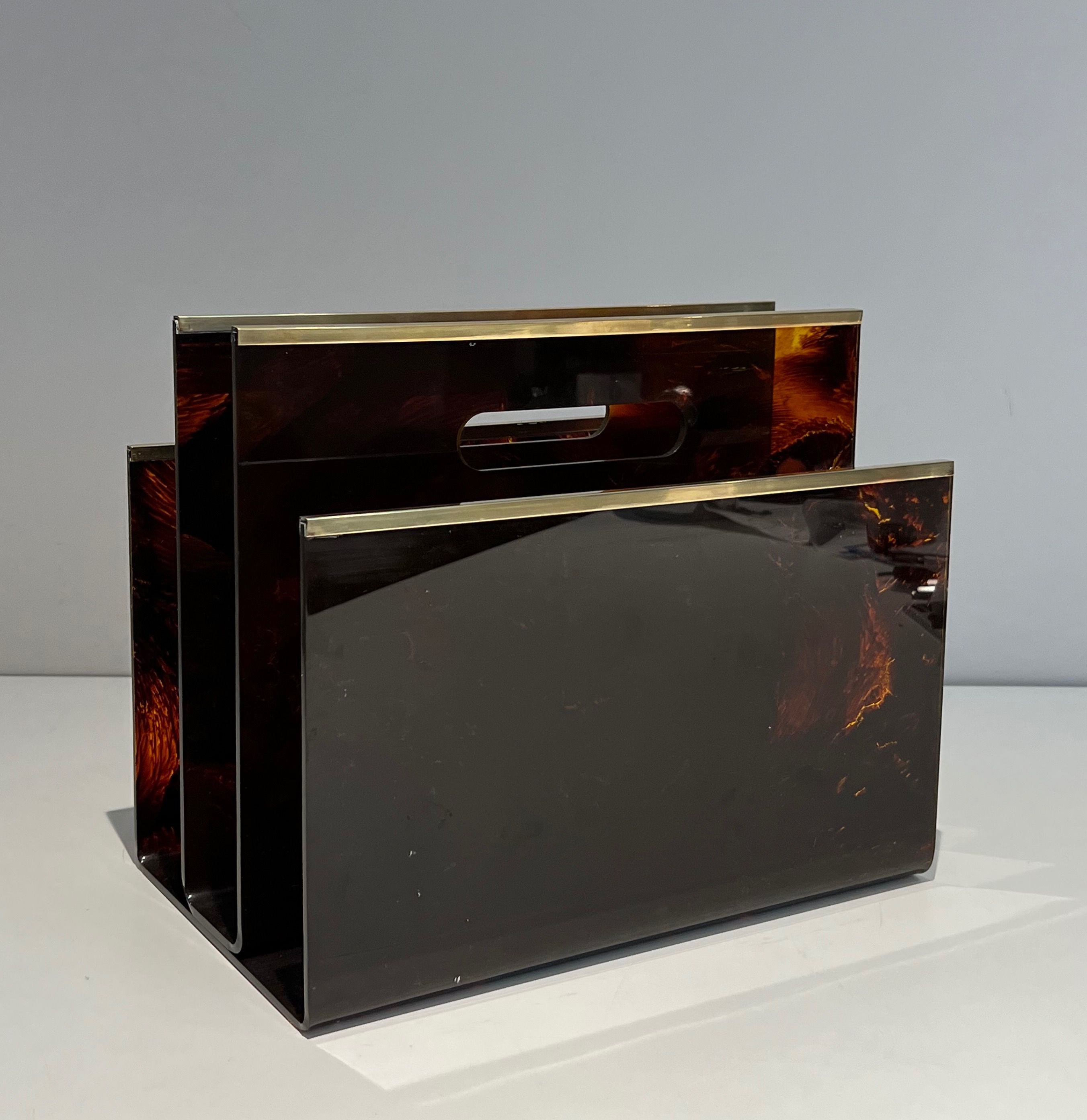 Faux-Tortoise Shell Plexiglass and Brass Magazine RackFaux-tortoise shell plexiglass and brass magazine rack. French Work. Circa 1970Request priceDimensionsWidth12.8 inch32.5 cmDepth7.87 inch20 cmHeight10.63 inch27 cmInformationProduct code50's-53491