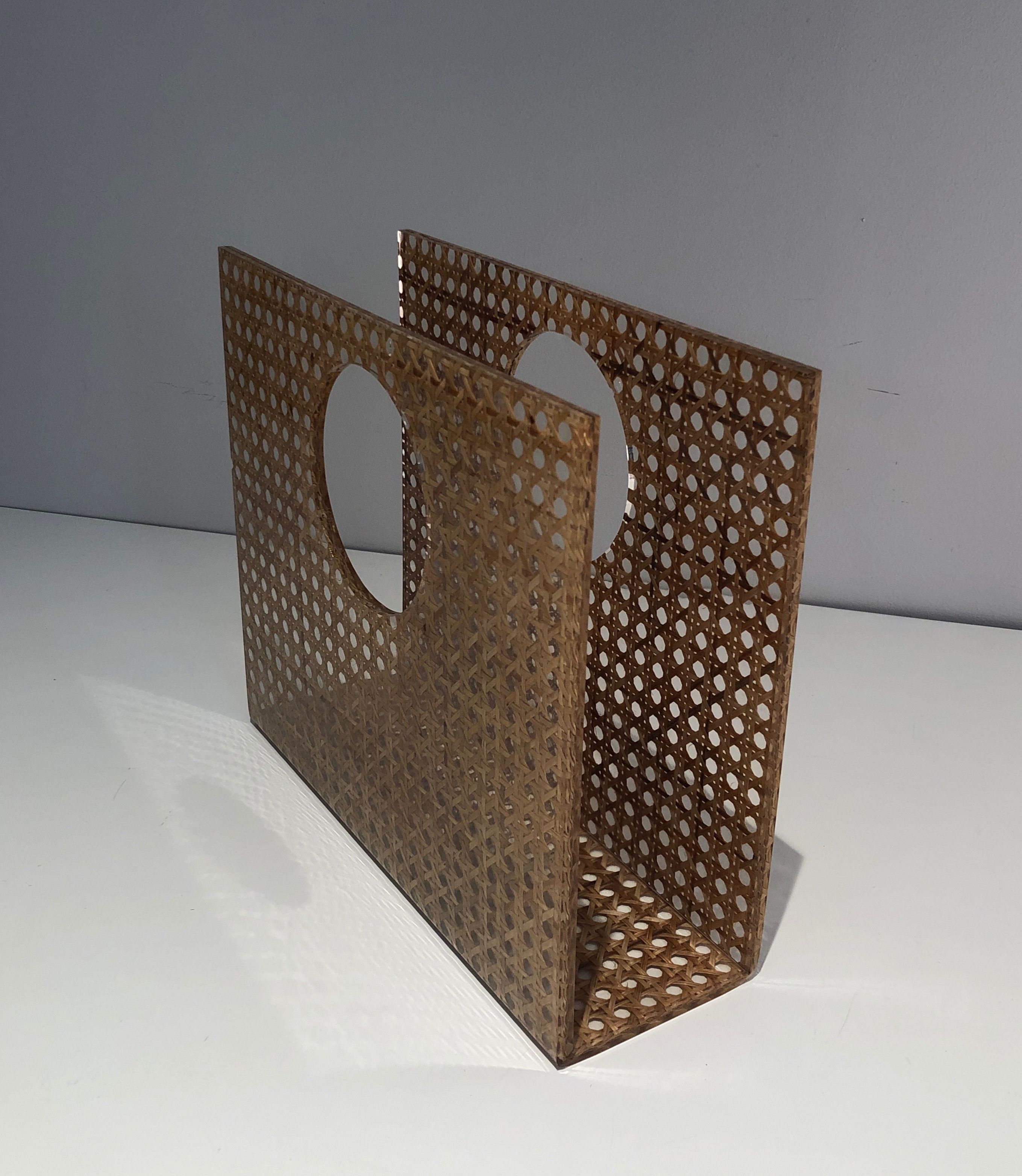 Lucite, brass and encrusted cane magazine rack. French work in the style of Christian Dior and Gabriella Crespi. Circa 1970