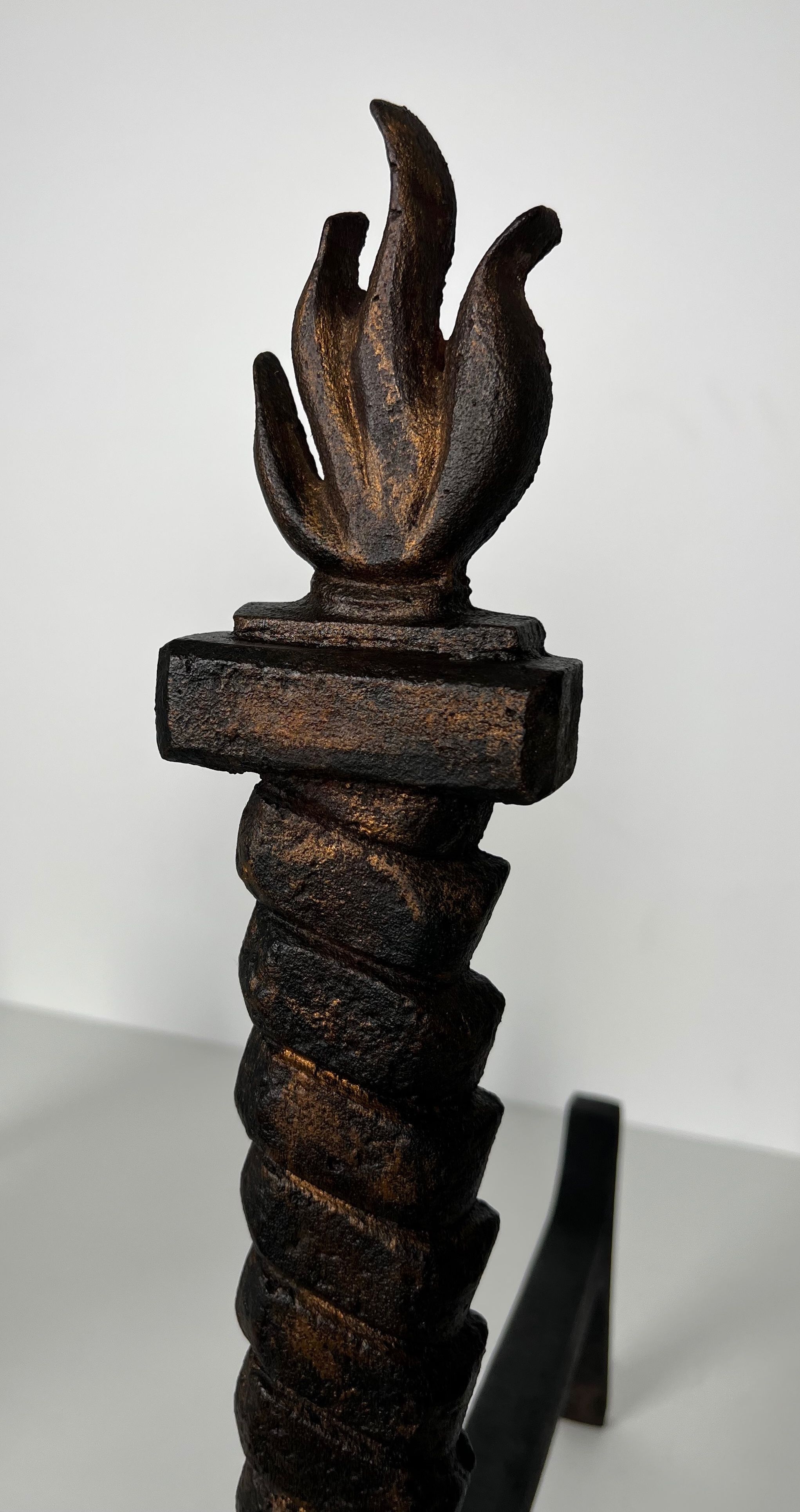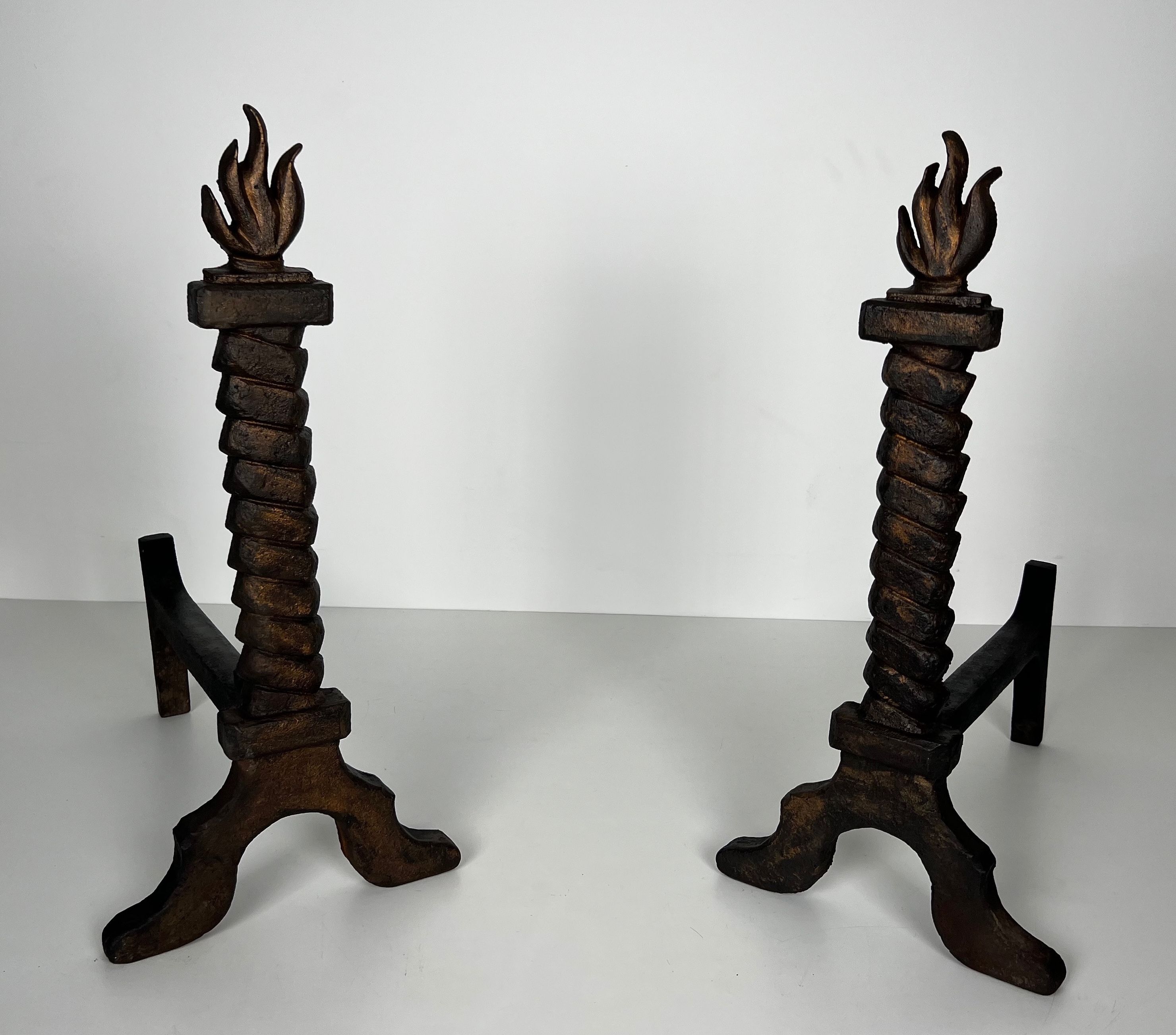 Rare Pair of Flame Gilt Cast and Wrought Iron Andirons in the Style of Gilbert Poillerat