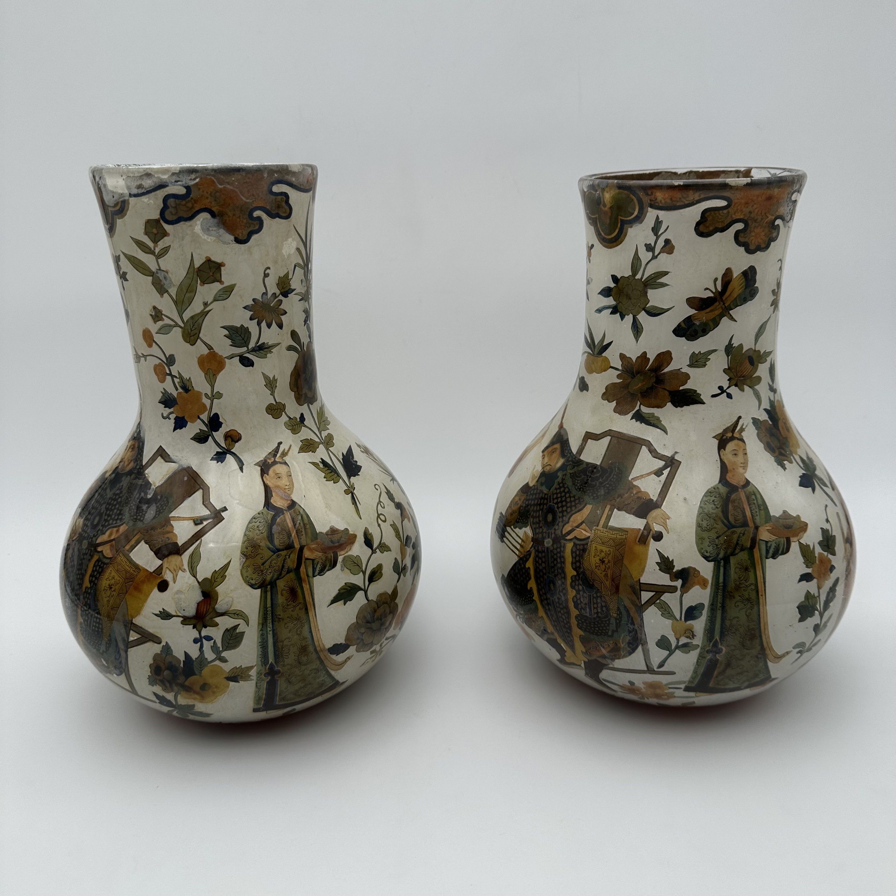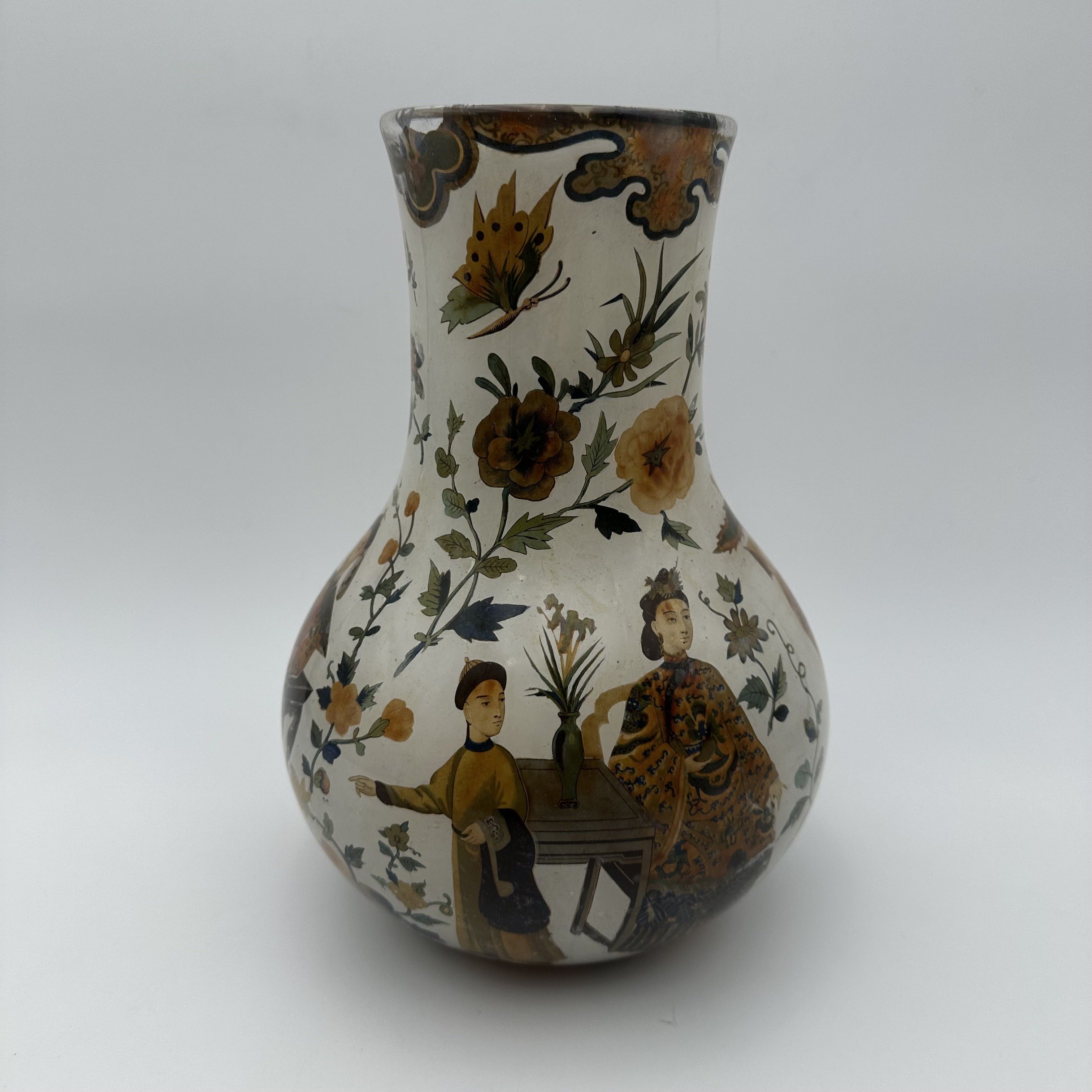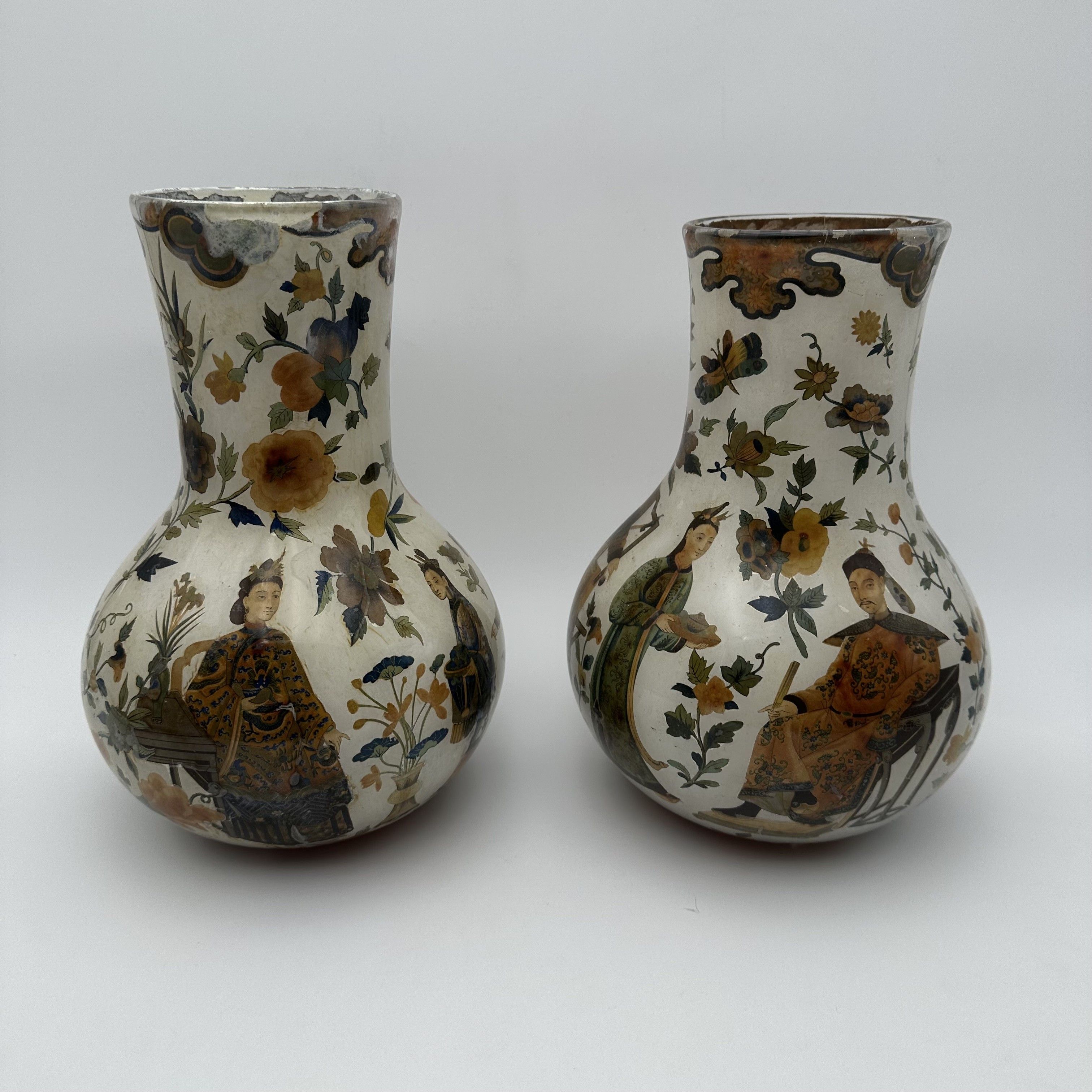 This fascinating pair of vases brilliantly illustrates the ingenuity and refinement of 18th-century Italian decorative arts. Made in the Piedmont region, these objects utilize the complex technique of Arte Povera (or lacca povera). To counter the exorbitant cost of imported Far Eastern porcelain, Italian craftsmen cut out fine paper engravings, meticulously applied them face-down to the inside of a glass vessel, and then backed the entire interior with a layer of white paint. The illusion of hand-painted Asian porcelain was perfect, creating objects of singular charm that have today become museum-quality rarities. Standing 29.5 cm tall with a generous bulbous body of 22 cm in diameter, these vases adopt an elegant baluster shape with a flared neck. The decor, deeply rooted in the 18th-century taste for exoticism, abounds in 'Chinoiserie' motifs. It reveals a gallery of fascinating Oriental figures—armored warriors holding bows, scholarly dignitaries, and young women in flowing robes—set amidst a scattering of peonies, flowering branches, and delicate butterflies. Stylized lambrequin friezes highlight the rims. Offered in their authentic, untouched condition, this pair—over two hundred and fifty years old—shows expected wear and areas of paint loss on the inside of the glass (more pronounced on the neck of one vase). These alterations of time, inherent to the great fragility of this technique, testify to the absolute authenticity of the work. These are moving collector's pieces, ideal for enriching a cabinet of curiosities or displaying on a fine period commode.
