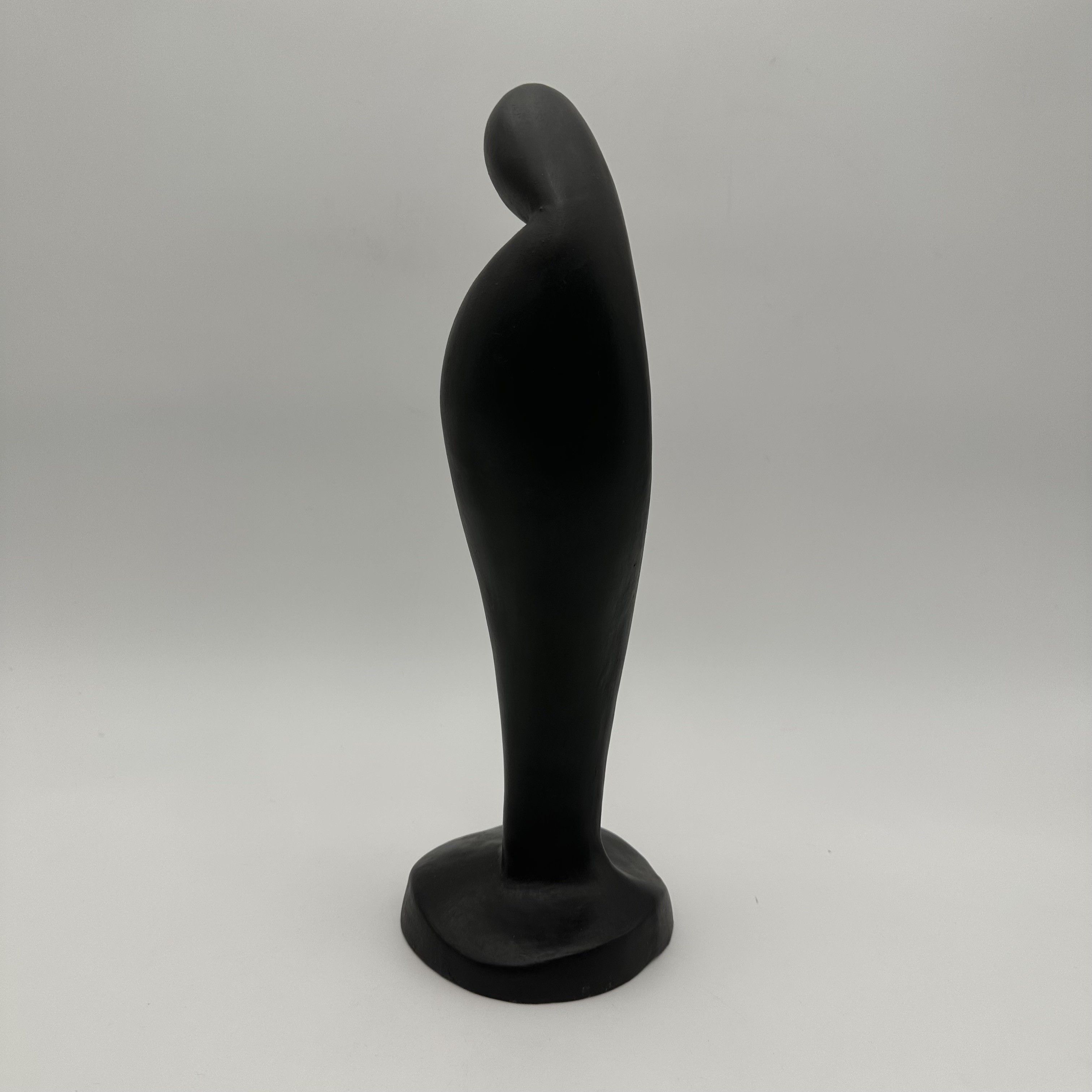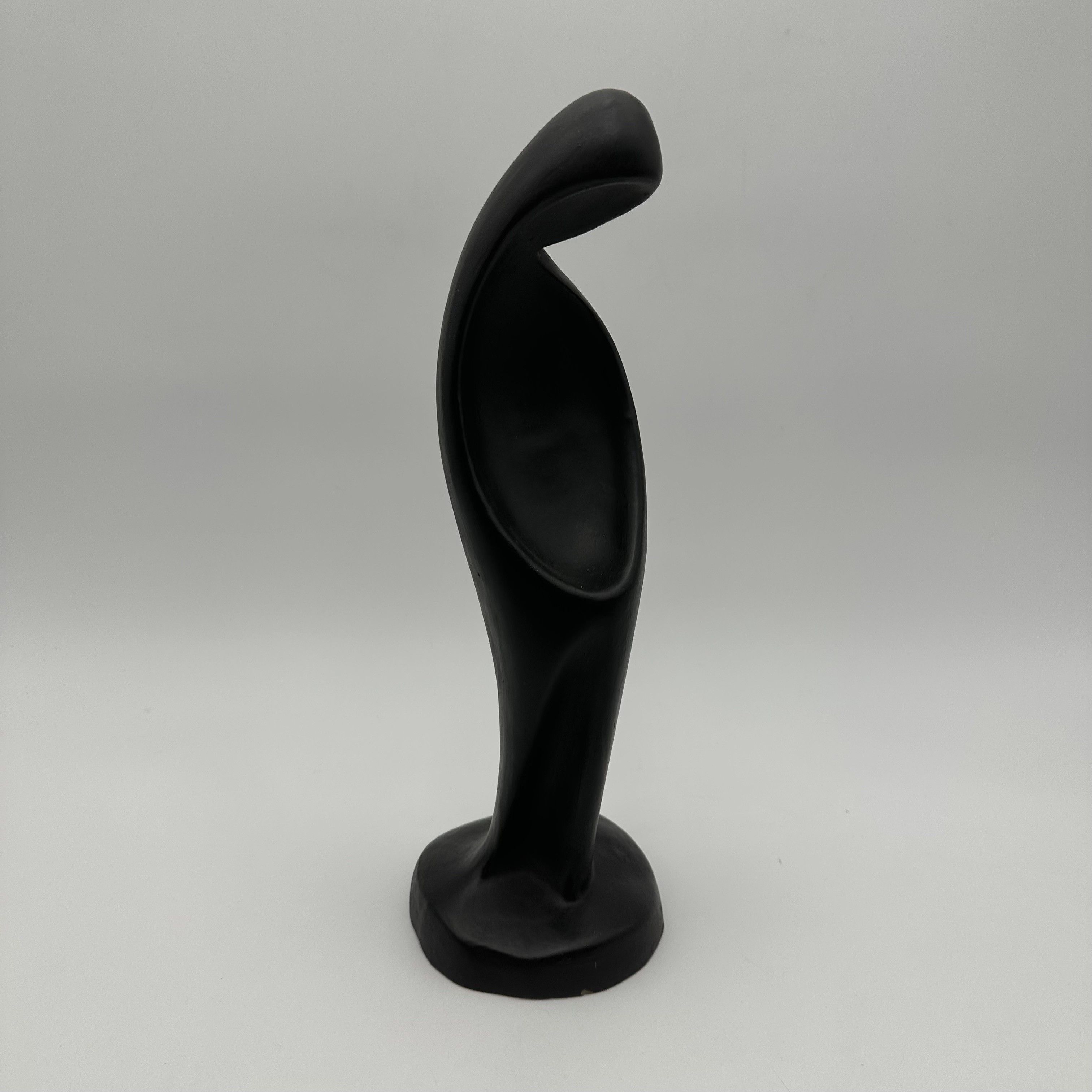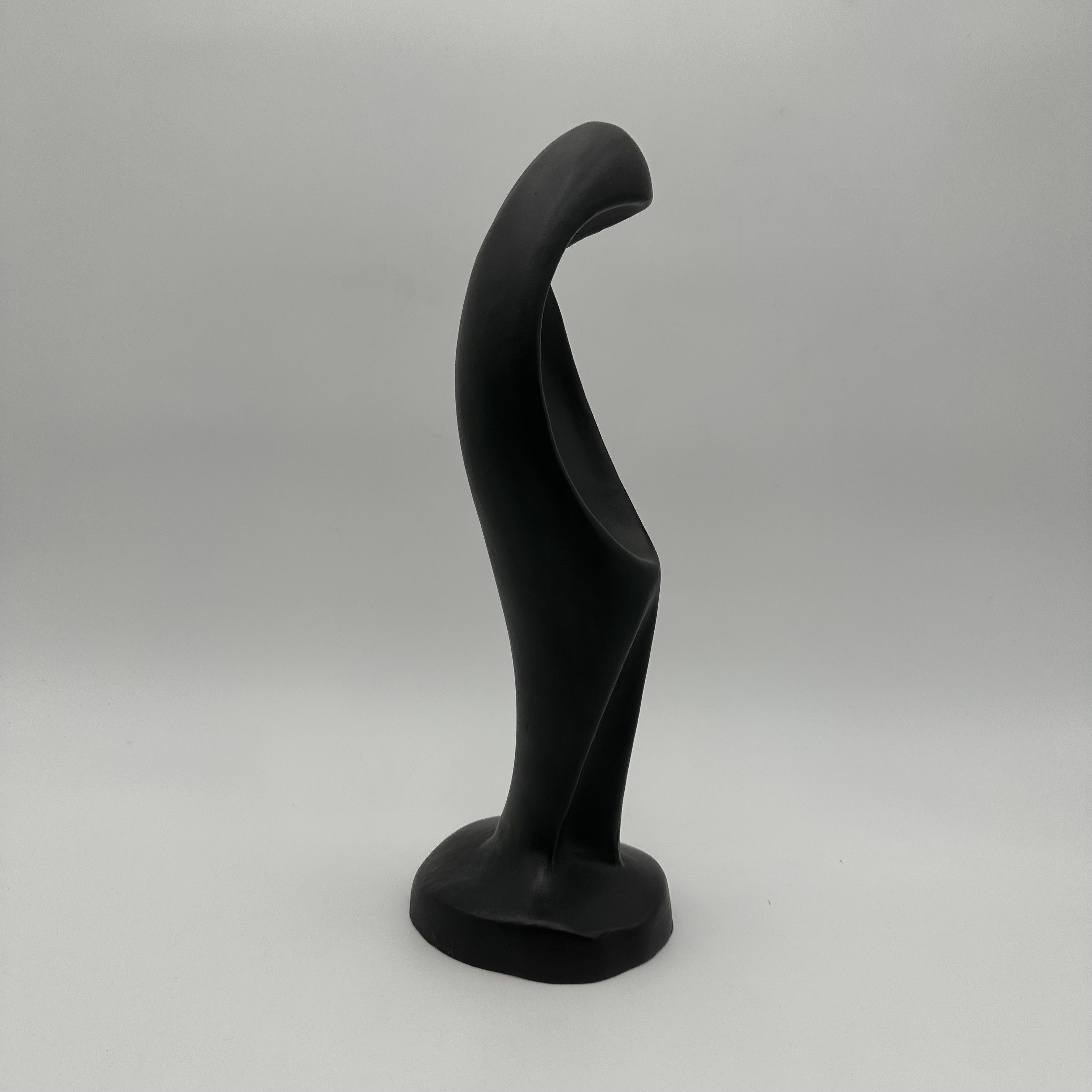 This superb black ceramic sculpture perfectly illustrates the revival of sacred art and the minimalist aesthetic of the 1960s. Strongly inspired by the work of Georges Jouve and the great post-war ceramists, this piece breaks away from traditional representations to offer a purely abstract and spiritual vision of the Marian figure. Standing an impressive 35 cm tall on a 12 cm diameter circular base, the sculpture commands attention with the organic fluidity of its lines. The artist has captured the essence of a contemplative attitude through a single, enveloping curve, evoking the drape of a protective mantle. The deliberate absence of facial features reinforces the universal, timeless, and silent character of the work. The treatment of the ceramic, covered in a beautiful deep, slightly satin black glaze, perfectly highlights the purity of the modeling. Offered in excellent vintage condition, this sculptural piece possesses an undeniable decorative power. It will integrate elegantly into a contemporary or mid-century modern interior, displayed on a sideboard, in a lit alcove, or on a console table, bringing a touch of serenity and radical modernity.
