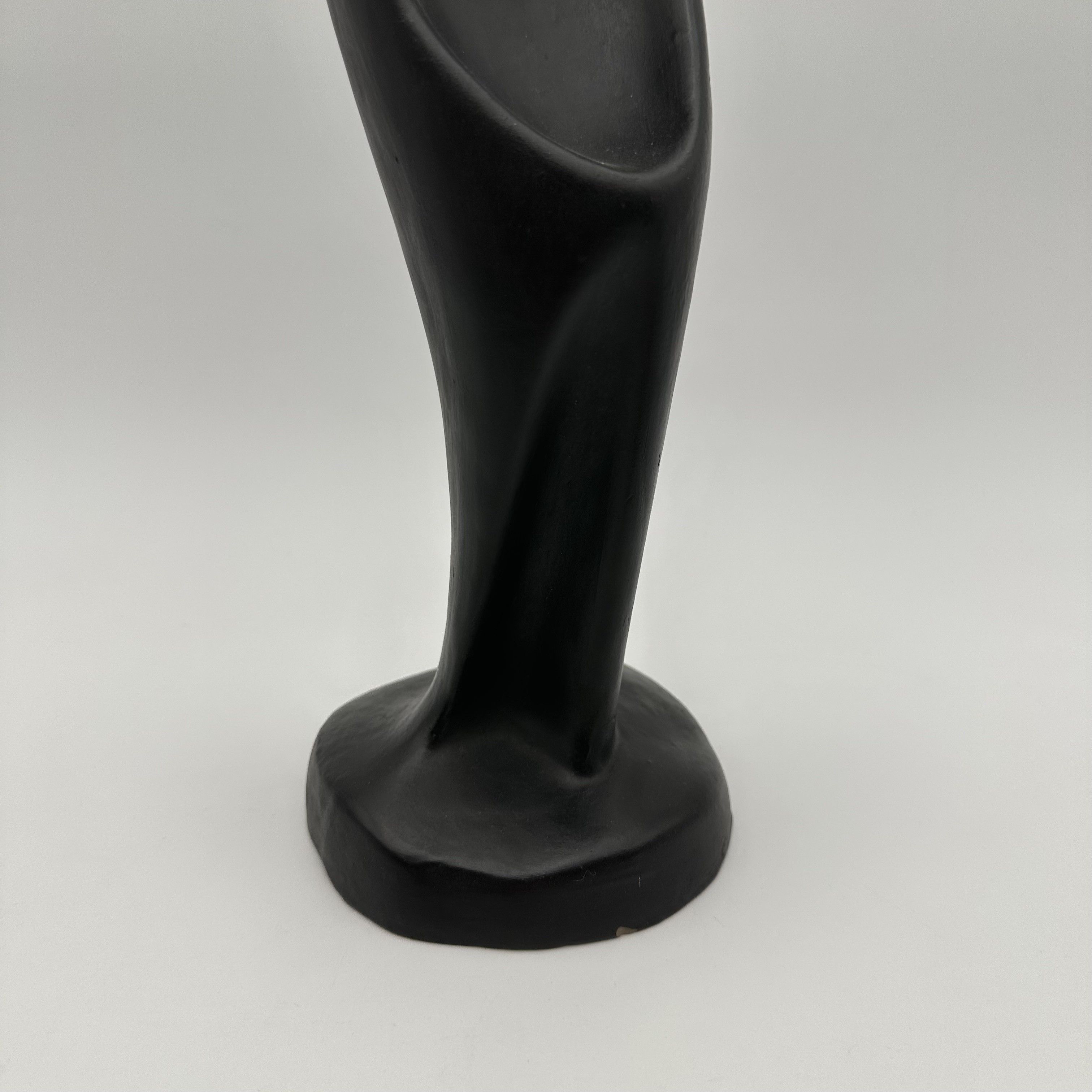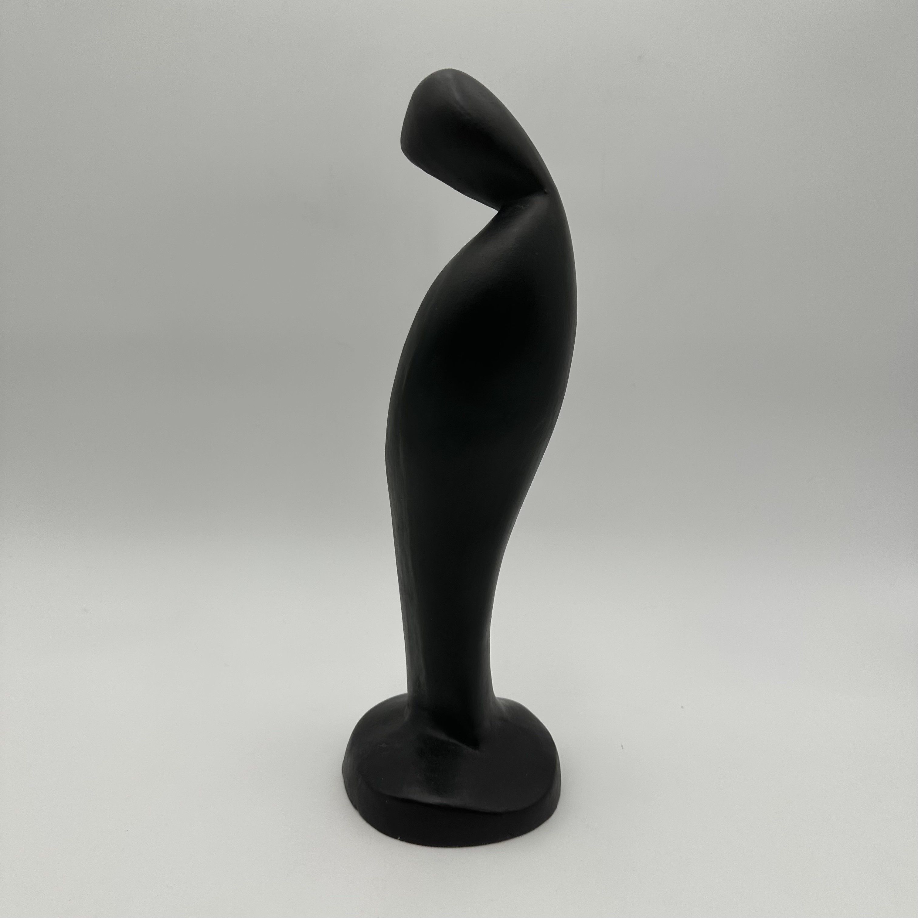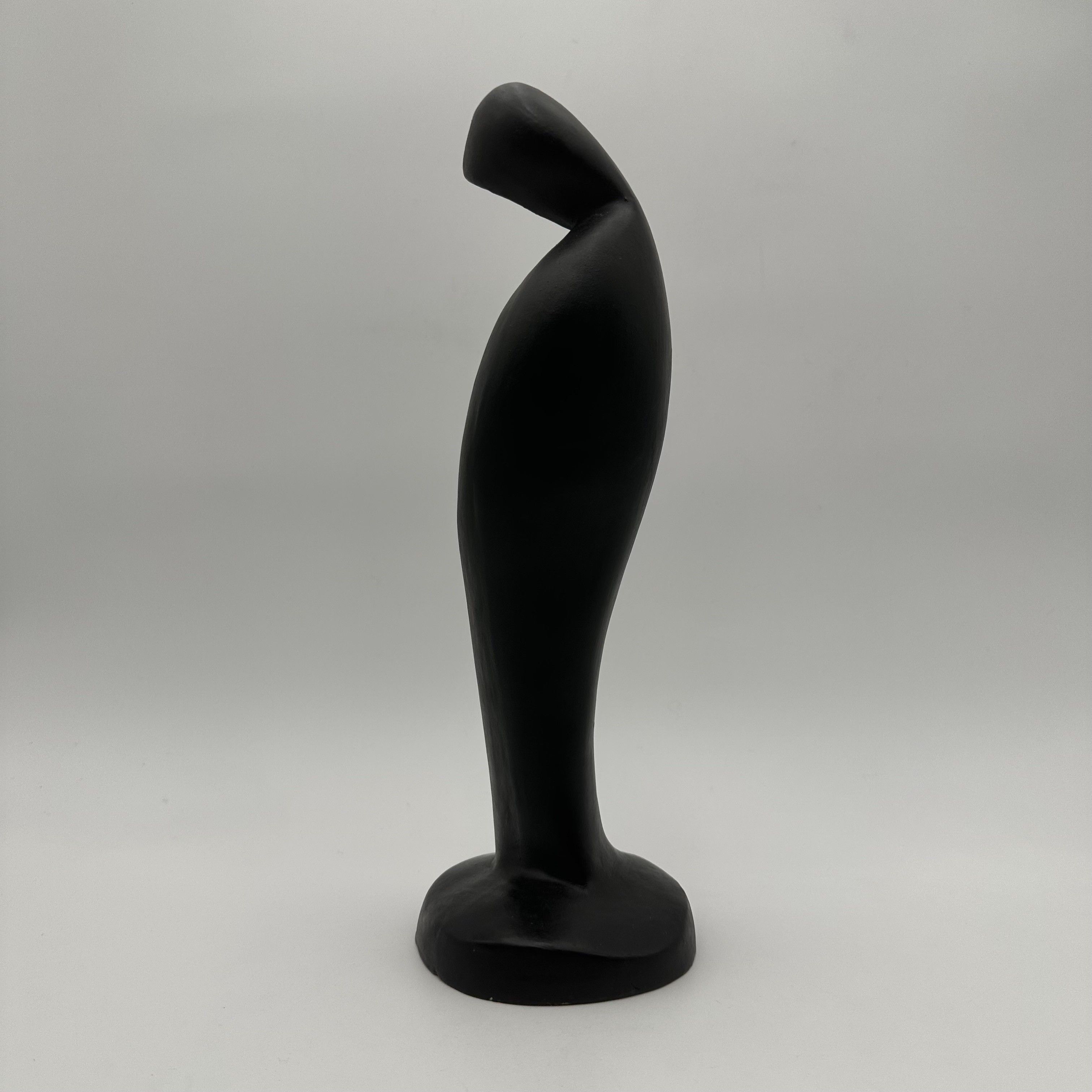 This superb black ceramic sculpture perfectly illustrates the revival of sacred art and the minimalist aesthetic of the 1960s. Strongly inspired by the work of Georges Jouve and the great post-war ceramists, this piece breaks away from traditional representations to offer a purely abstract and spiritual vision of the Marian figure. Standing an impressive 35 cm tall on a 12 cm diameter circular base, the sculpture commands attention with the organic fluidity of its lines. The artist has captured the essence of a contemplative attitude through a single, enveloping curve, evoking the drape of a protective mantle. The deliberate absence of facial features reinforces the universal, timeless, and silent character of the work. The treatment of the ceramic, covered in a beautiful deep, slightly satin black glaze, perfectly highlights the purity of the modeling. Offered in excellent vintage condition, this sculptural piece possesses an undeniable decorative power. It will integrate elegantly into a contemporary or mid-century modern interior, displayed on a sideboard, in a lit alcove, or on a console table, bringing a touch of serenity and radical modernity.