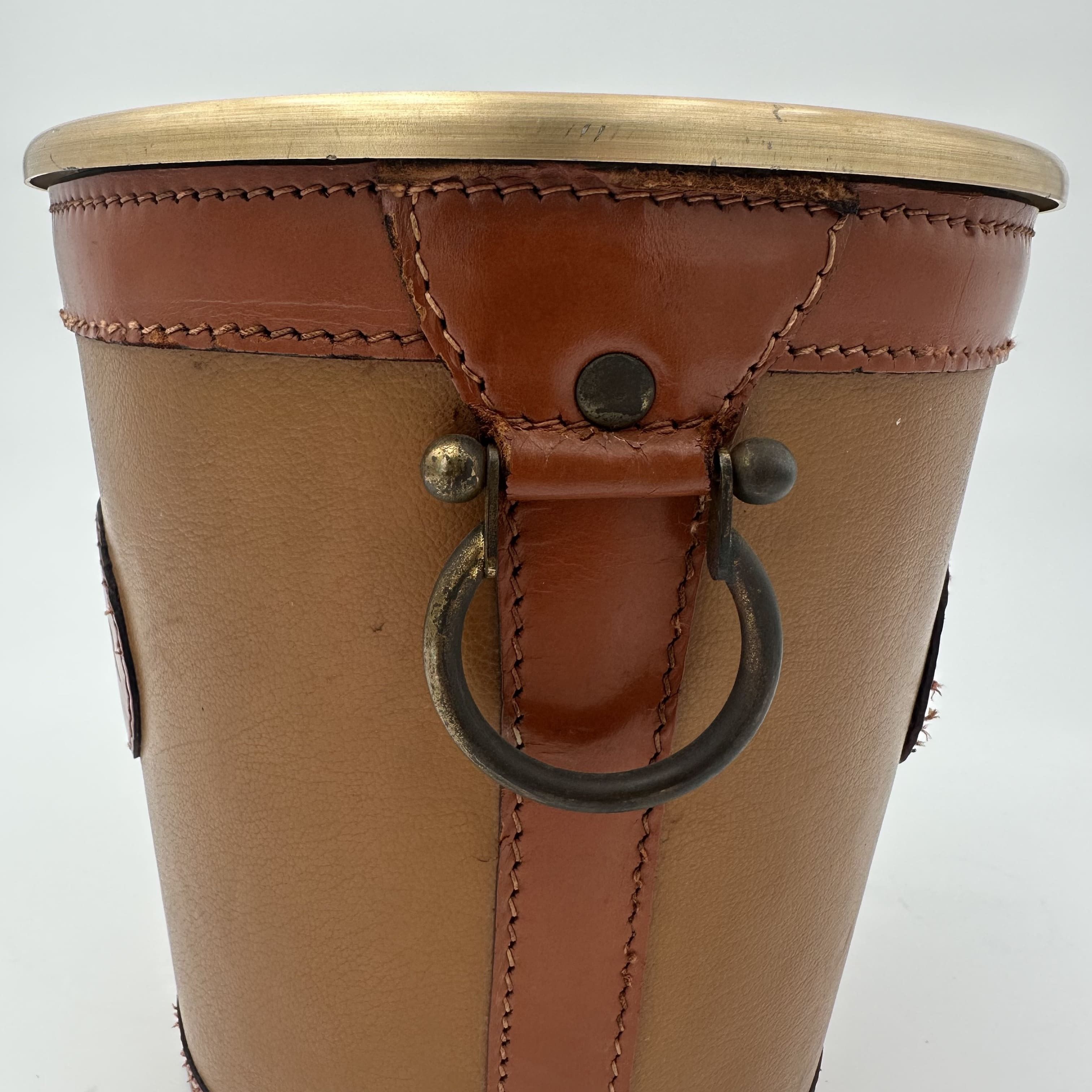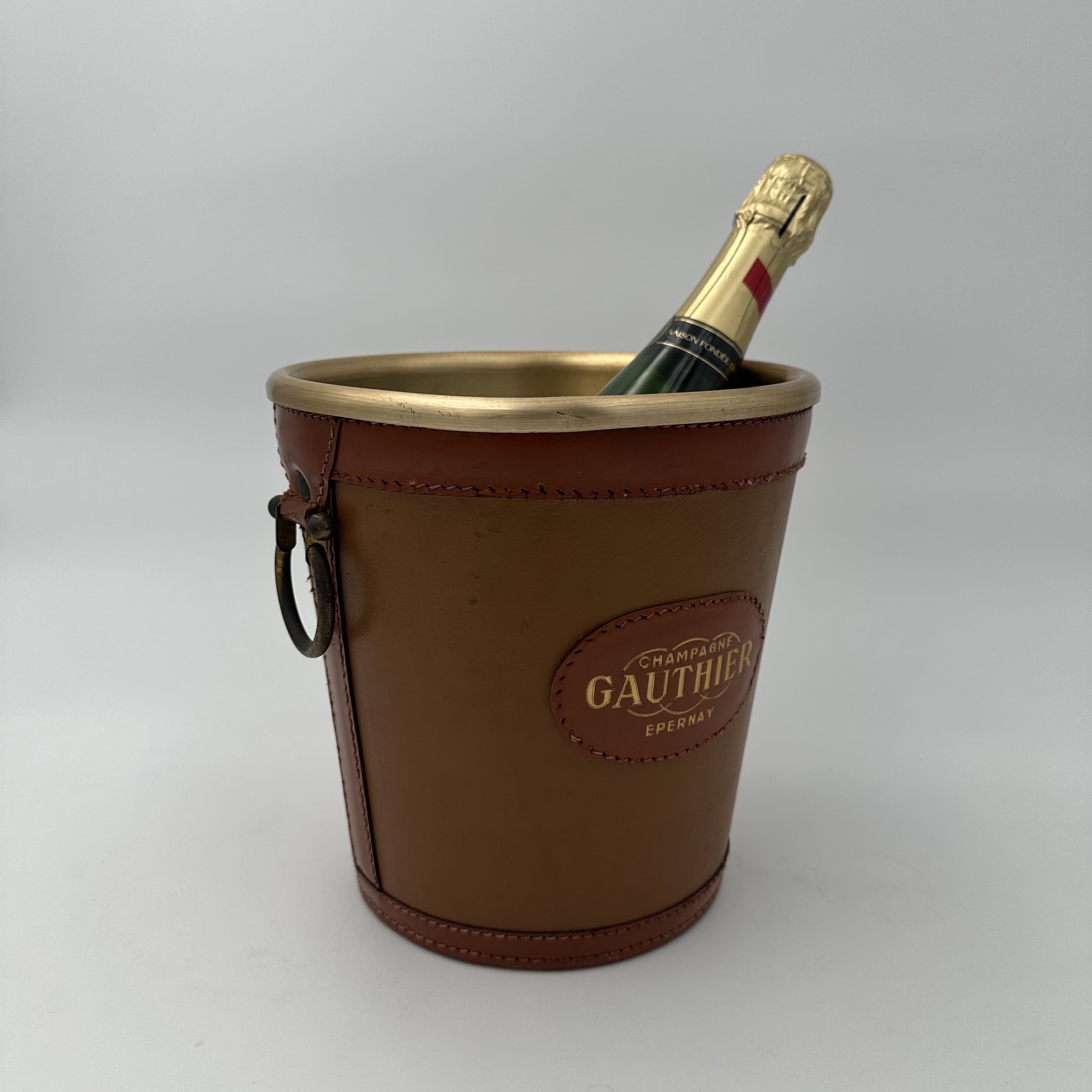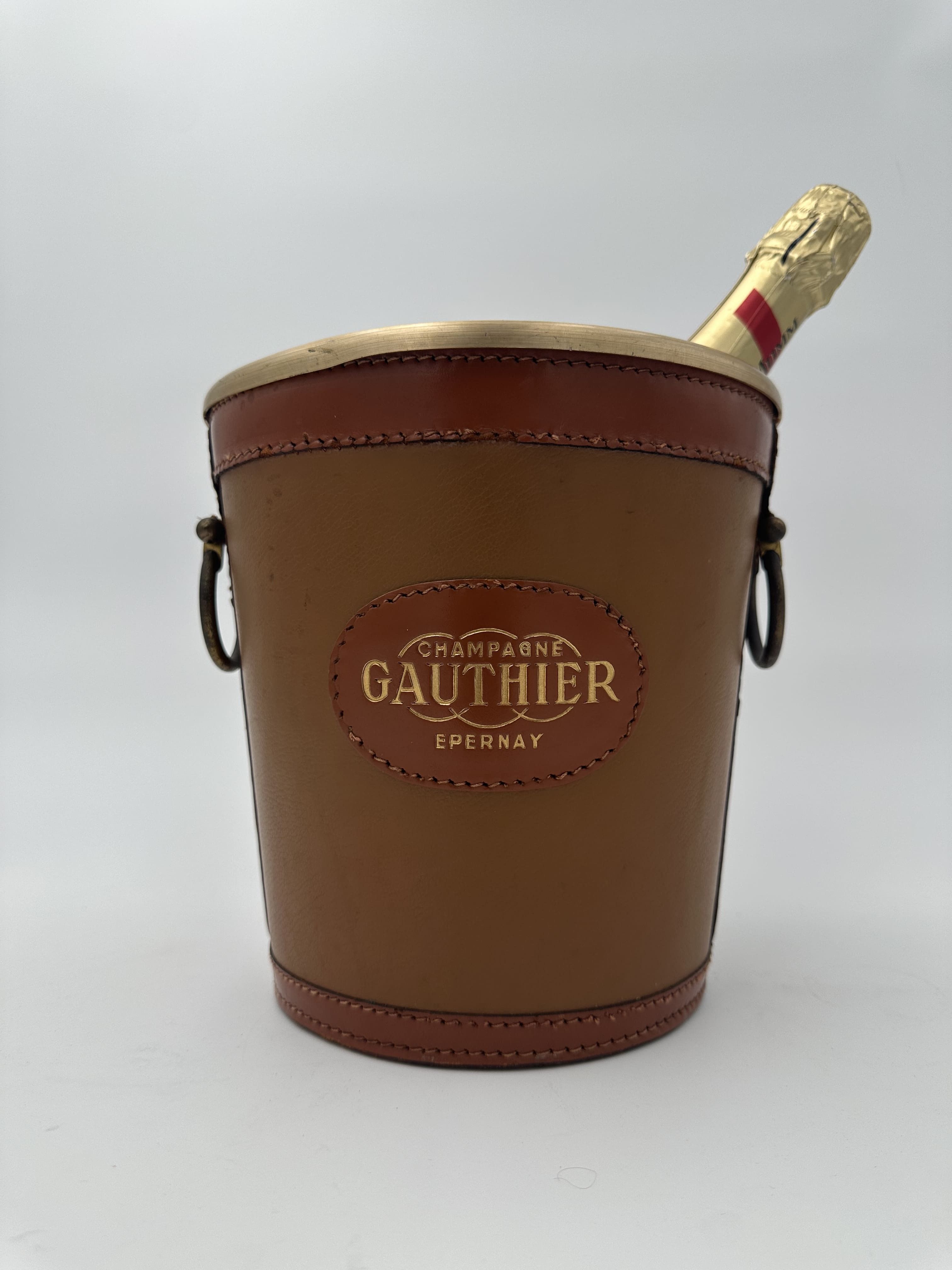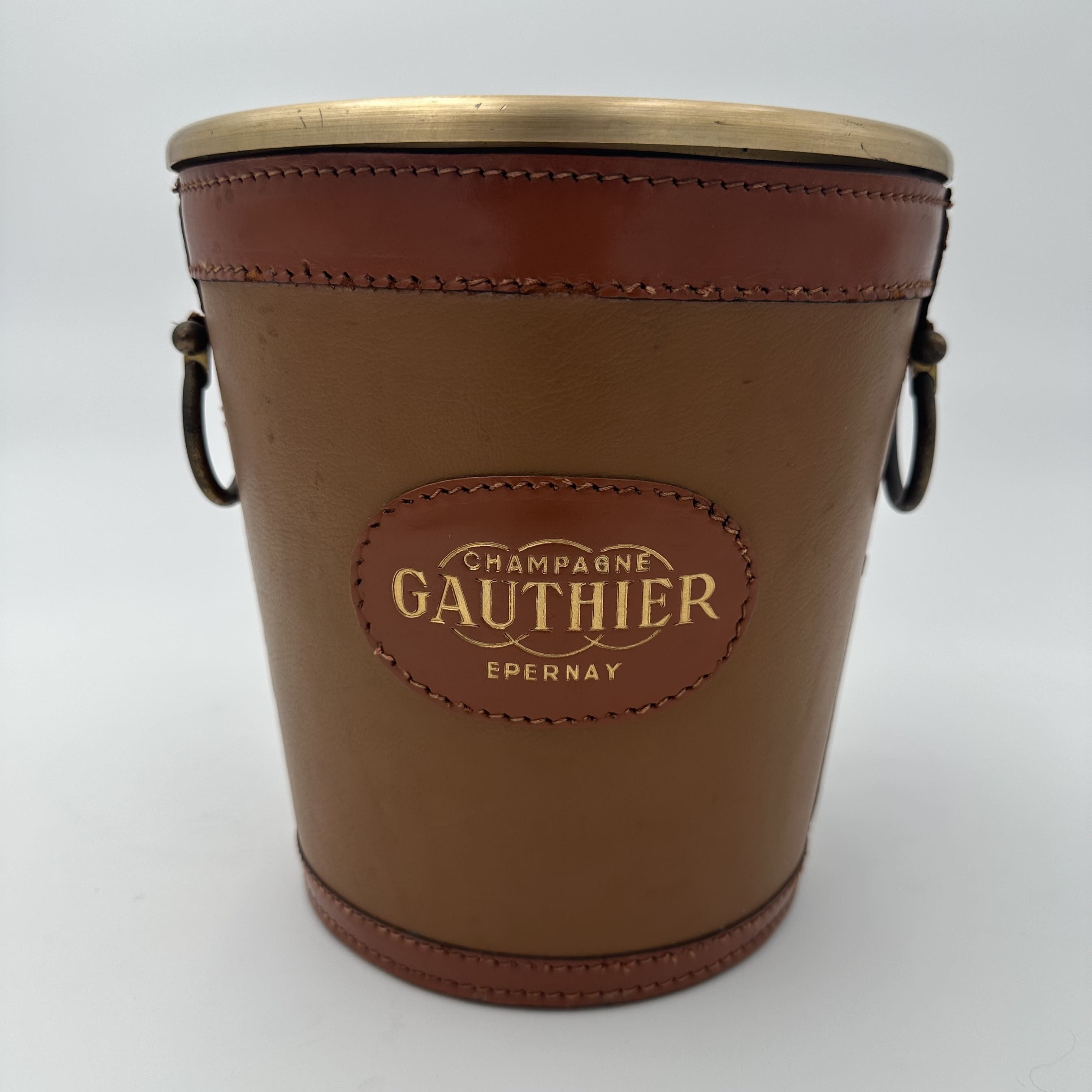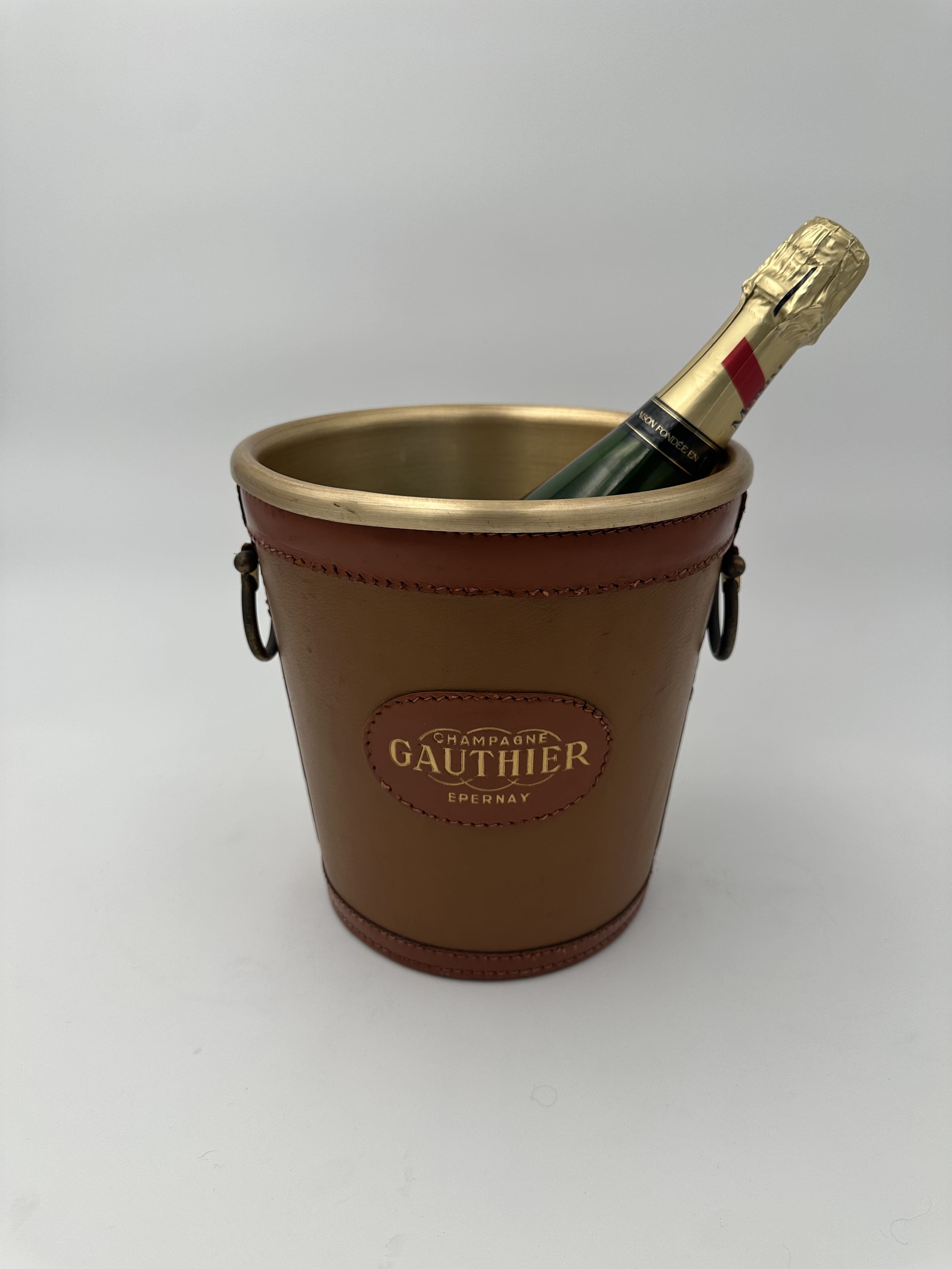 This champagne bucket adopts a slightly flared cylindrical shape with a metal vat entirely sheathed in two-tone leather. The tan leather body is framed by darker contrasting brown borders, firmly assembled with rigorous 'saddle' stitching. The upper lip reveals a gilded brass rim, matching the two dark-patinated lateral ring handles. The main face features an applied oval leather medallion, gold-stamped with the inscription 'CHAMPAGNE GAUTHIER EPERNAY'. Maison Gauthier, founded in 1858 in Épernay, was one of the historic and prestigious Champagne houses. Good overall condition with natural patina of use. This timeless bar accessory will bring a distinct 'Gentleman's Club' touch to a serving cart.