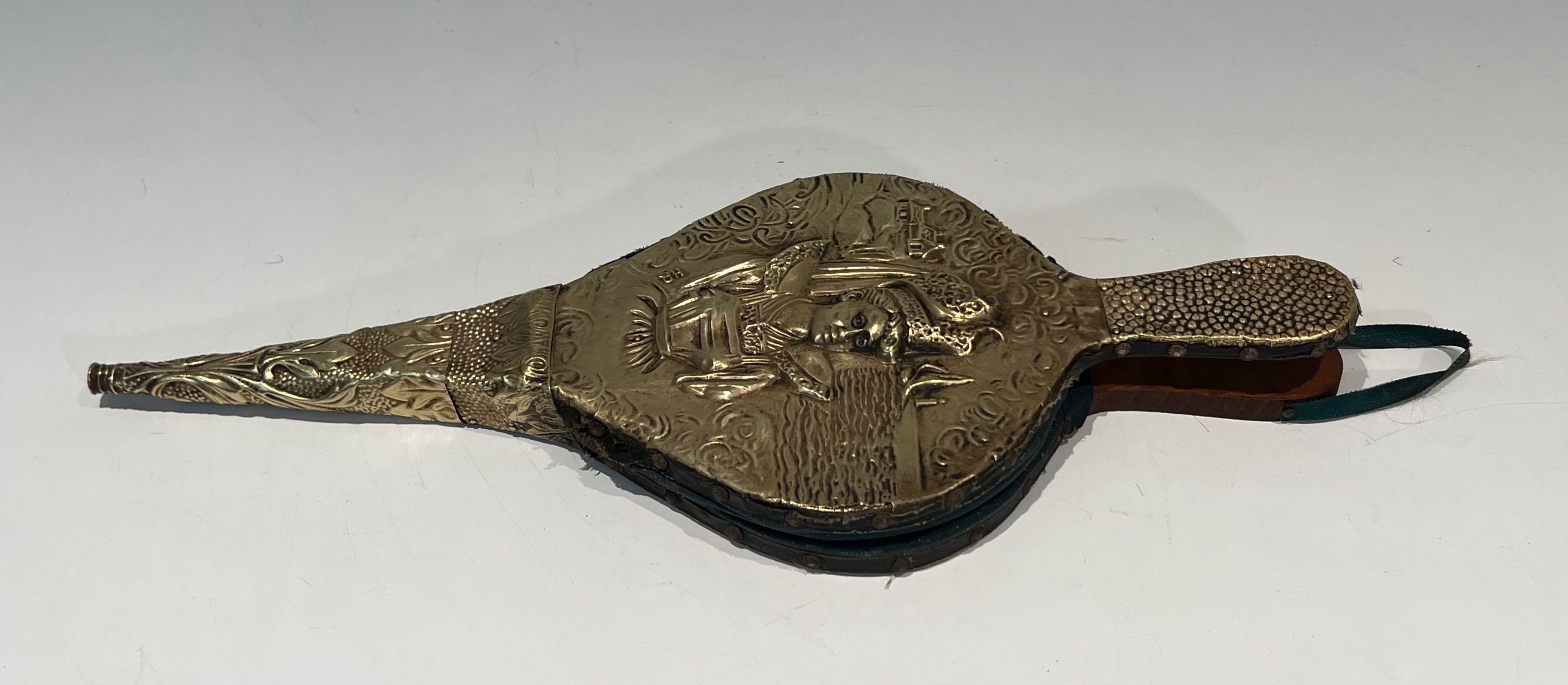 Fireplace bellows in embossed brass representing a woman. French work in Louis the 16th style. Circa 1900