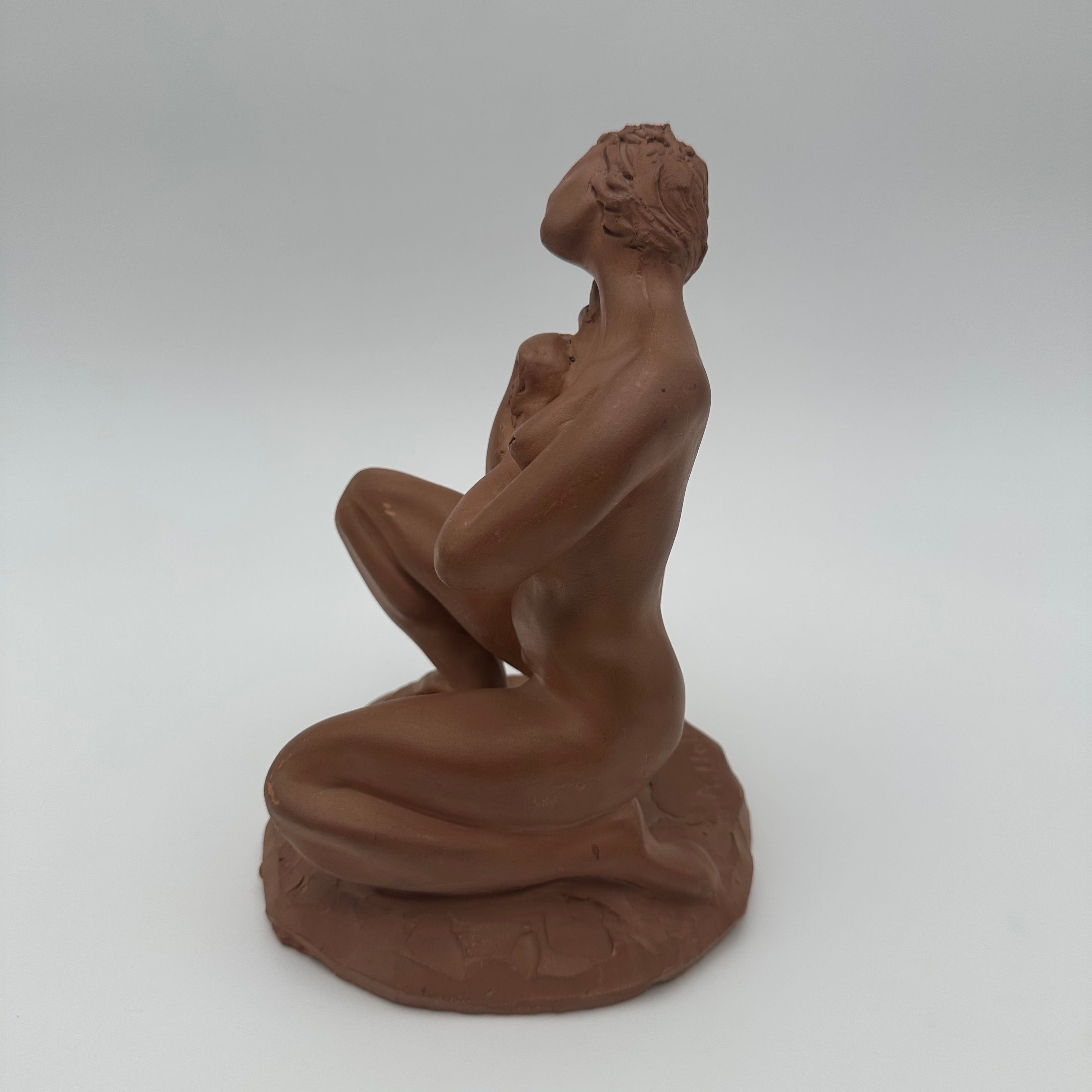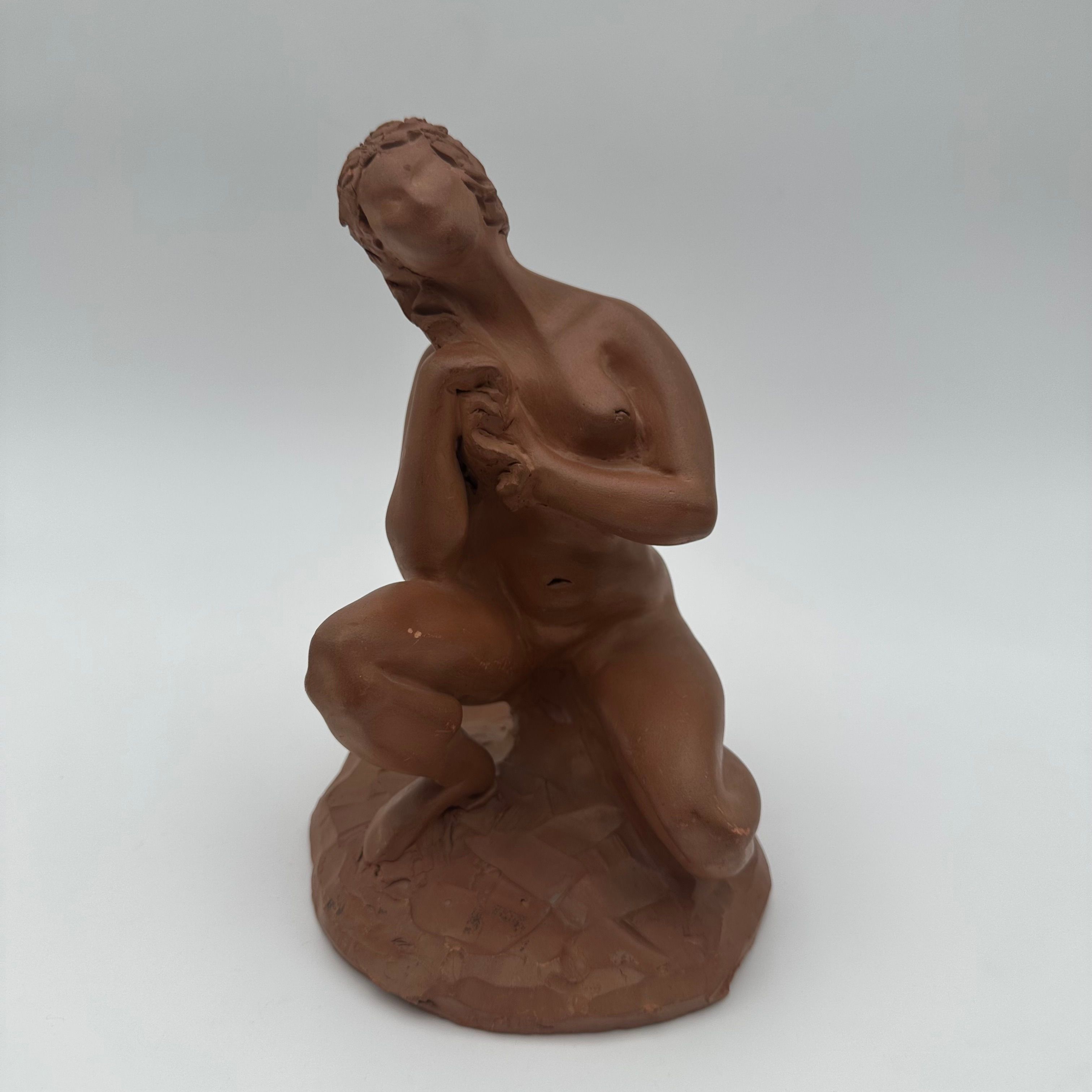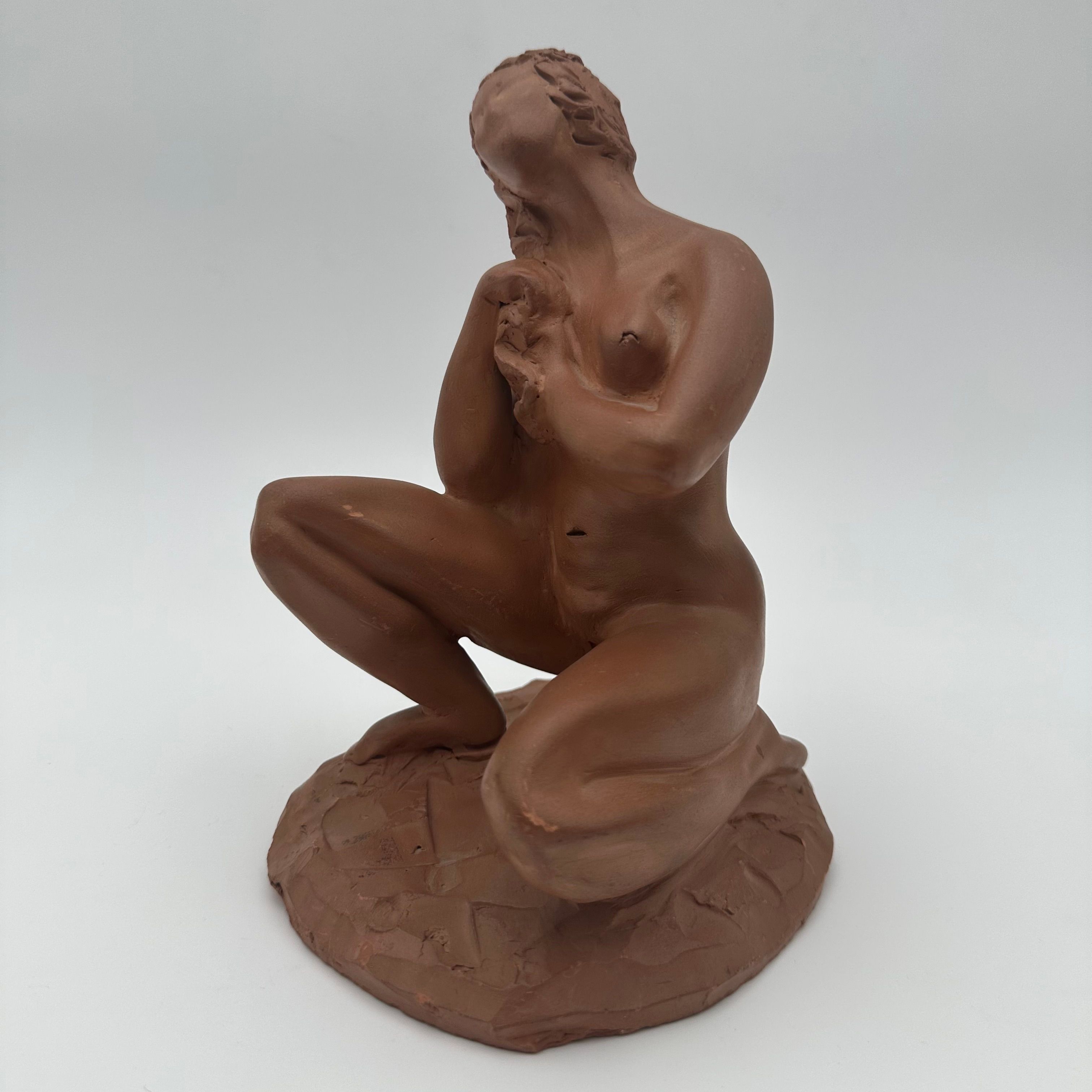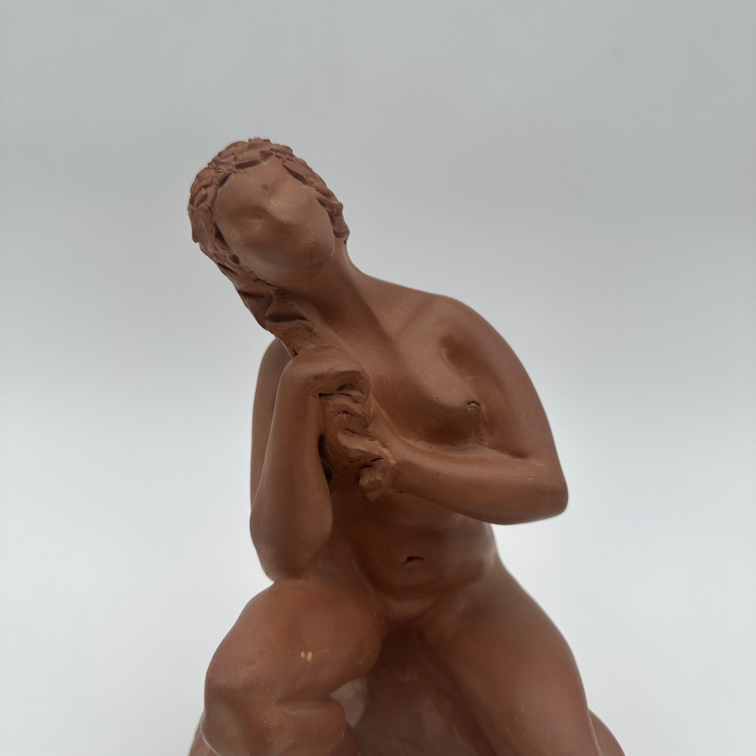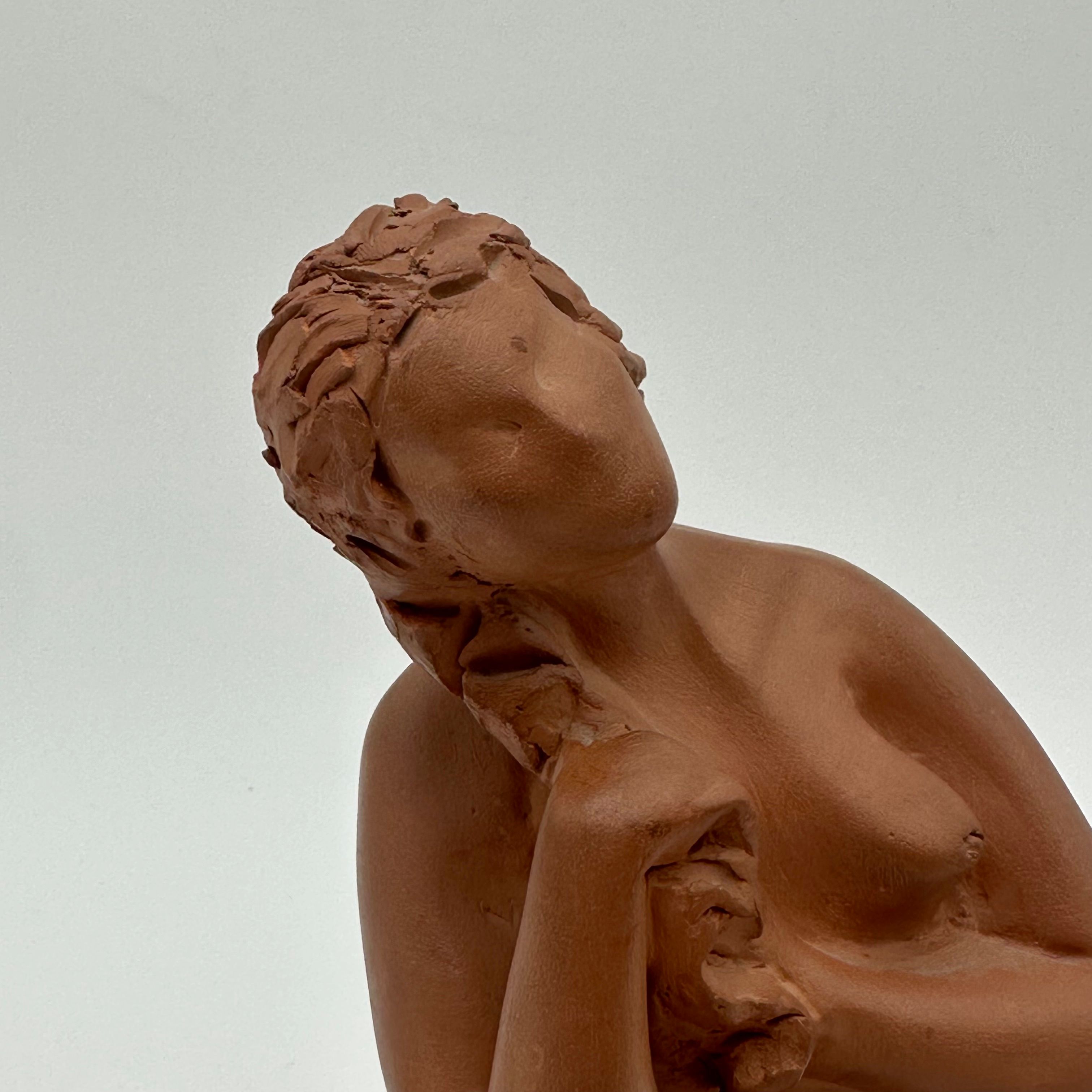 Executed in terracotta, this sculpture is distinguished by its restrained and naturalistic modeling, characteristic of 20th-century decorative production.