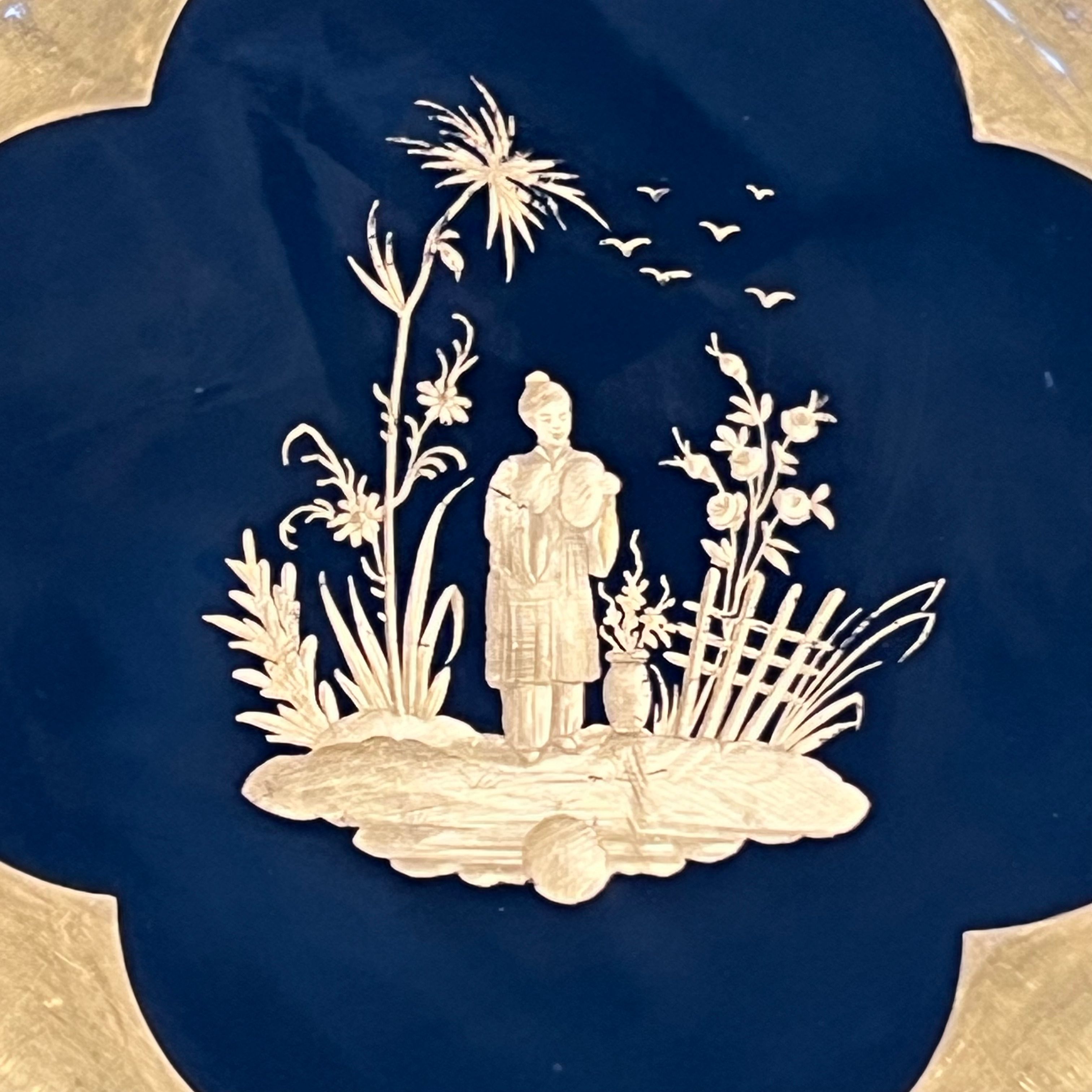 Set of 8 Gilt Porcelain Plates with Gilt Chinoiserie Decoration on a Black Ground, Signed Delvaux Paris