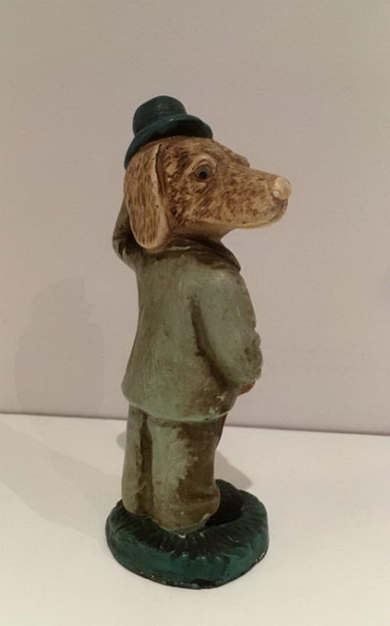 Anthropomorphic plaster figure representing a dog with hat and umbrellaAnthropomorphic plaster figure representing a dog with hat and umbrella. Circa 1940Request priceDimensionsInformationProduct codeAni-396