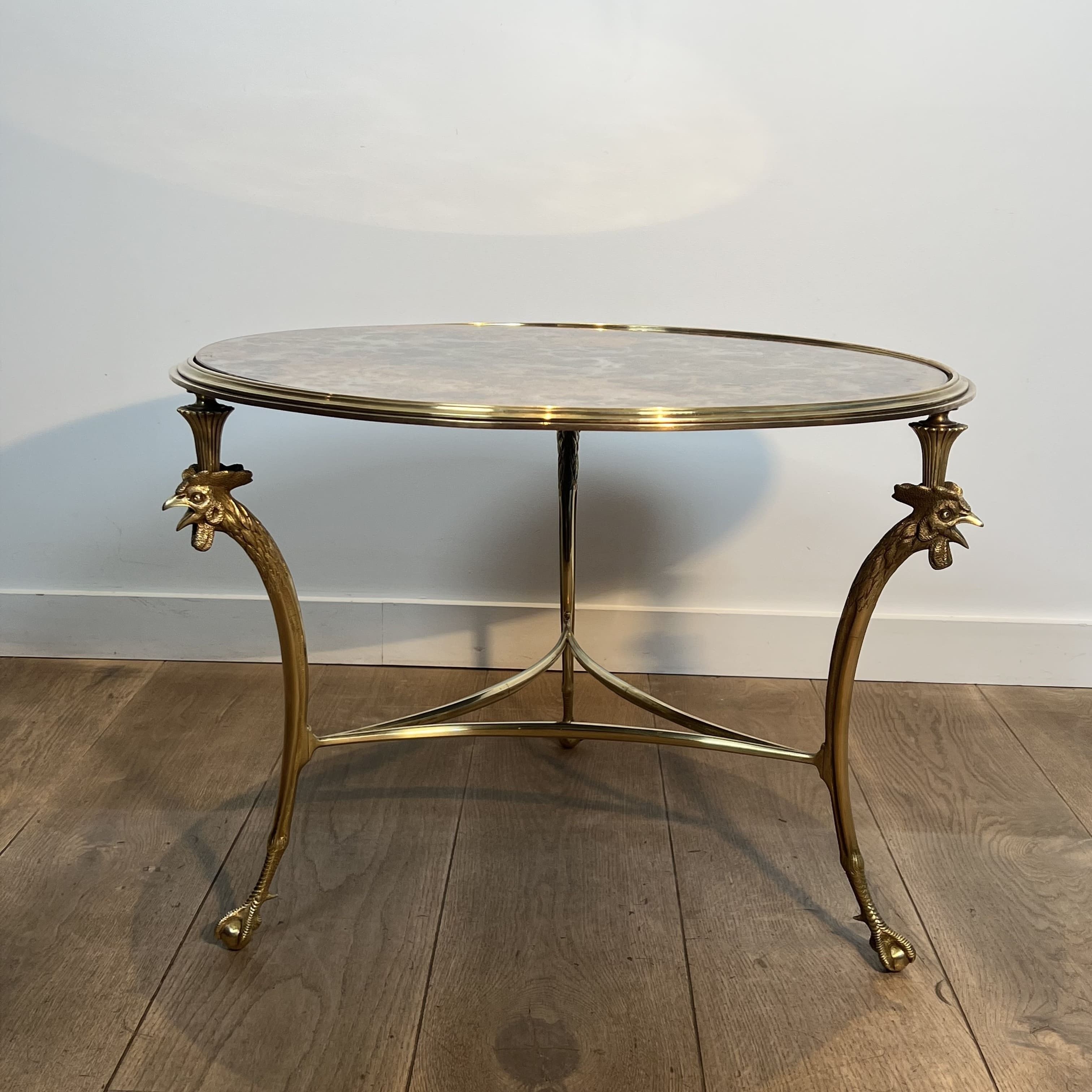 This coffee table features a circular architectural structure resting on a heavy solid bronze tripod base. The rigor of the assembly is softened by an animalier ornamentation of exceptional chasing finesse. The three cabriole legs are topped, directly beneath the rim, by finely detailed rooster heads acting as supporting capitals. These uprights terminate at the base with the classic claw-and-ball motif, anchoring the piece. The stability of the frame is reinforced by a sinuous stretcher meeting a central drop from the top. The top itself, enclosed by a bronze rim, holds an eglomise mirror plate featuring a rich mottled pattern with grey and coppery nuances. The virtuosity of the bronze casting and the ornamental repertoire unmistakably mark a production by Maison Charles. Founded in 1908 by Ernest Charles in Paris, the manufactory rose to the pinnacle of French art foundries in the 20th century. Very good overall condition. With its 70 cm diameter, this sculptural table will authoritatively anchor the center of a classic or modernist living room.