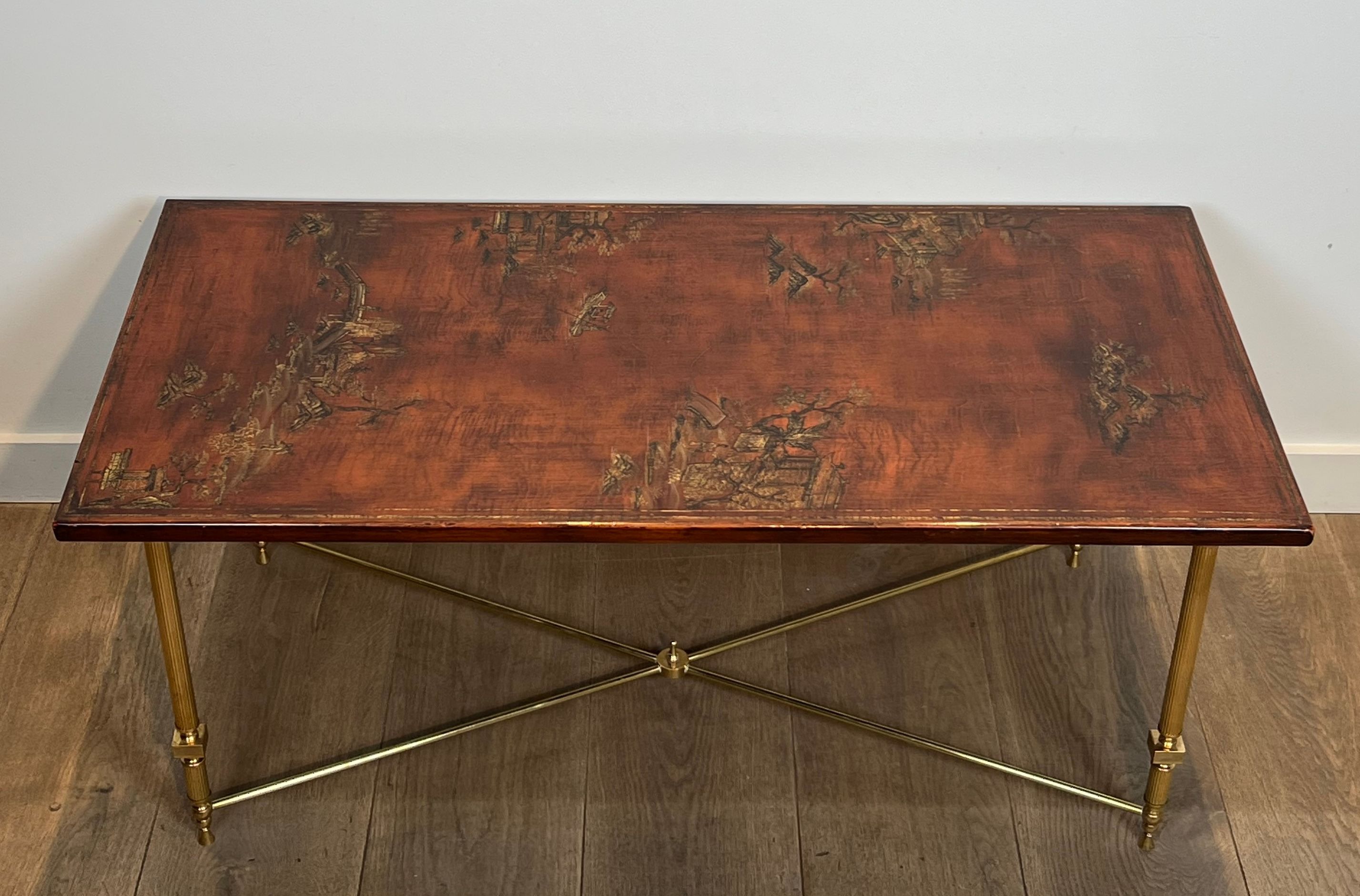 Neoclassical style brass coffee table with wooden lacquered top representing Chinese scenes. French work attributed to Maison Jansen. Circa 1940