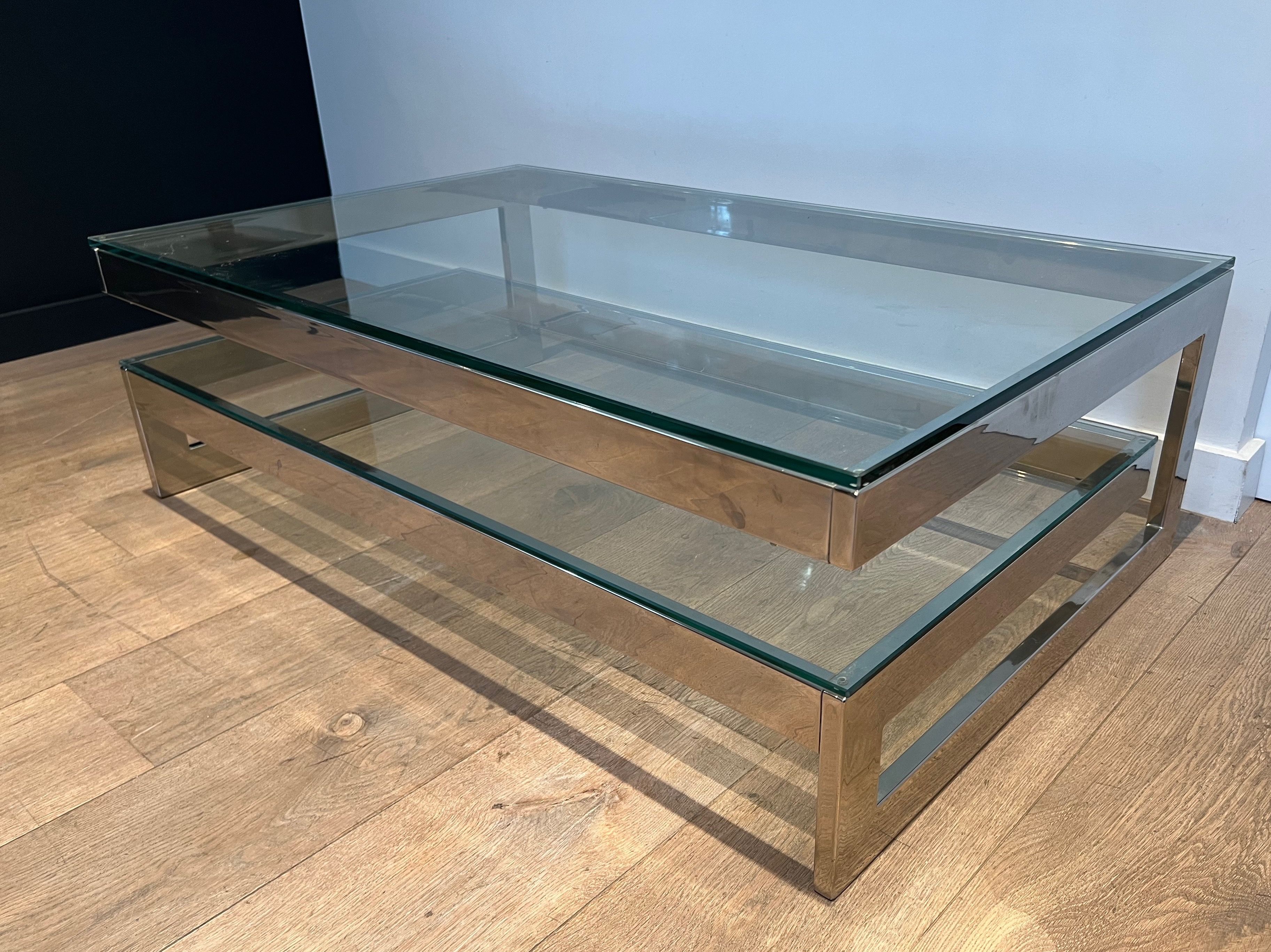Design Chrome Coffee Table With 2 Glass ShelvesDesign chrome coffee table with 2 thick glass shelves. French work. Circa 1970Request priceDimensionsWidth47.24 inch120 cmDepth29.53 inch75 cmHeight14.96 inch38 cmInformationProduct code50's-55549