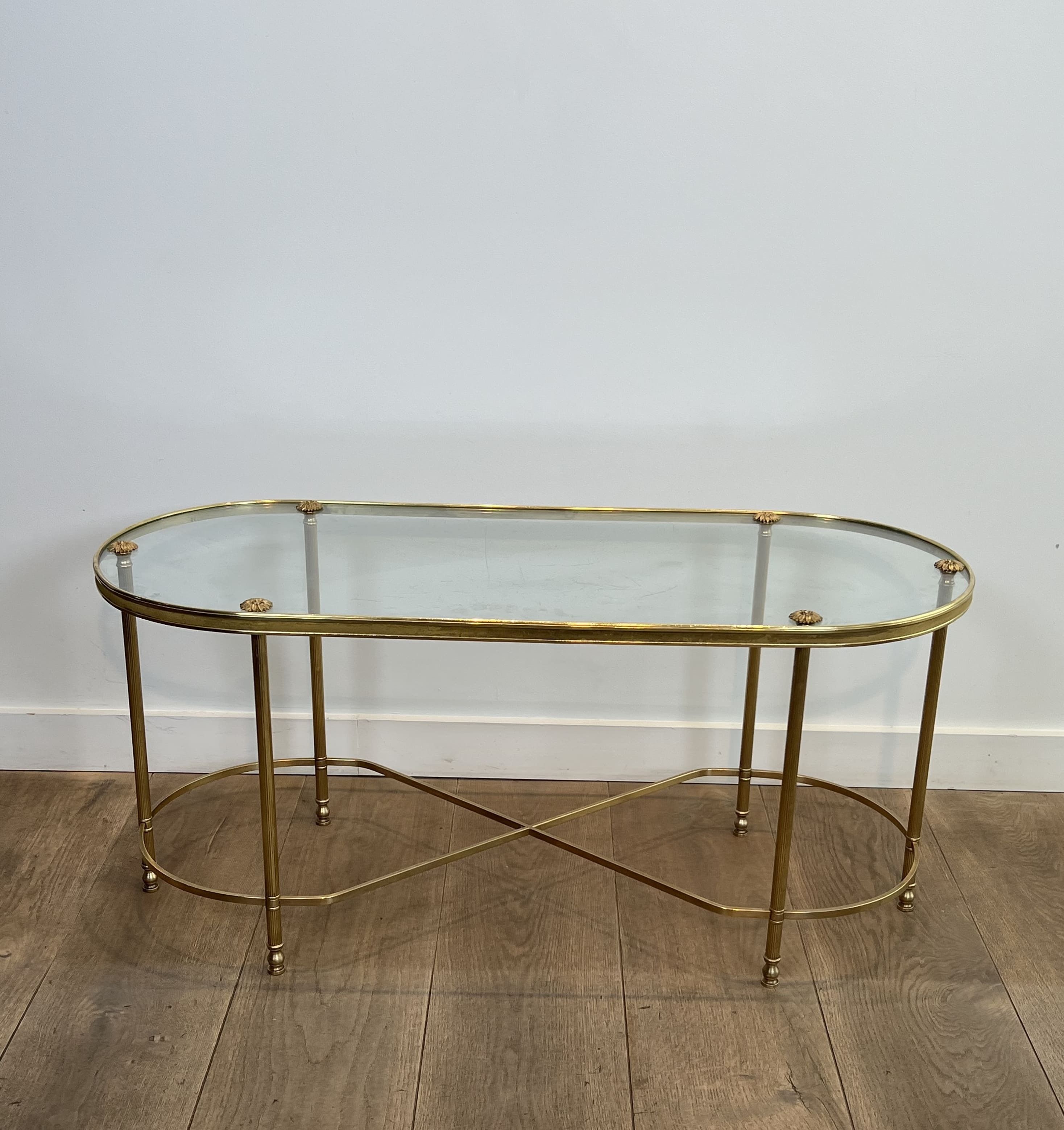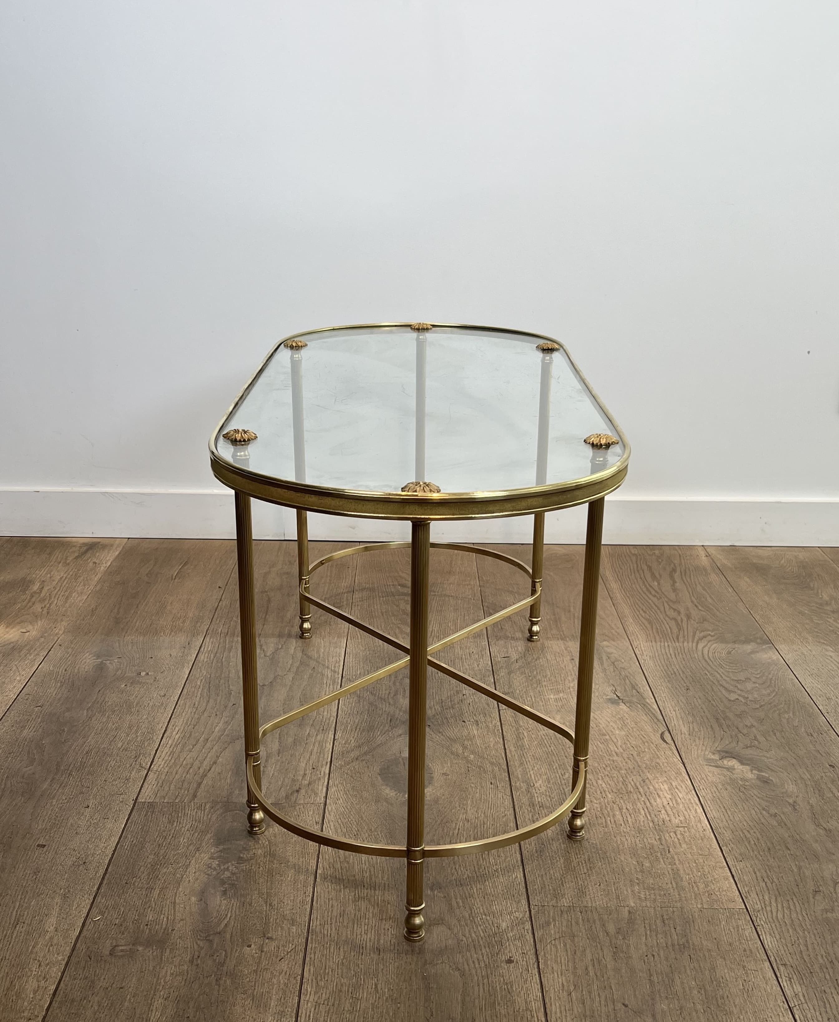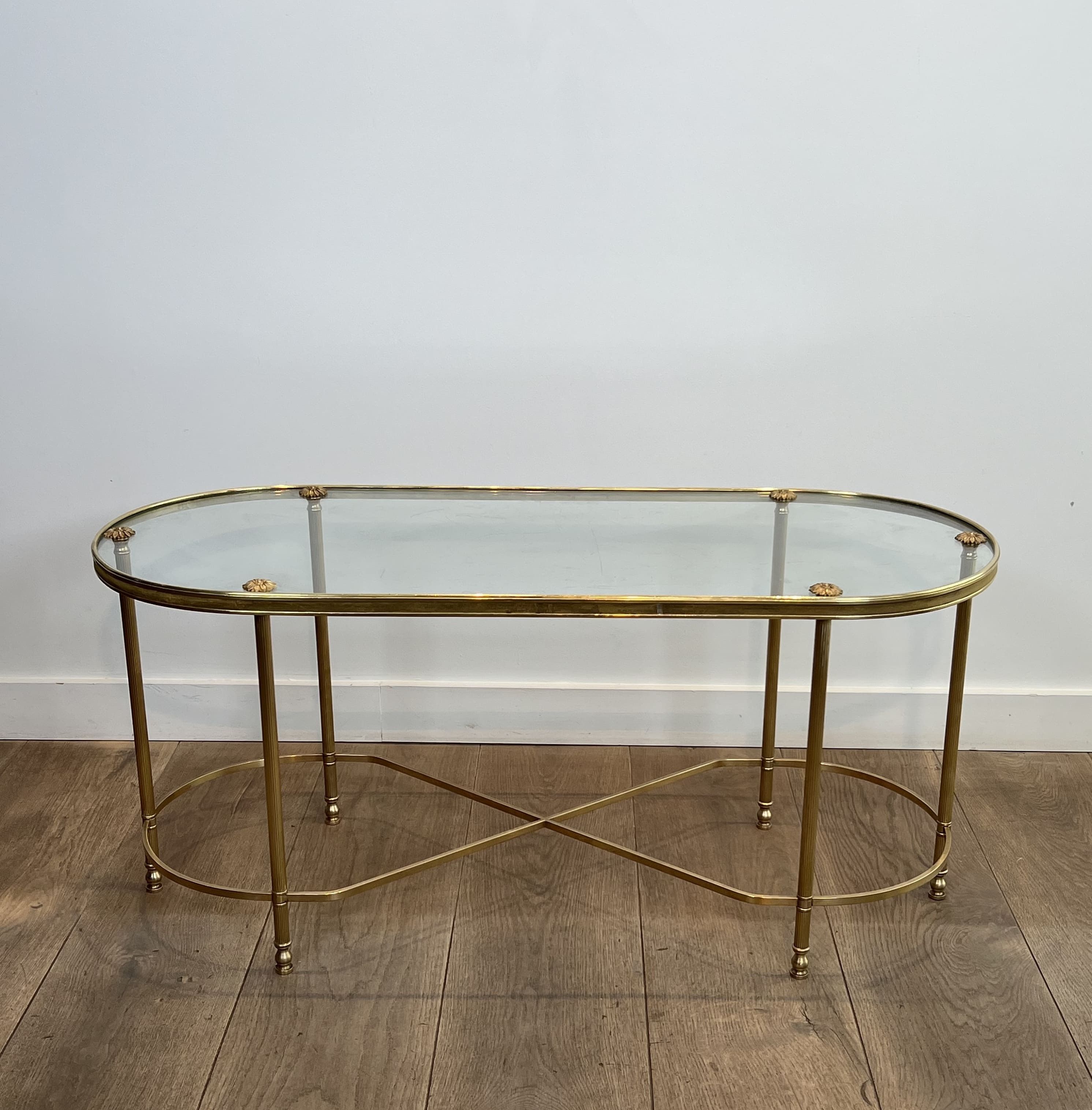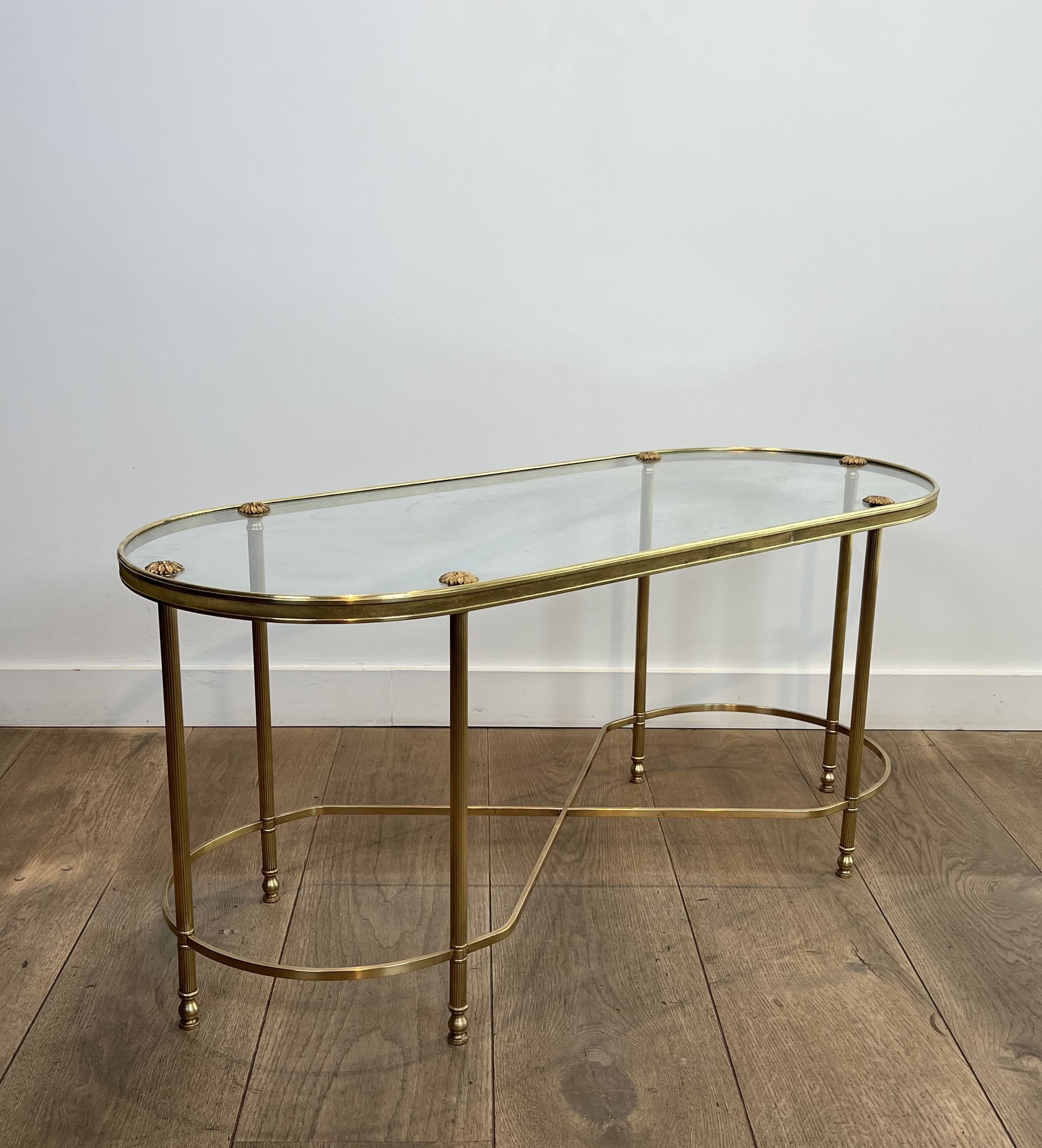 This coffee table features an architectural oblong structure made entirely of brass. The chassis rests on six vertical tubular uprights, punctuated at the bottom by turned rings and ending in small toupie feet. The rigidity and elegance of the base are ensured by a complex floor stretcher, combining a central 'X' cross and two lateral semi-circles. The upper rim, enclosing a thick clear glass plate, is accented directly above each leg by decorative cast brass rosettes. The combination of geometric rigor, the neoclassical repertoire (X-stretcher, turned rings, rosettes), and the nobility of brass stylistically links this table to the prestigious productions of Maison Baguès. Founded in Paris in the 19th century, this manufactory is the absolute benchmark in the art of gilded bronze and brass in France. In the 1950s and 1960s, responding to the popularity of the Hollywood Regency movement, Baguès produced a series of coffee tables and serving carts blending the finesse of metal with the transparency of glass, commissioned by top international decorators for prestigious residences. Good overall condition. The brass structure displays natural oxidation and an even patina of use, attesting to its age. The original glass top shows likely minor surface scratches inherent to normal use.