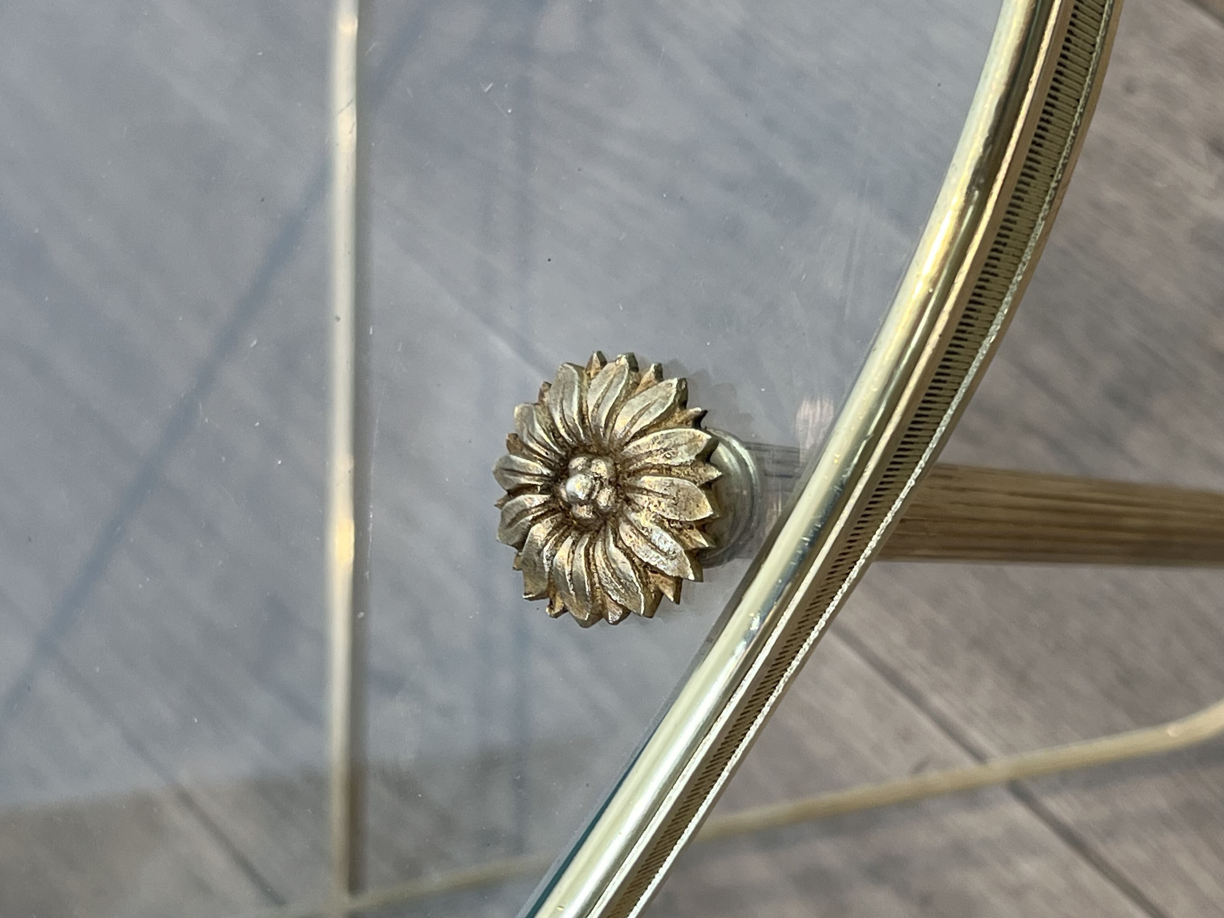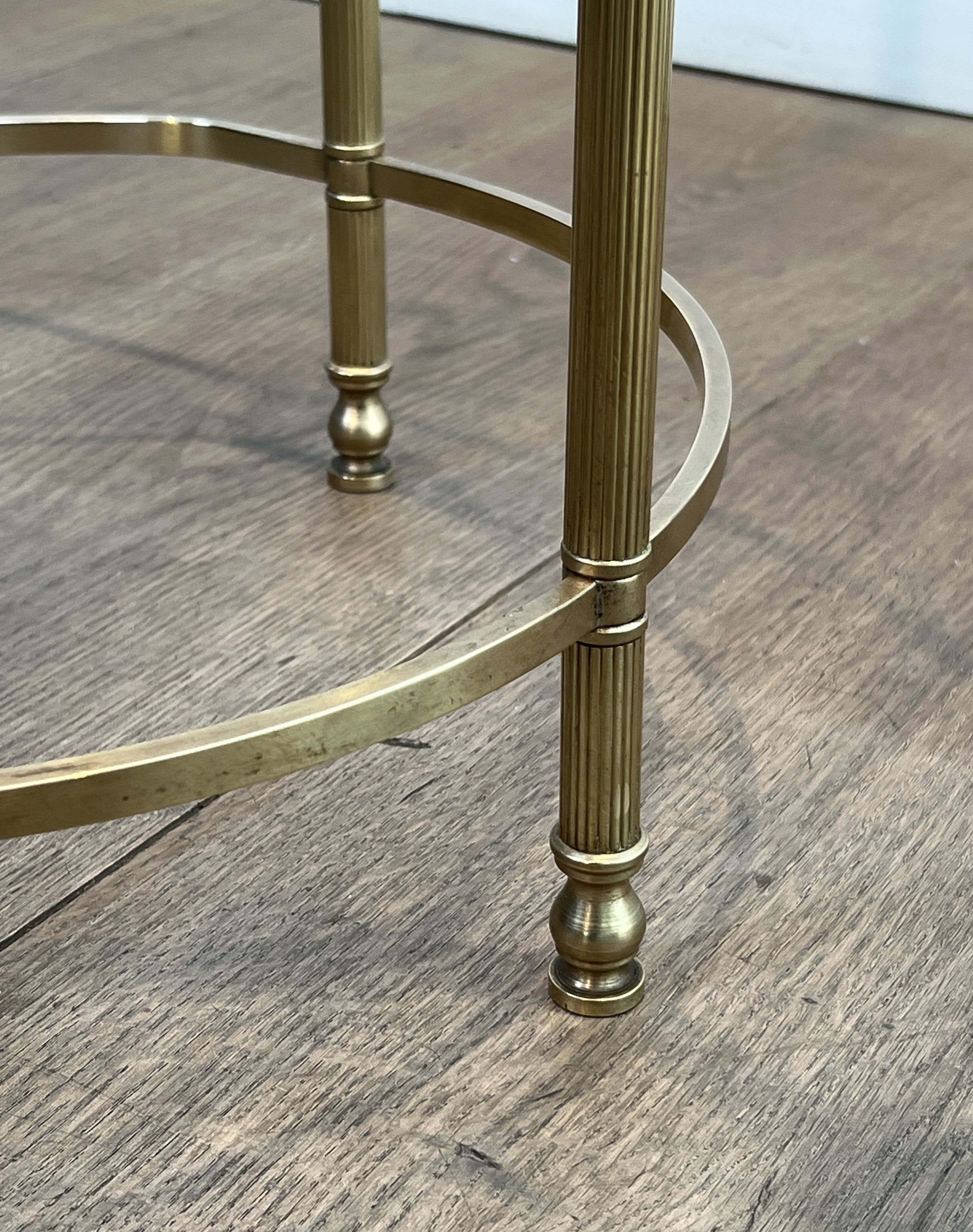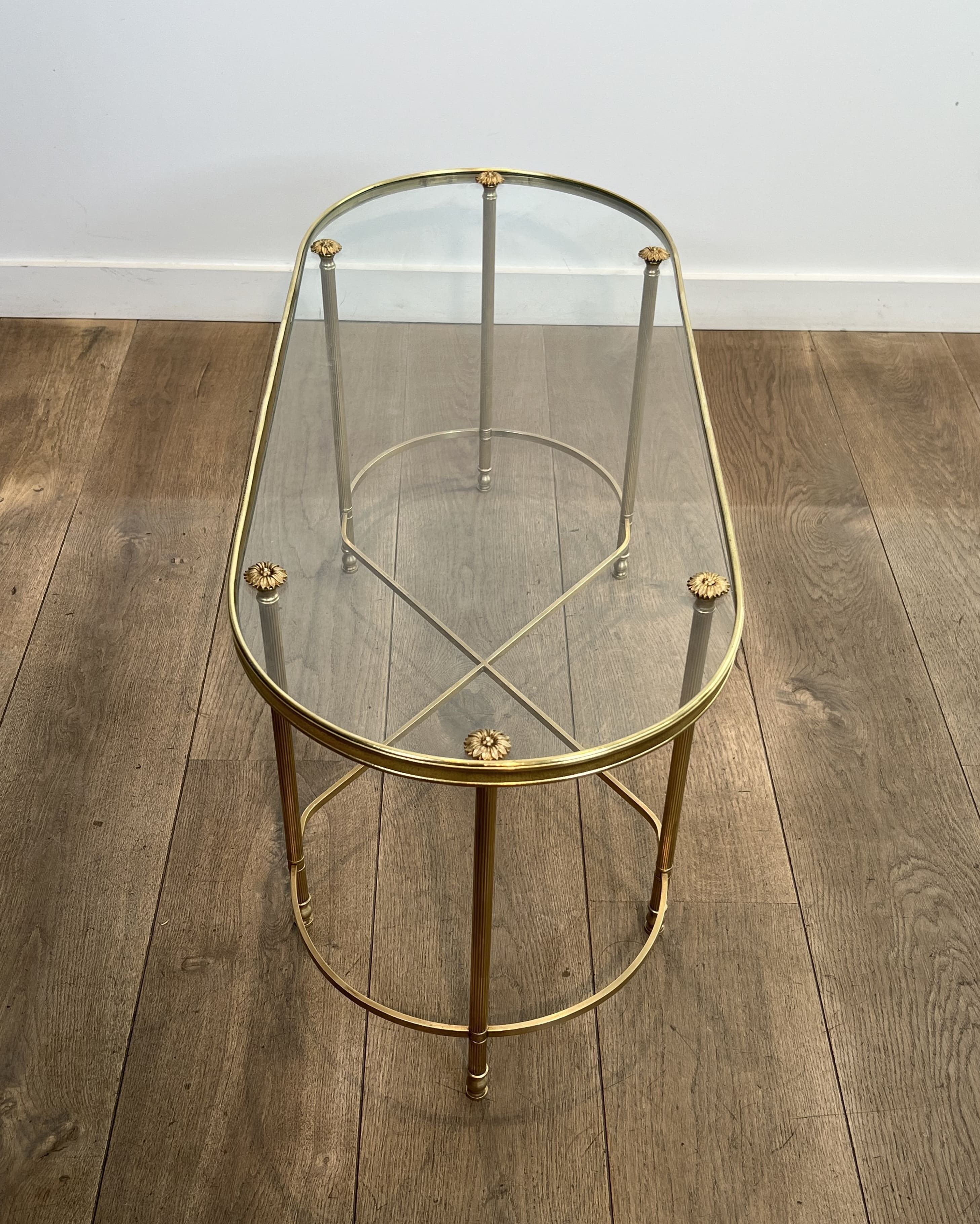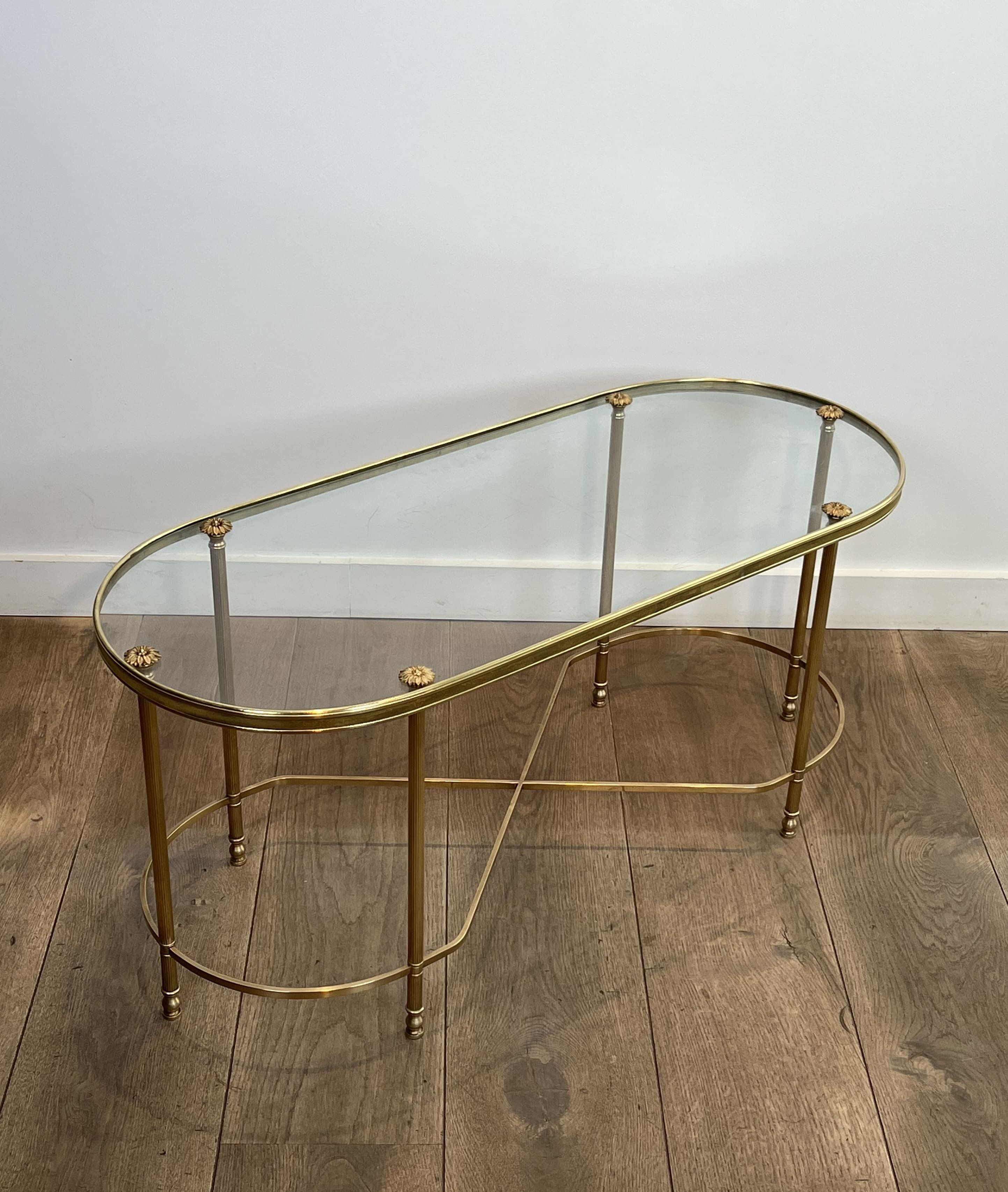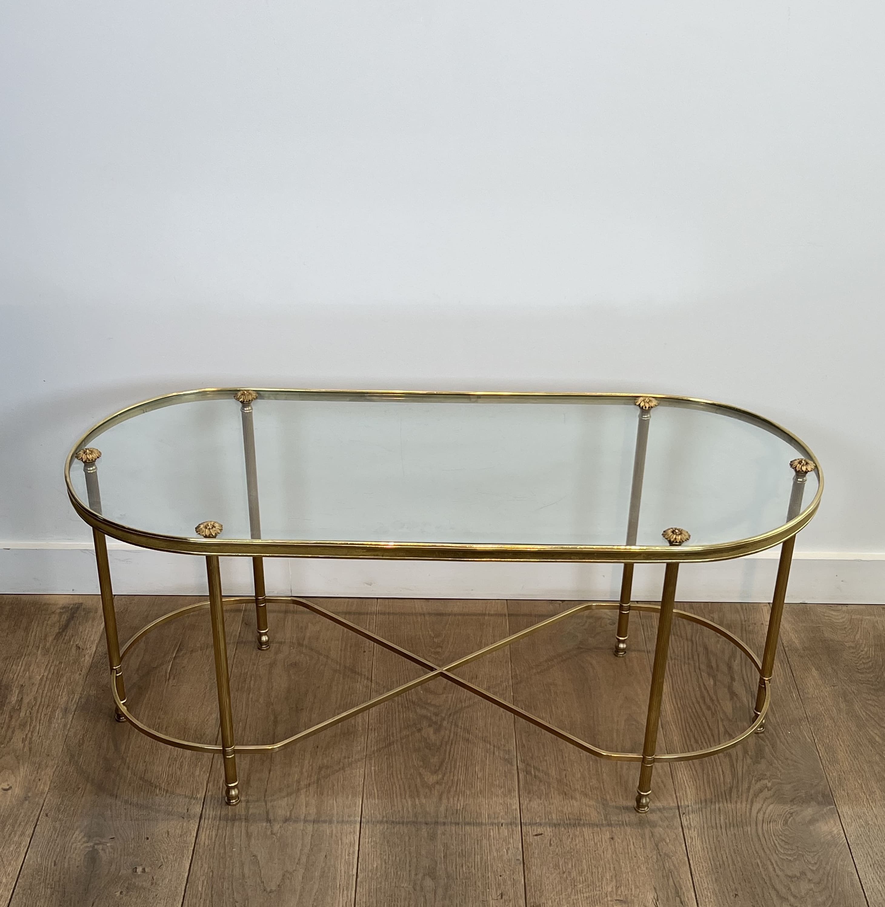 This coffee table features an architectural oblong structure made entirely of brass. The chassis rests on six vertical tubular uprights, punctuated at the bottom by turned rings and ending in small toupie feet. The rigidity and elegance of the base are ensured by a complex floor stretcher, combining a central 'X' cross and two lateral semi-circles. The upper rim, enclosing a thick clear glass plate, is accented directly above each leg by decorative cast brass rosettes. The combination of geometric rigor, the neoclassical repertoire (X-stretcher, turned rings, rosettes), and the nobility of brass stylistically links this table to the prestigious productions of Maison Baguès. Founded in Paris in the 19th century, this manufactory is the absolute benchmark in the art of gilded bronze and brass in France. In the 1950s and 1960s, responding to the popularity of the Hollywood Regency movement, Baguès produced a series of coffee tables and serving carts blending the finesse of metal with the transparency of glass, commissioned by top international decorators for prestigious residences. Good overall condition. The brass structure displays natural oxidation and an even patina of use, attesting to its age. The original glass top shows likely minor surface scratches inherent to normal use.