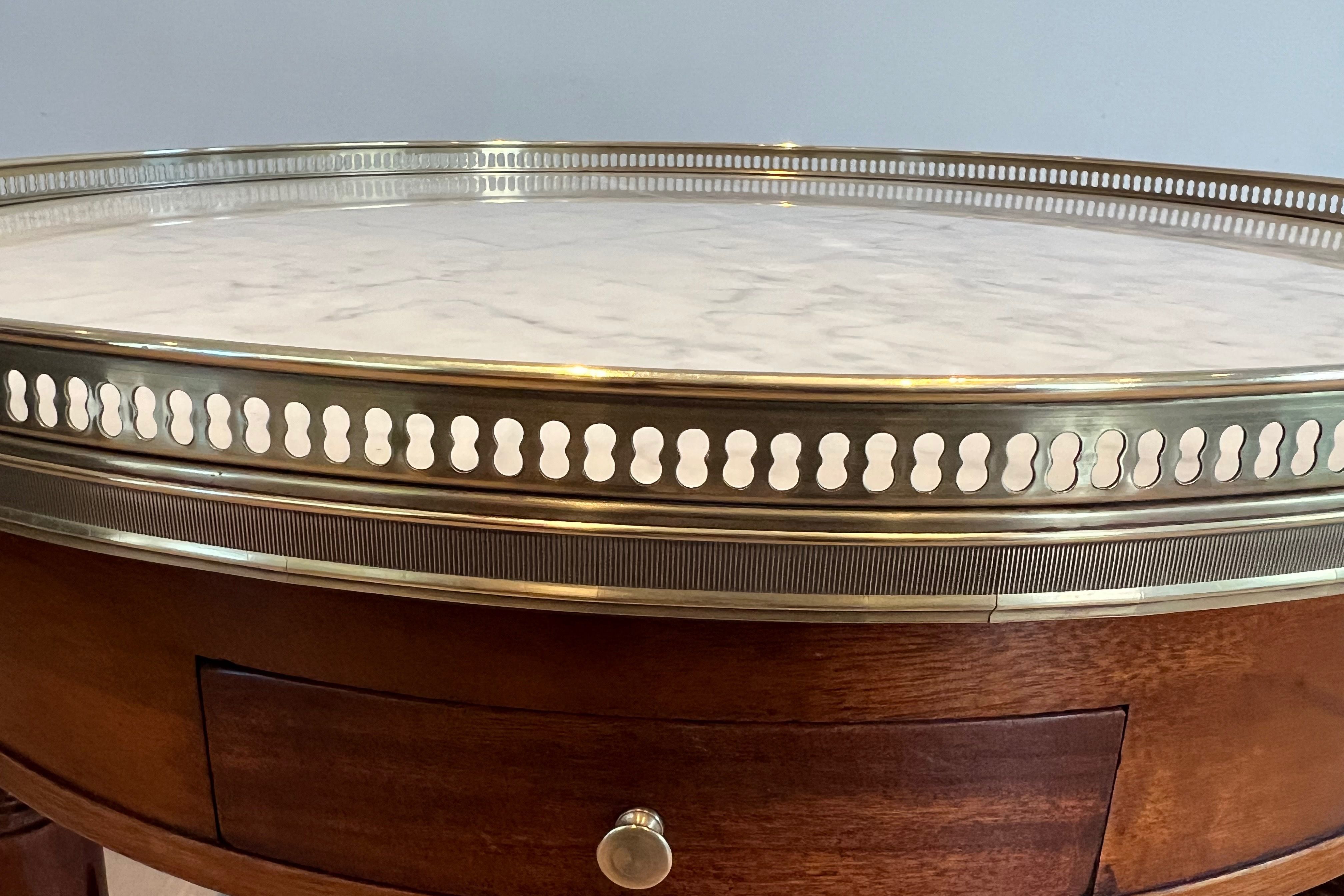 Neoclassical style mahogany round coffee table with Carrara marble top surrounded by an openwork brass gallery. The pedestal table has 2 drawers and 2 leather-trimmed pulls. French work. Circa 1940