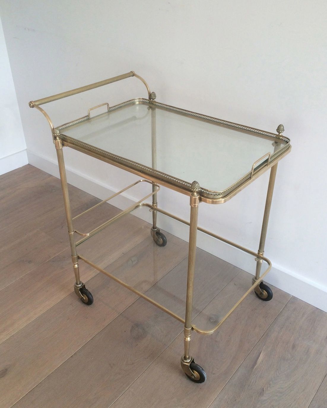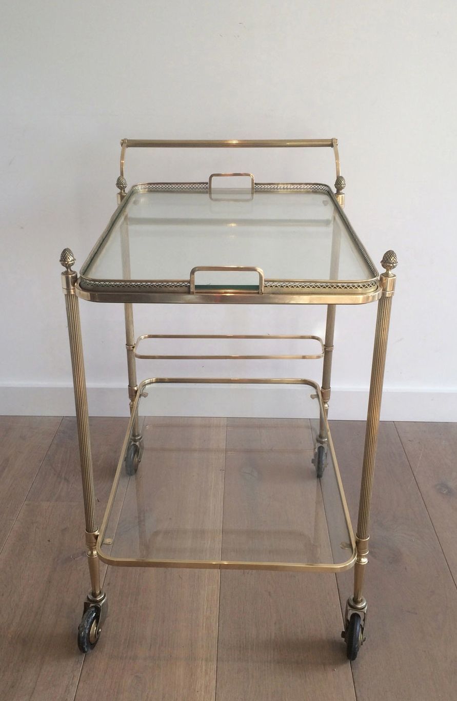 Neoclassical Brass Drinks Trolley with 2 Clear Glass Shelves. French Work by Maison Bagués. Circa 1940