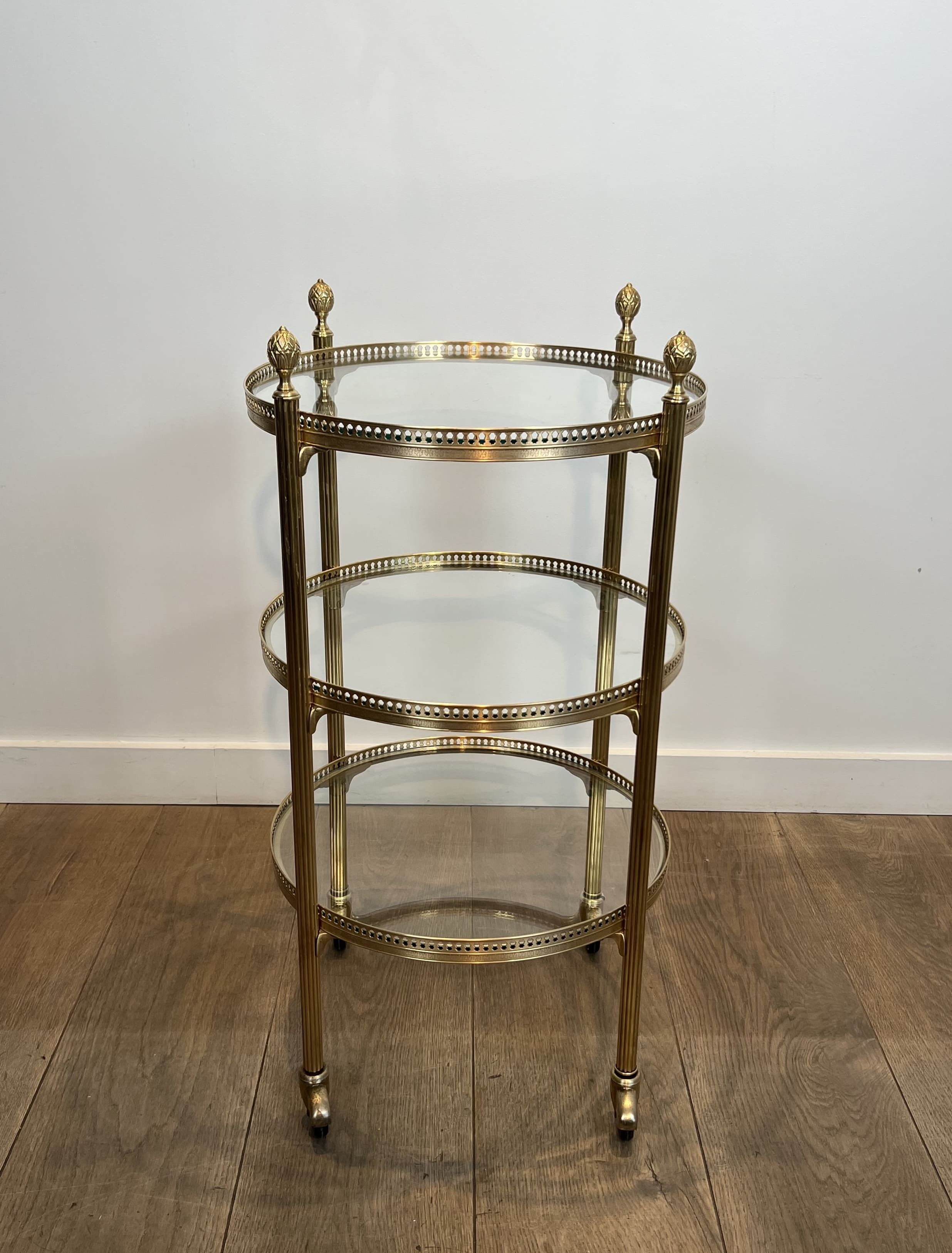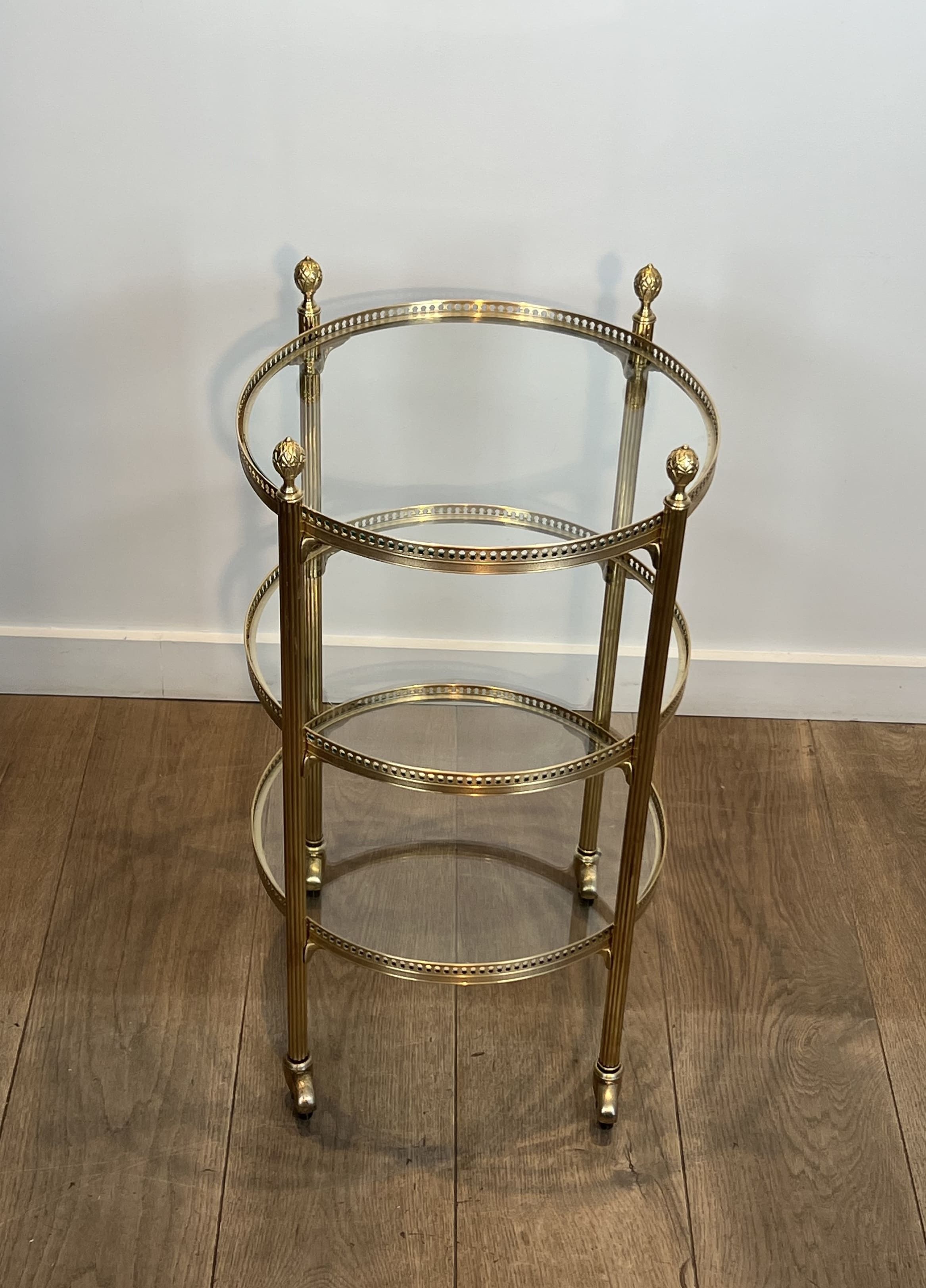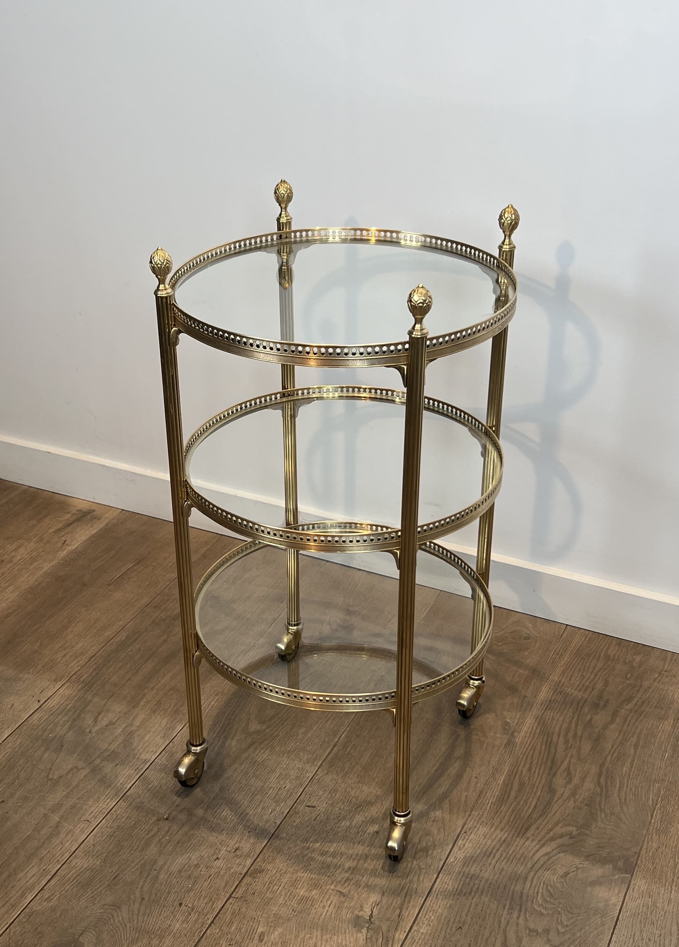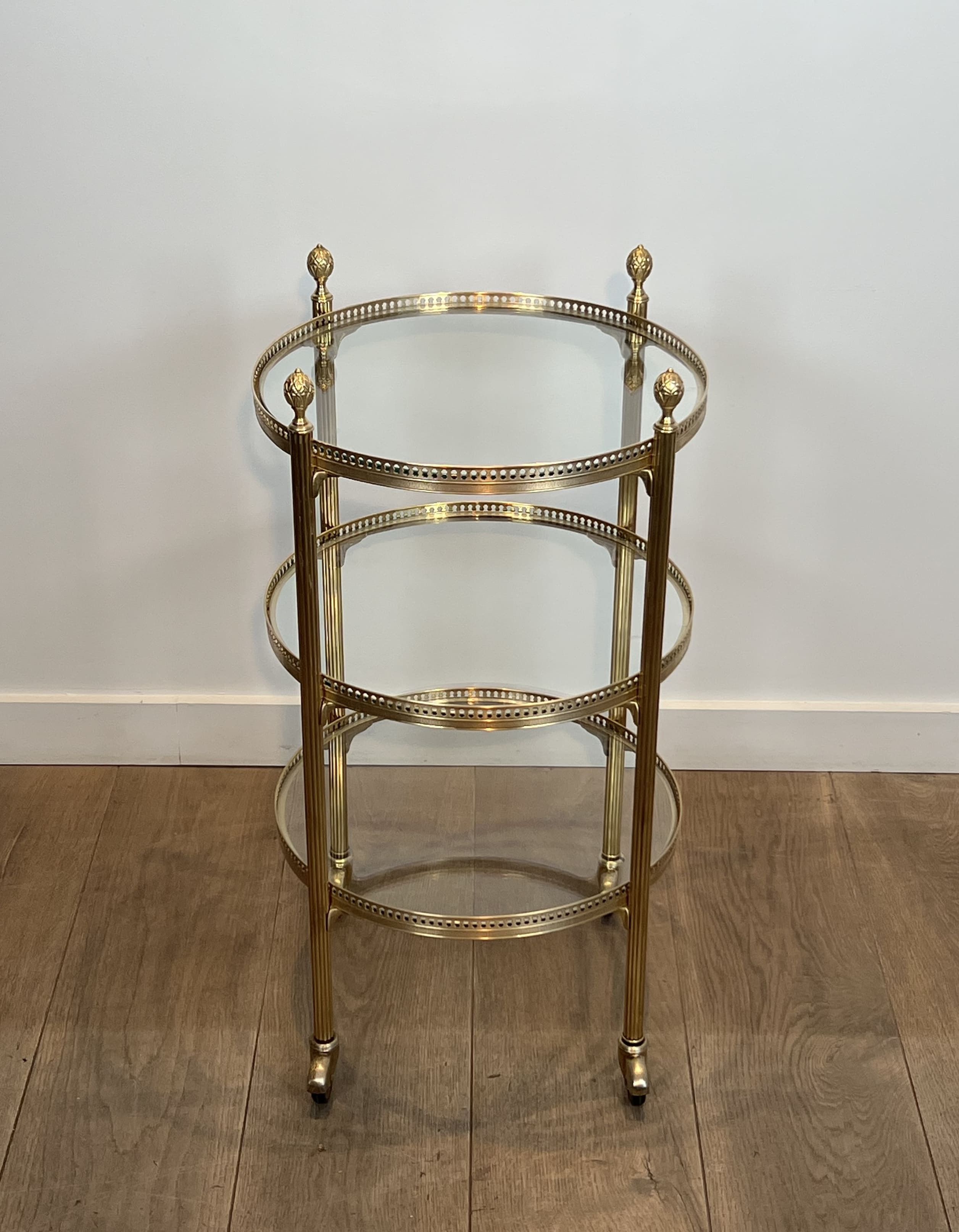 This circular serving furniture is a three-tier rolling table, highly representative of mid-20th-century Parisian high-end metalwork. The architectural structure, made entirely of solid brass, revolves around slender tubular uprights. These shafts terminate in directional casters at the base and are crowned with turned finials at the top. Three clear glass tiers fit into circular frames, enclosed by rigorous pierced brass galleries featuring a vertical bar motif, ensuring objects remain secure during movement. The combination of the geometric rigor of the pierced galleries, the balance of proportions, and the nobility of polished brass allows this serving cart to be formally attributed to Maison Jansen. Founded in Paris in 1880, Maison Jansen remained the international benchmark for high-end interior decoration for nearly a century. Under the direction of Stéphane Boudin in the mid-20th century, the house excelled in reinterpreting Directoire and Empire styles. Good overall condition with natural oxidation and even patina of use. With its contained diameter of 45.5 cm, this bar cart with highly vertical proportions will elegantly anchor the space of a classic or contemporary living room.