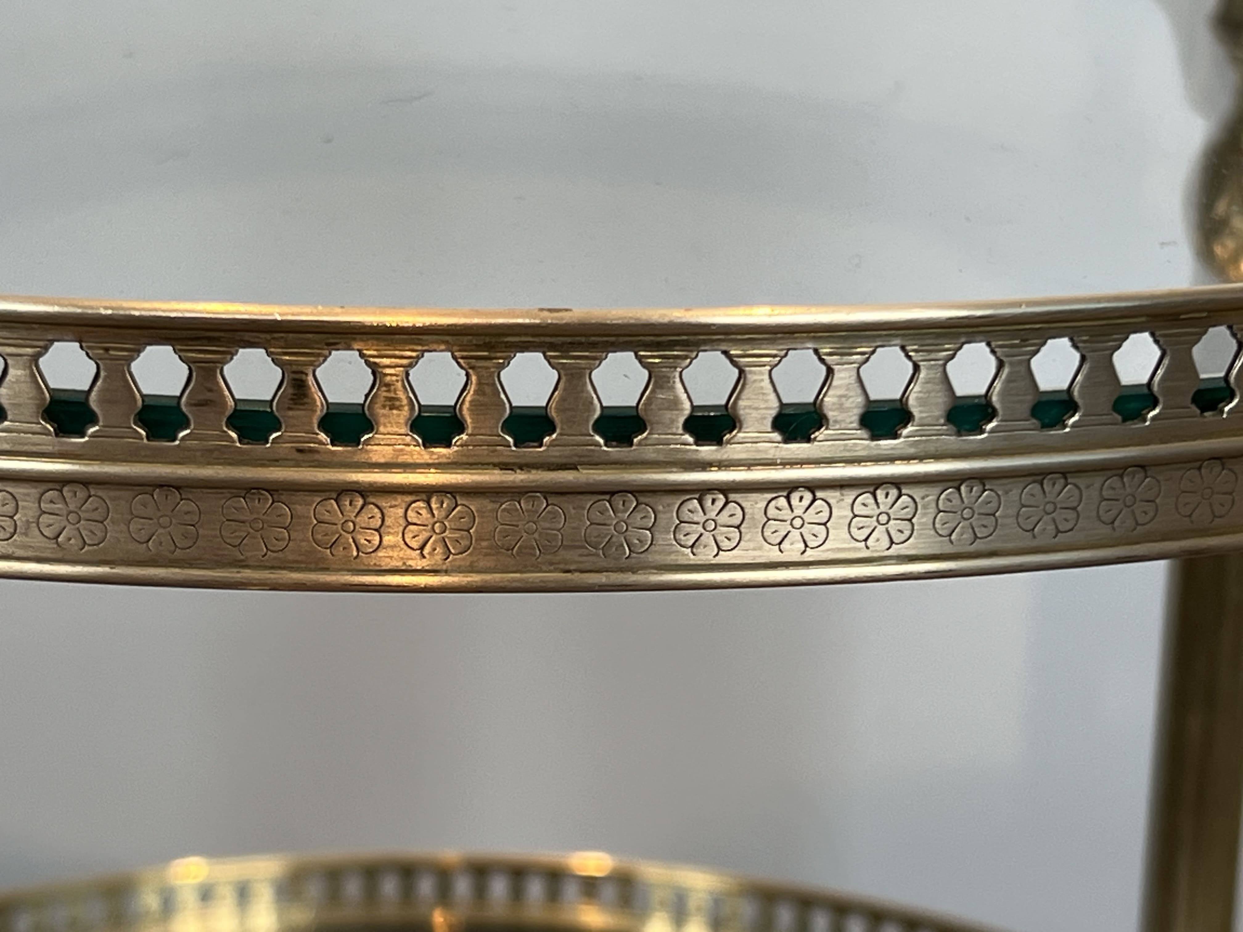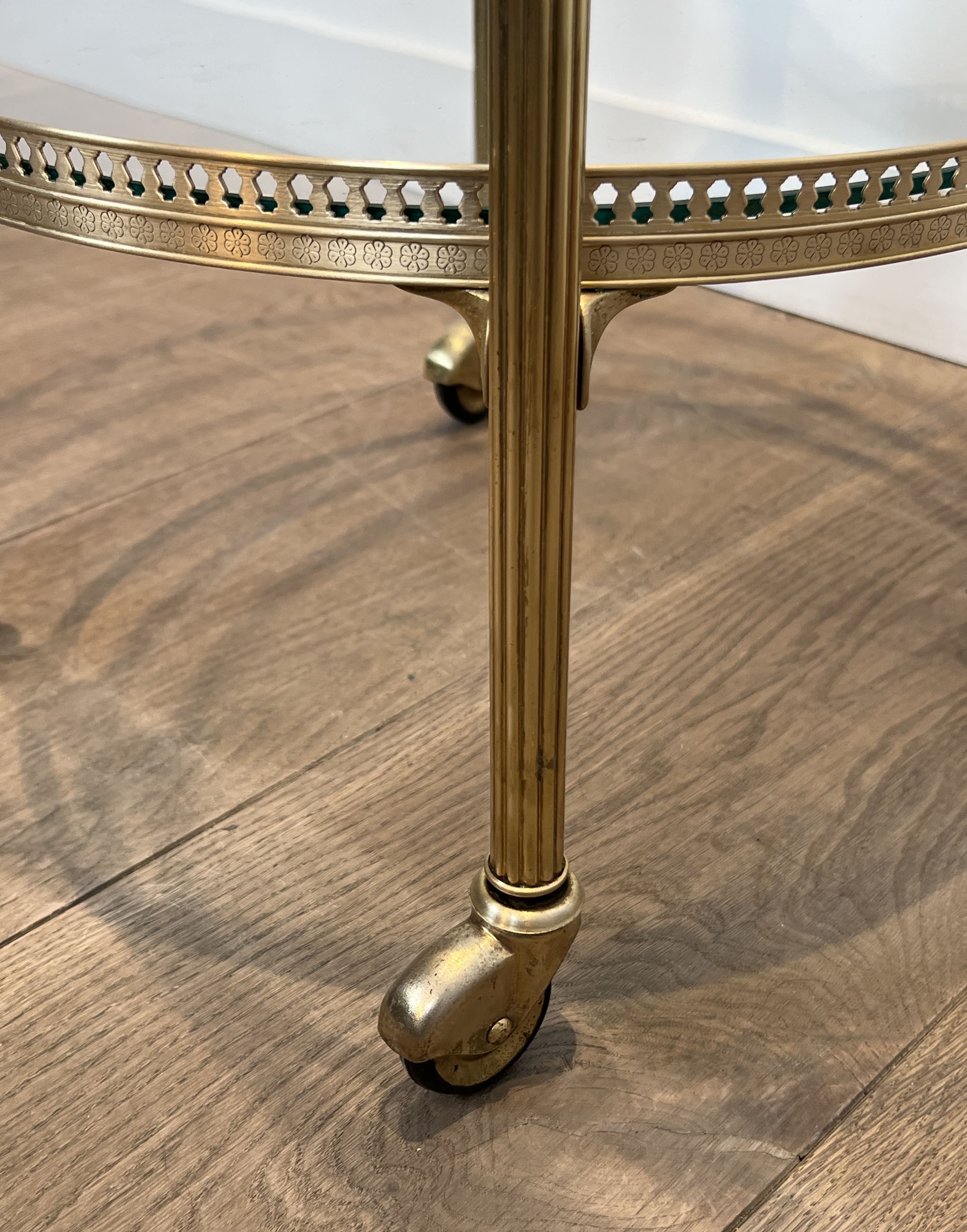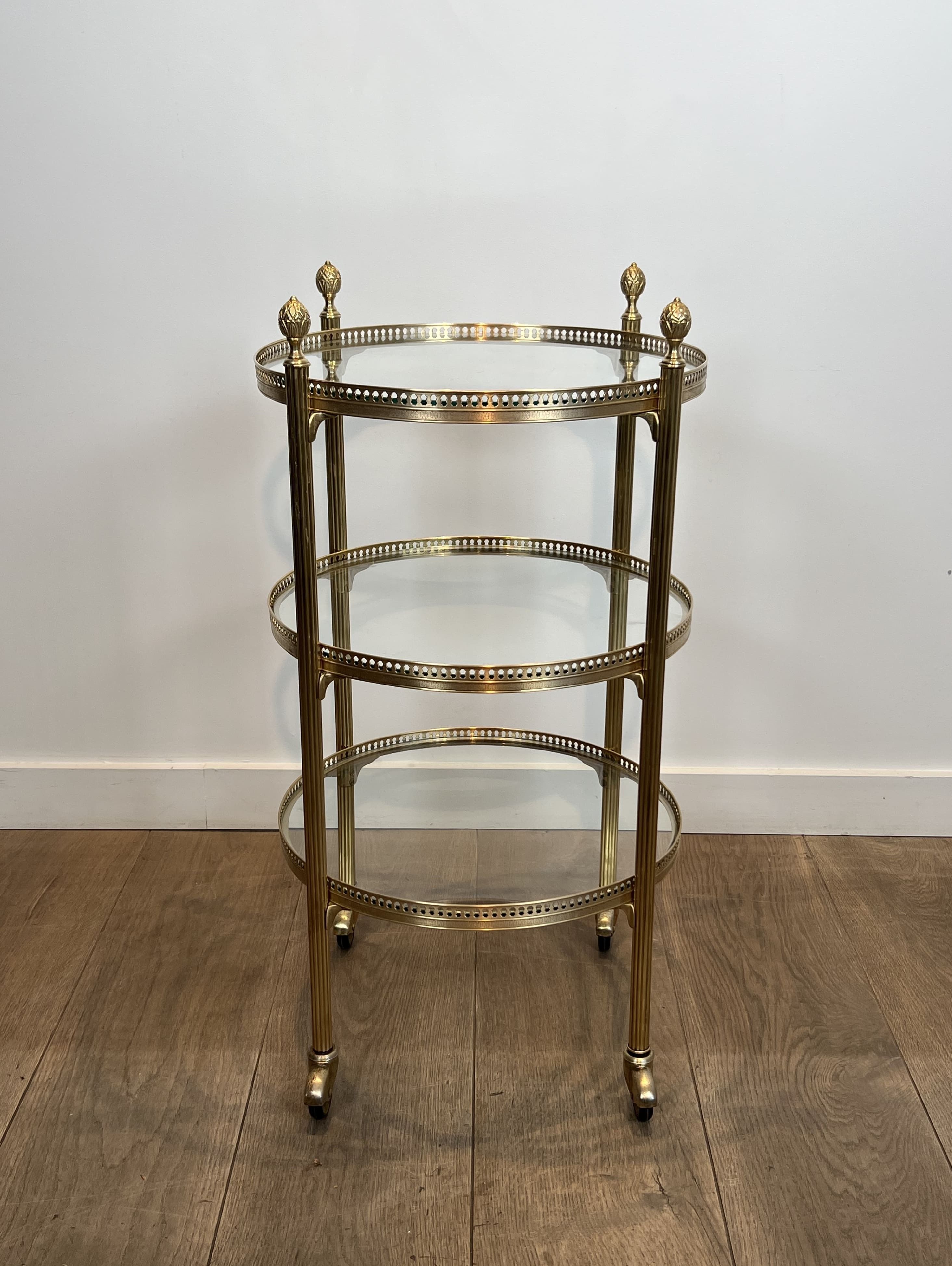 This circular serving furniture is a three-tier rolling table, highly representative of mid-20th-century Parisian high-end metalwork. The architectural structure, made entirely of solid brass, revolves around slender tubular uprights. These shafts terminate in directional casters at the base and are crowned with turned finials at the top. Three clear glass tiers fit into circular frames, enclosed by rigorous pierced brass galleries featuring a vertical bar motif, ensuring objects remain secure during movement. The combination of the geometric rigor of the pierced galleries, the balance of proportions, and the nobility of polished brass allows this serving cart to be formally attributed to Maison Jansen. Founded in Paris in 1880, Maison Jansen remained the international benchmark for high-end interior decoration for nearly a century. Under the direction of Stéphane Boudin in the mid-20th century, the house excelled in reinterpreting Directoire and Empire styles. Good overall condition with natural oxidation and even patina of use. With its contained diameter of 45.5 cm, this bar cart with highly vertical proportions will elegantly anchor the space of a classic or contemporary living room.