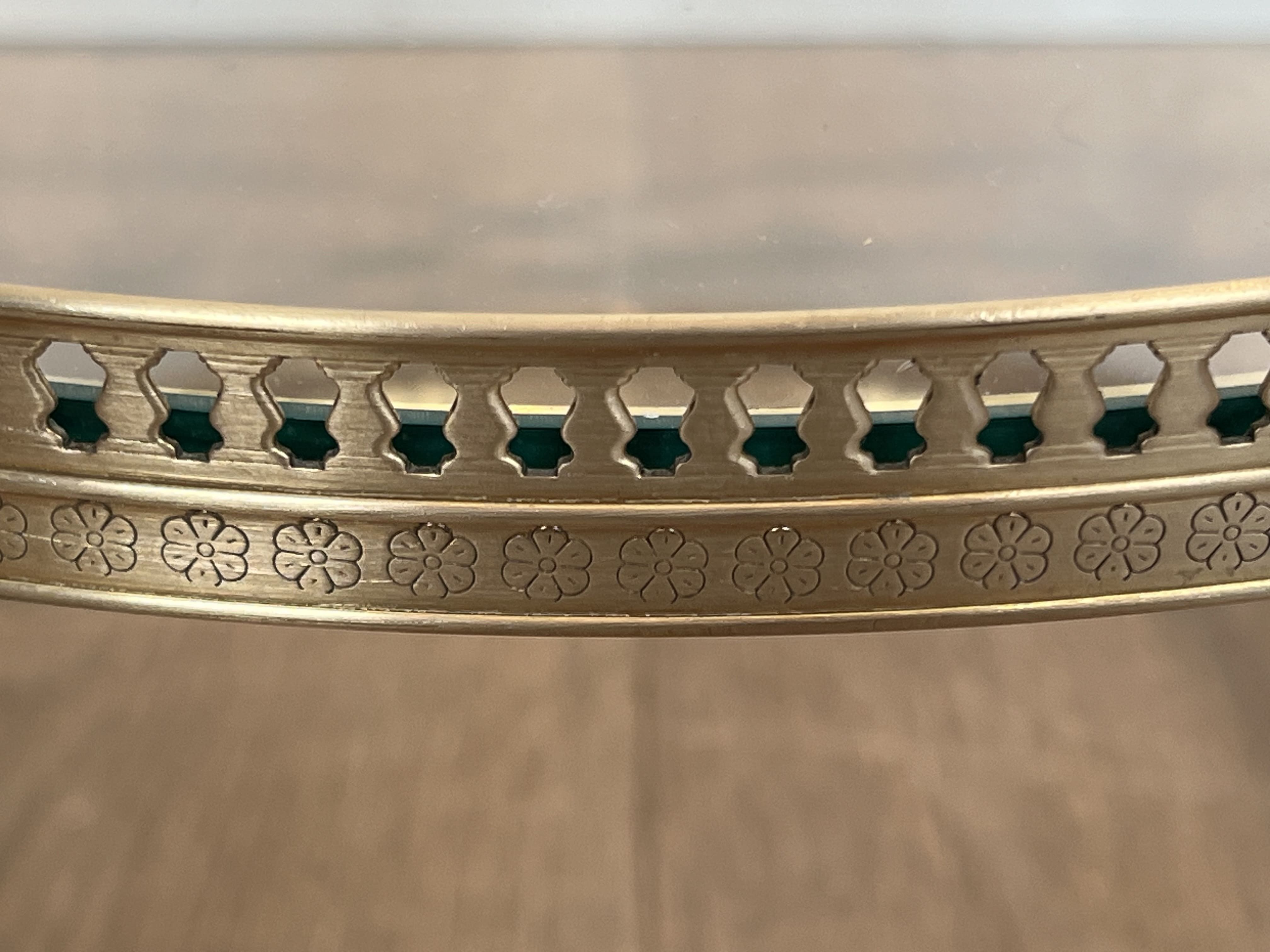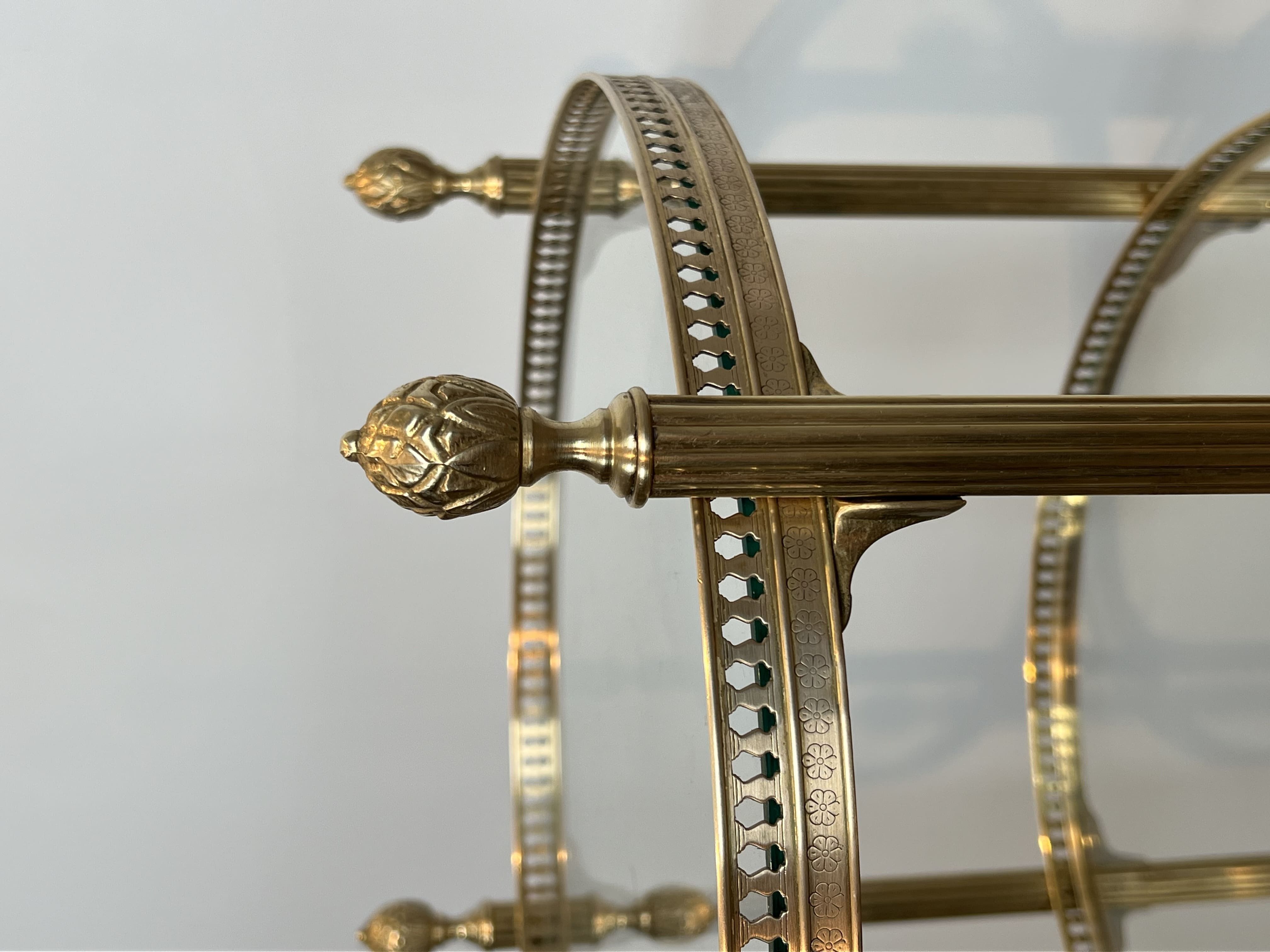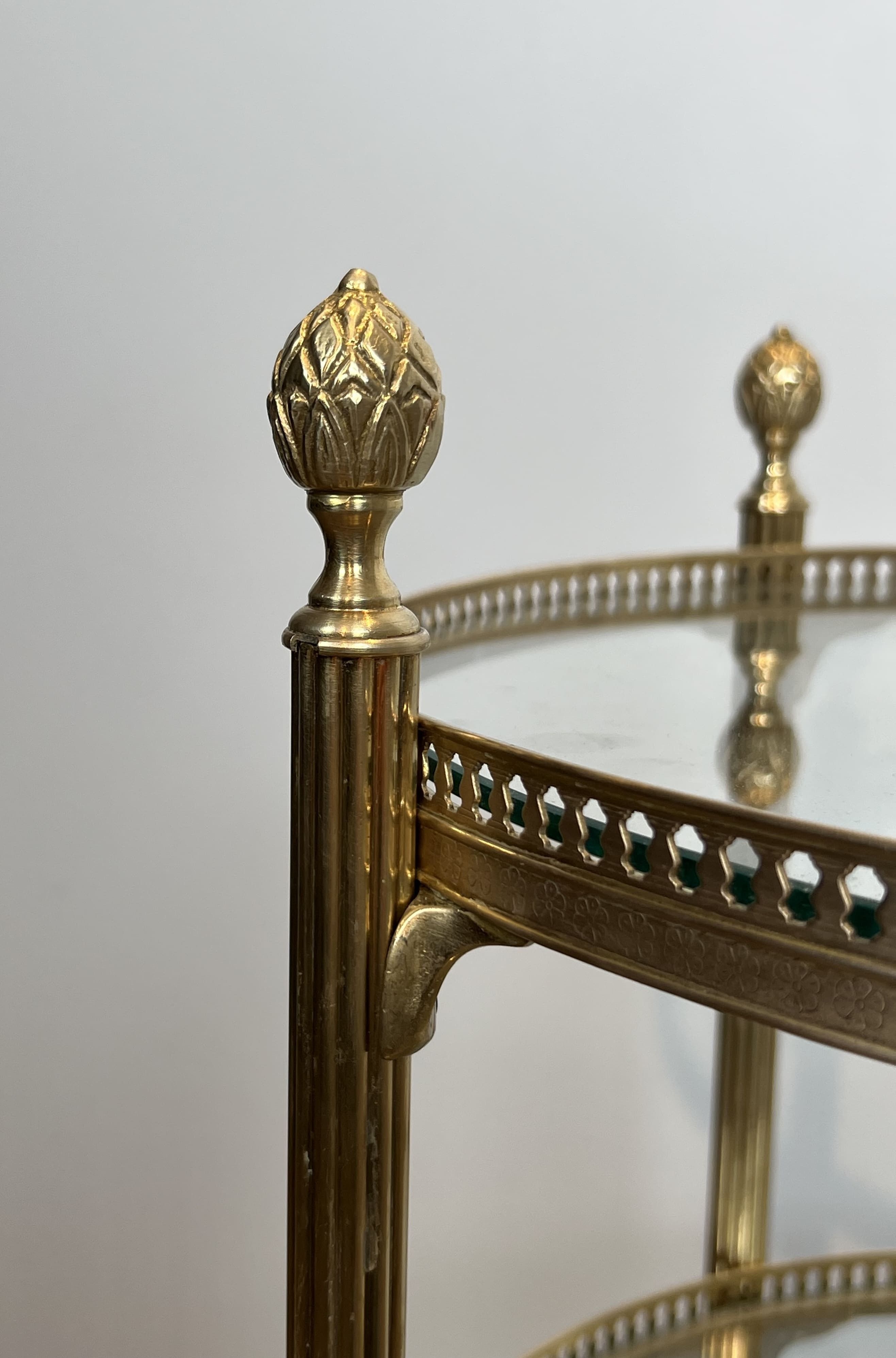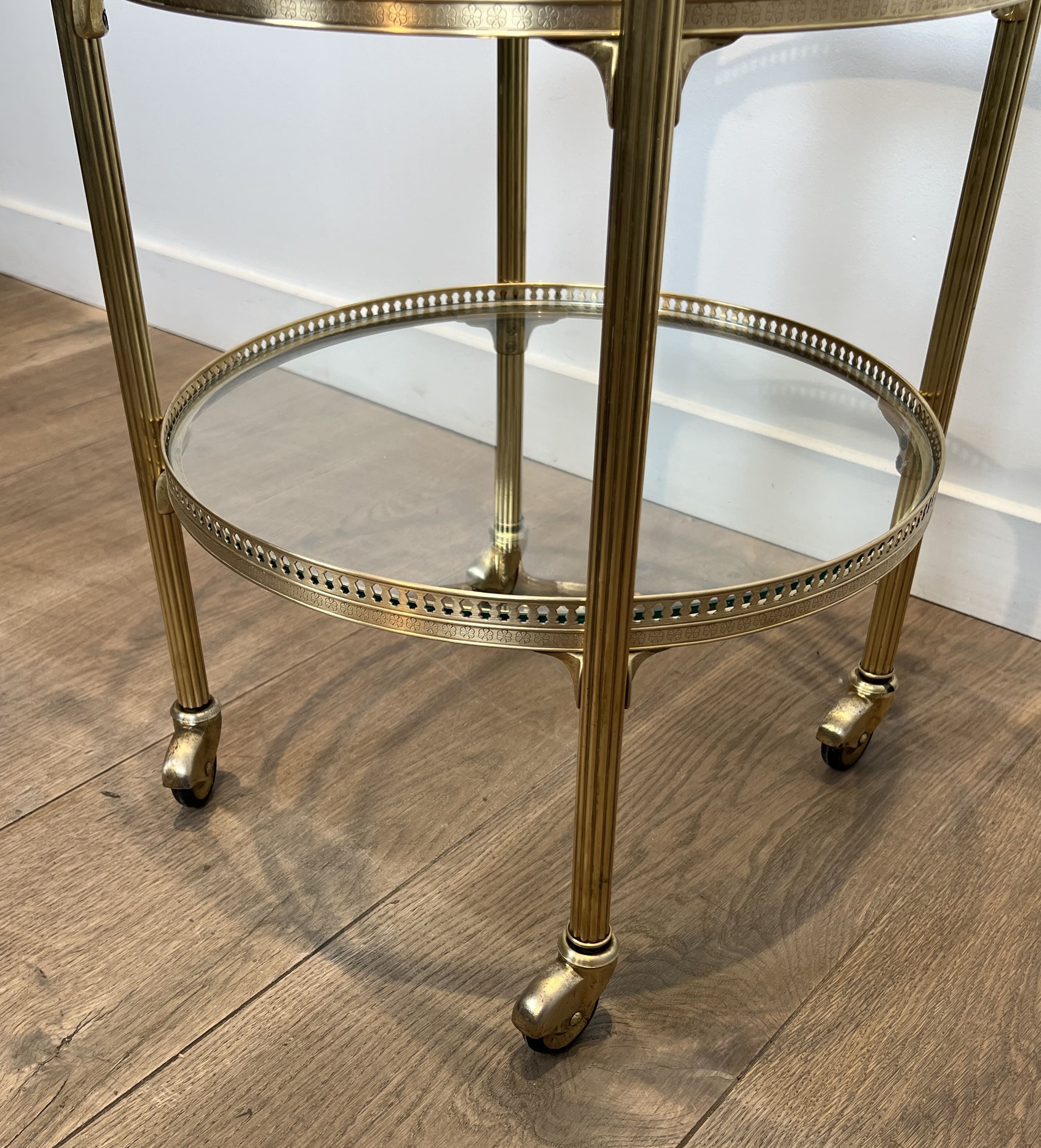 This circular serving furniture is a three-tier rolling table, highly representative of mid-20th-century Parisian high-end metalwork. The architectural structure, made entirely of solid brass, revolves around slender tubular uprights. These shafts terminate in directional casters at the base and are crowned with turned finials at the top. Three clear glass tiers fit into circular frames, enclosed by rigorous pierced brass galleries featuring a vertical bar motif, ensuring objects remain secure during movement. The combination of the geometric rigor of the pierced galleries, the balance of proportions, and the nobility of polished brass allows this serving cart to be formally attributed to Maison Jansen. Founded in Paris in 1880, Maison Jansen remained the international benchmark for high-end interior decoration for nearly a century. Under the direction of Stéphane Boudin in the mid-20th century, the house excelled in reinterpreting Directoire and Empire styles. Good overall condition with natural oxidation and even patina of use. With its contained diameter of 45.5 cm, this bar cart with highly vertical proportions will elegantly anchor the space of a classic or contemporary living room.