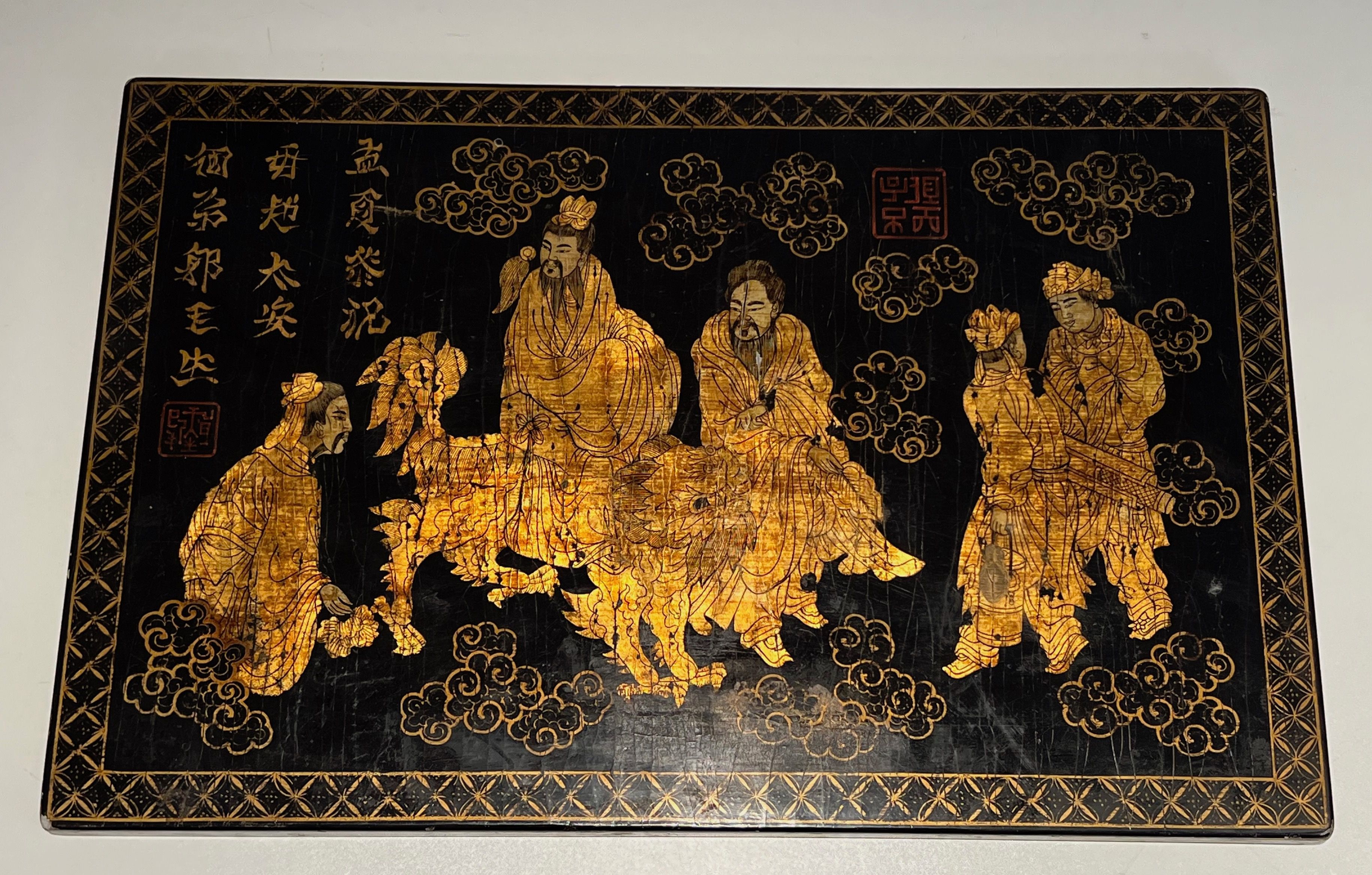 Lacquer and gilding painting on a wooden panel representing Chinese characters, one of them riding a dragon. The scene is surrounded by stylized floral motifs and Chinese inscriptions. French work. Circa 1970