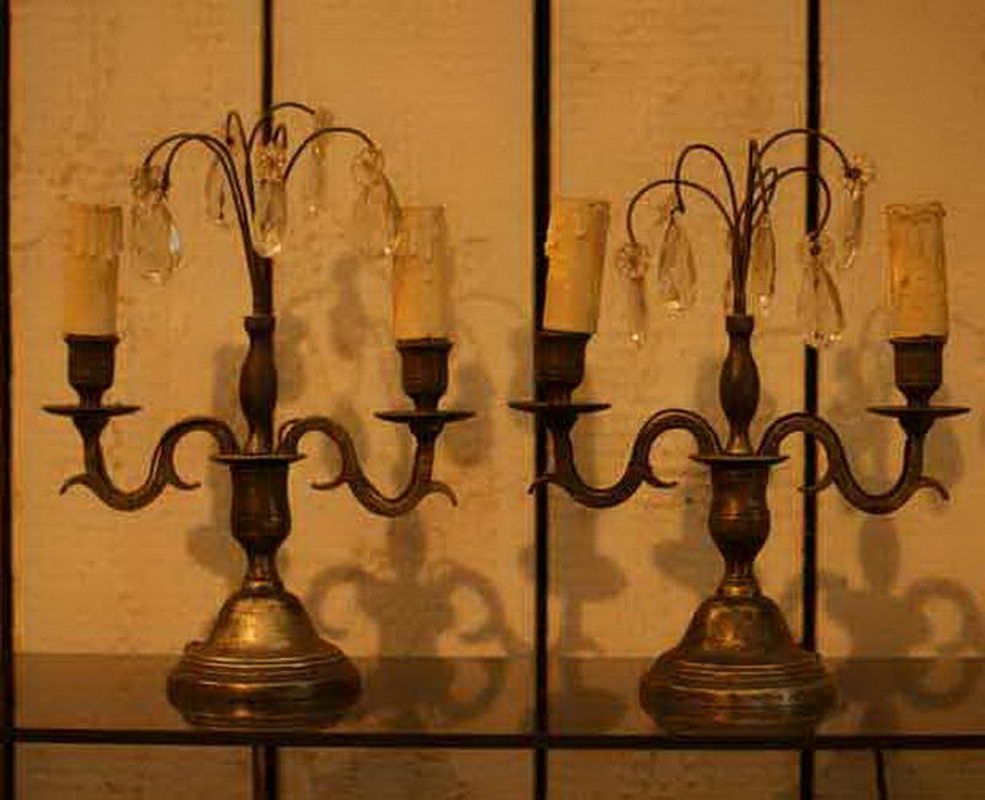 TL (193) Ancienne paire de girandolles en bronze et verrePaire de girandoles en bronze et cristauxRequest priceDimensionsWidth9.06 inch23 cmHeight11.42 inch29 cm