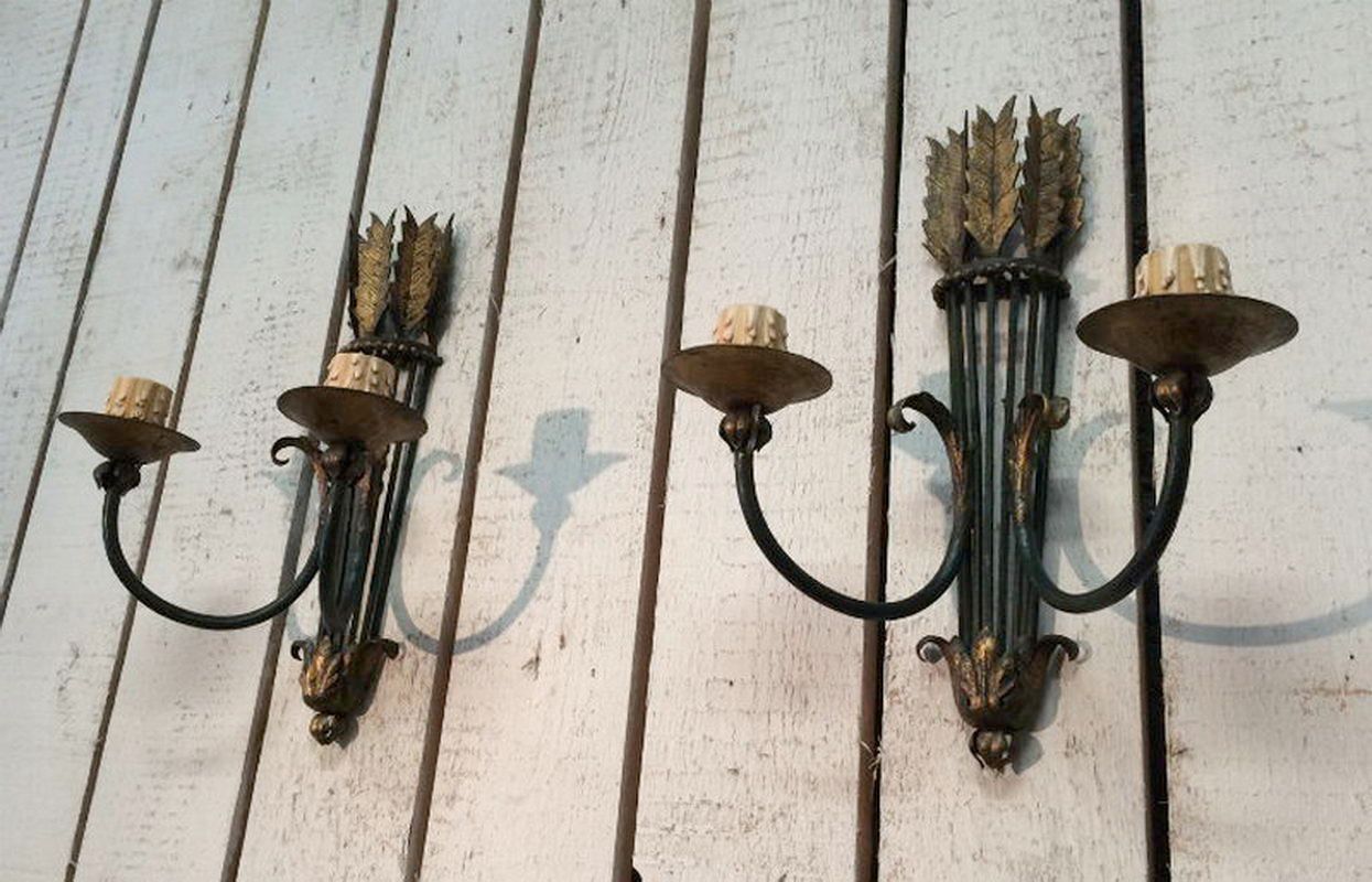 Beautiful pair of wrought iron wall sconces. Circa 1940S-904 : Beautiful pair of wrought iron wall sconces. Circa 1940Request priceDimensionsWidth12.6 inch32 cmDepth7.87 inch20 cmHeight15.75 inch40 cmInformationProduct codeS-904
