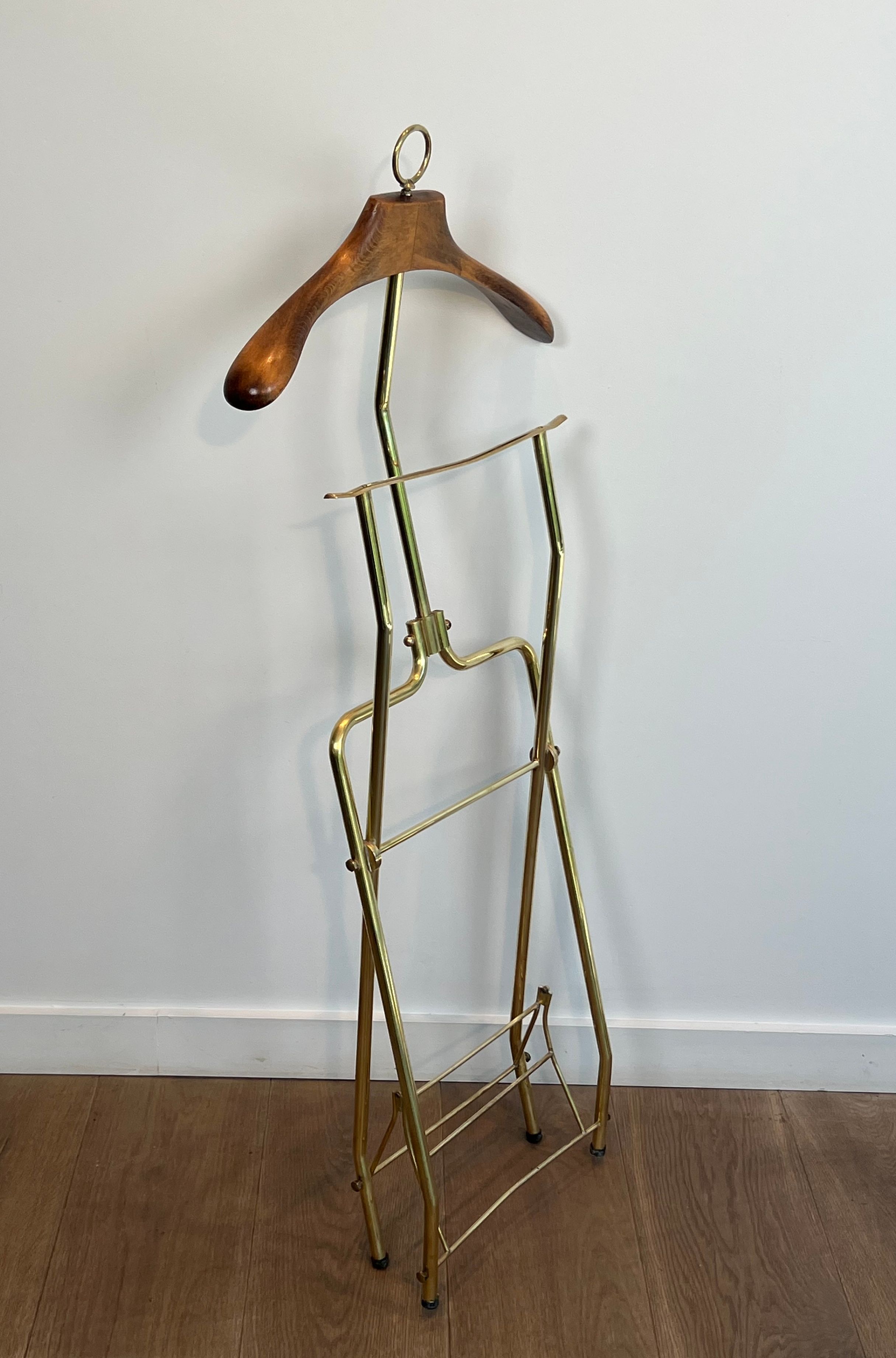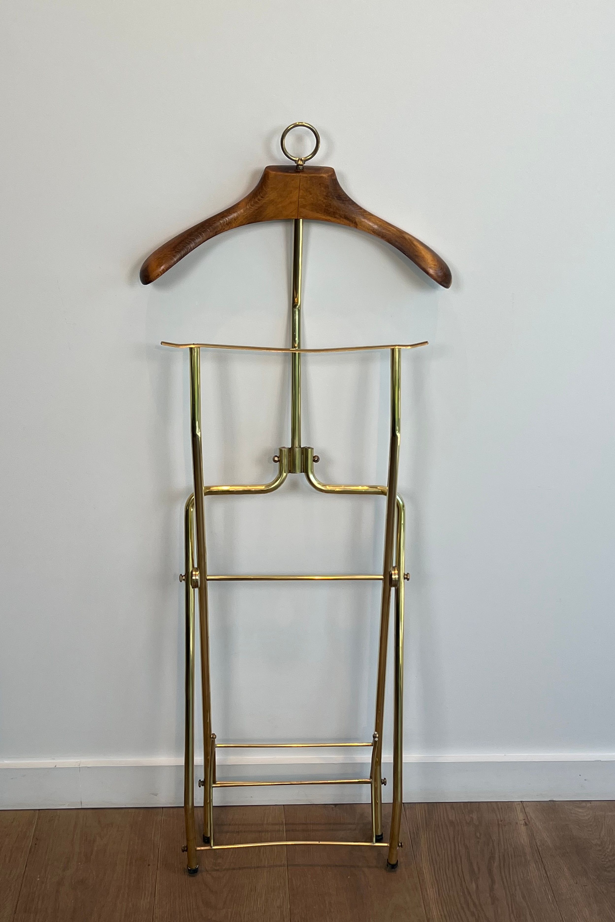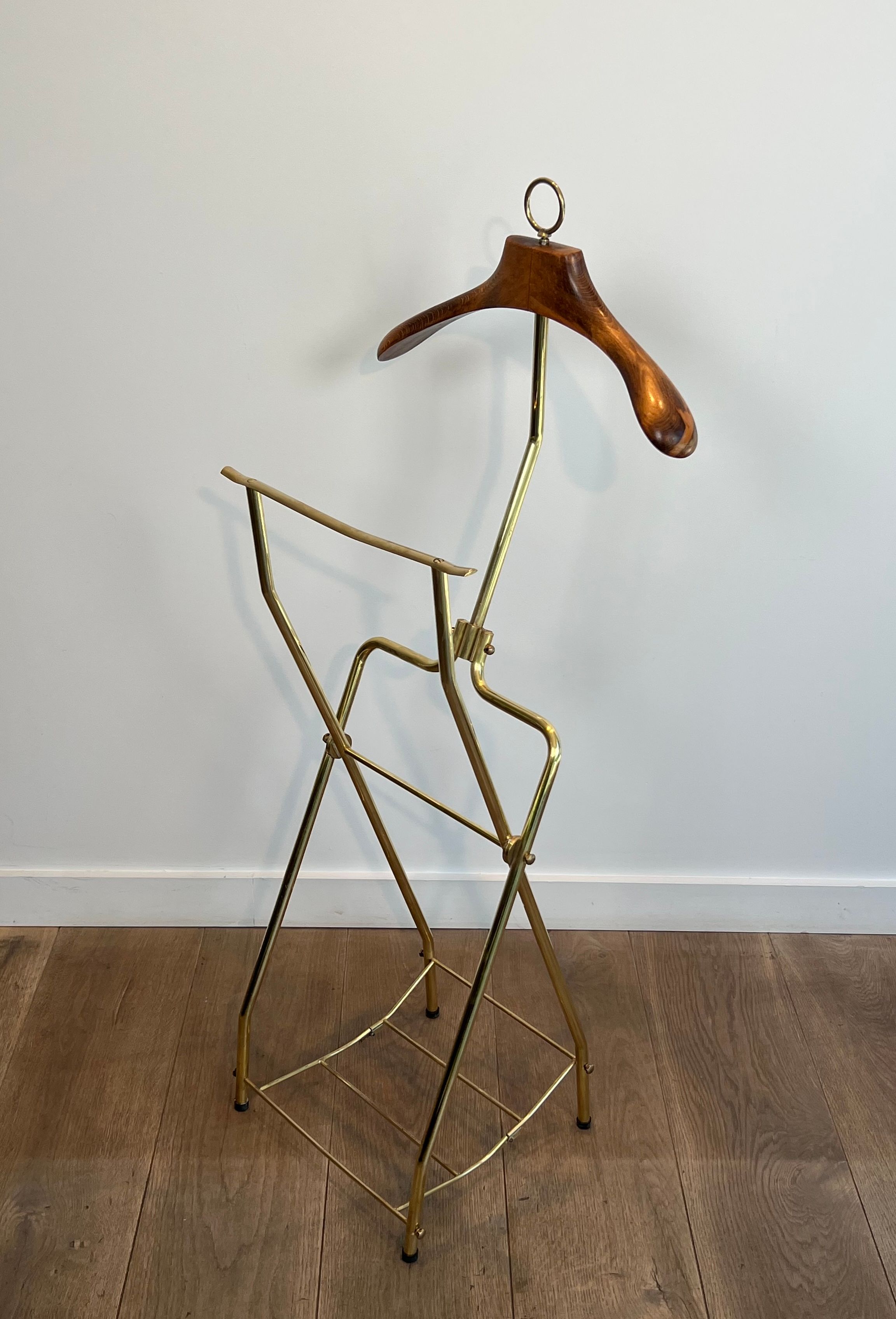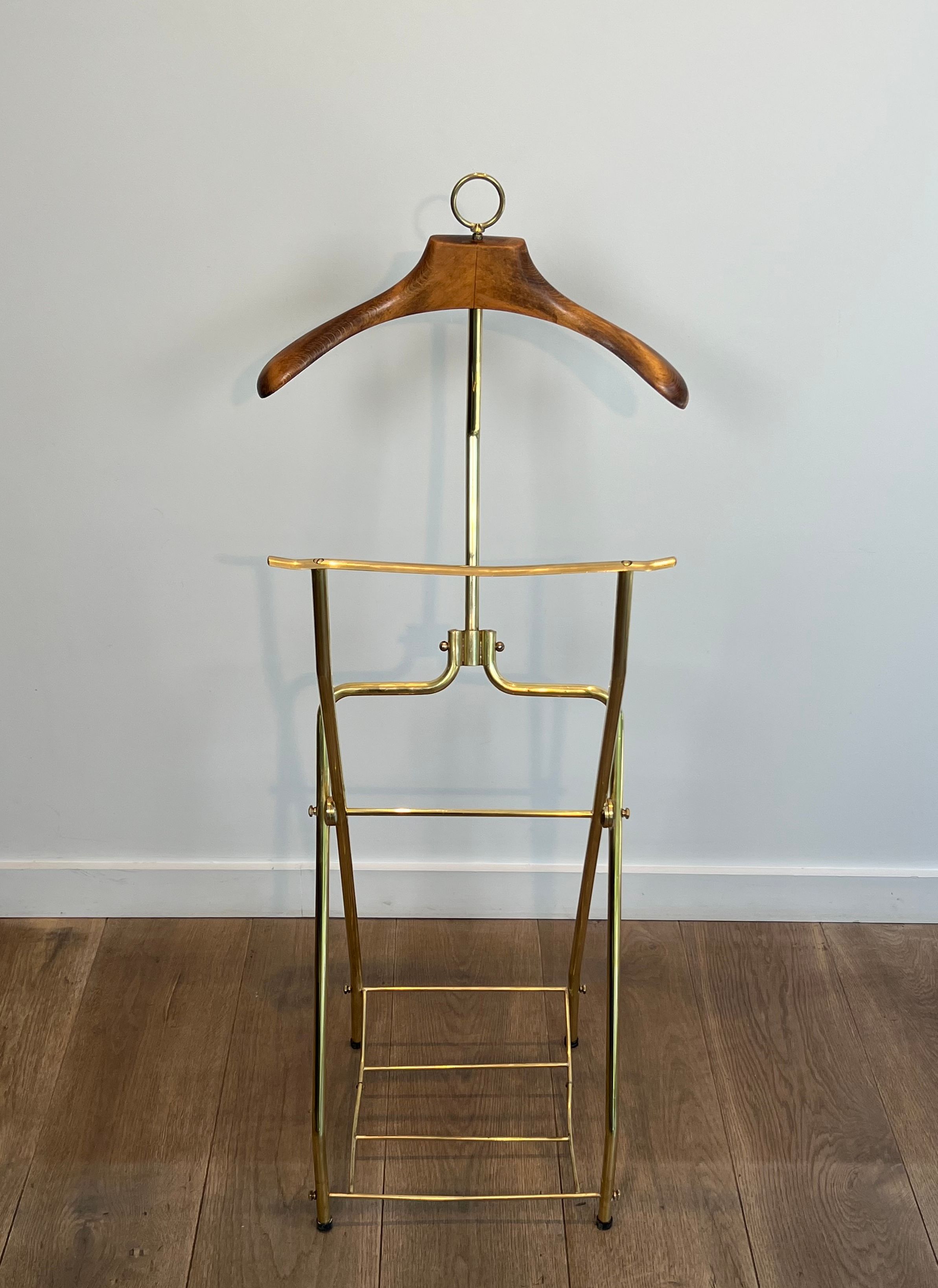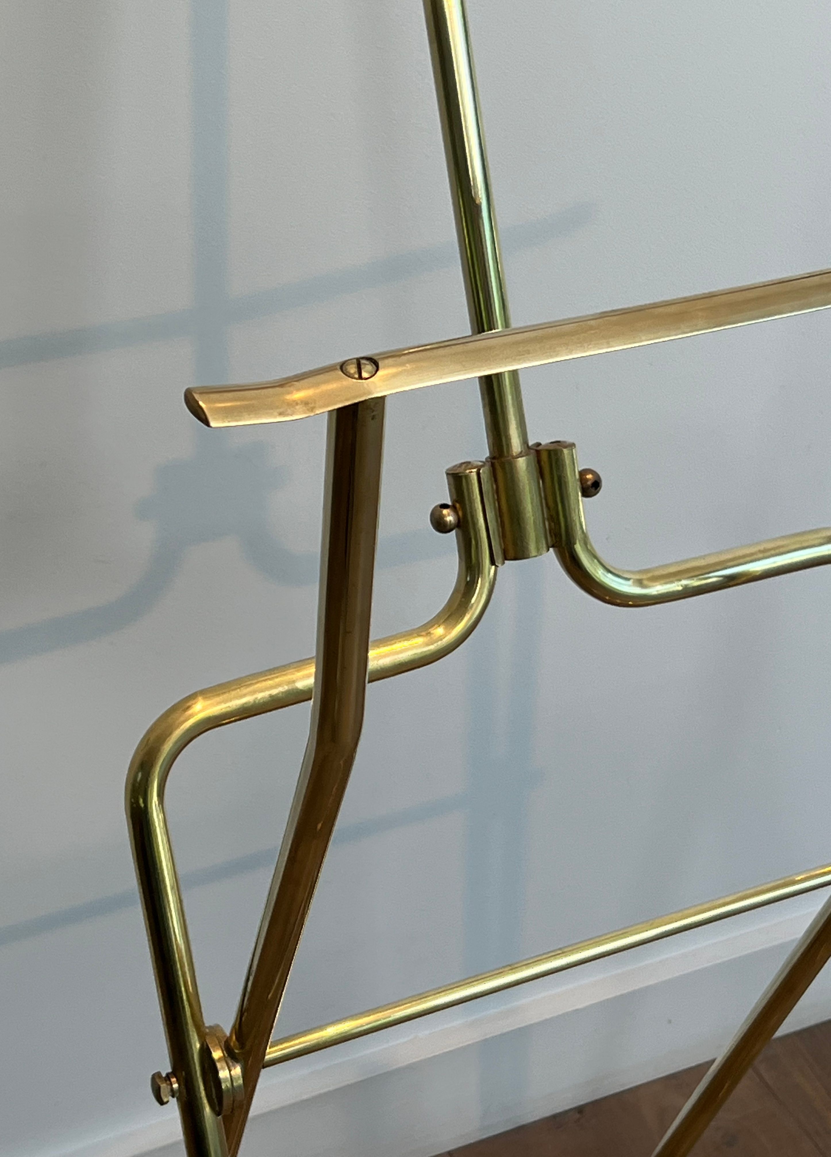 Neoclassical style folding brass and wood valet with tripode base on casters. French. Circa 1940
