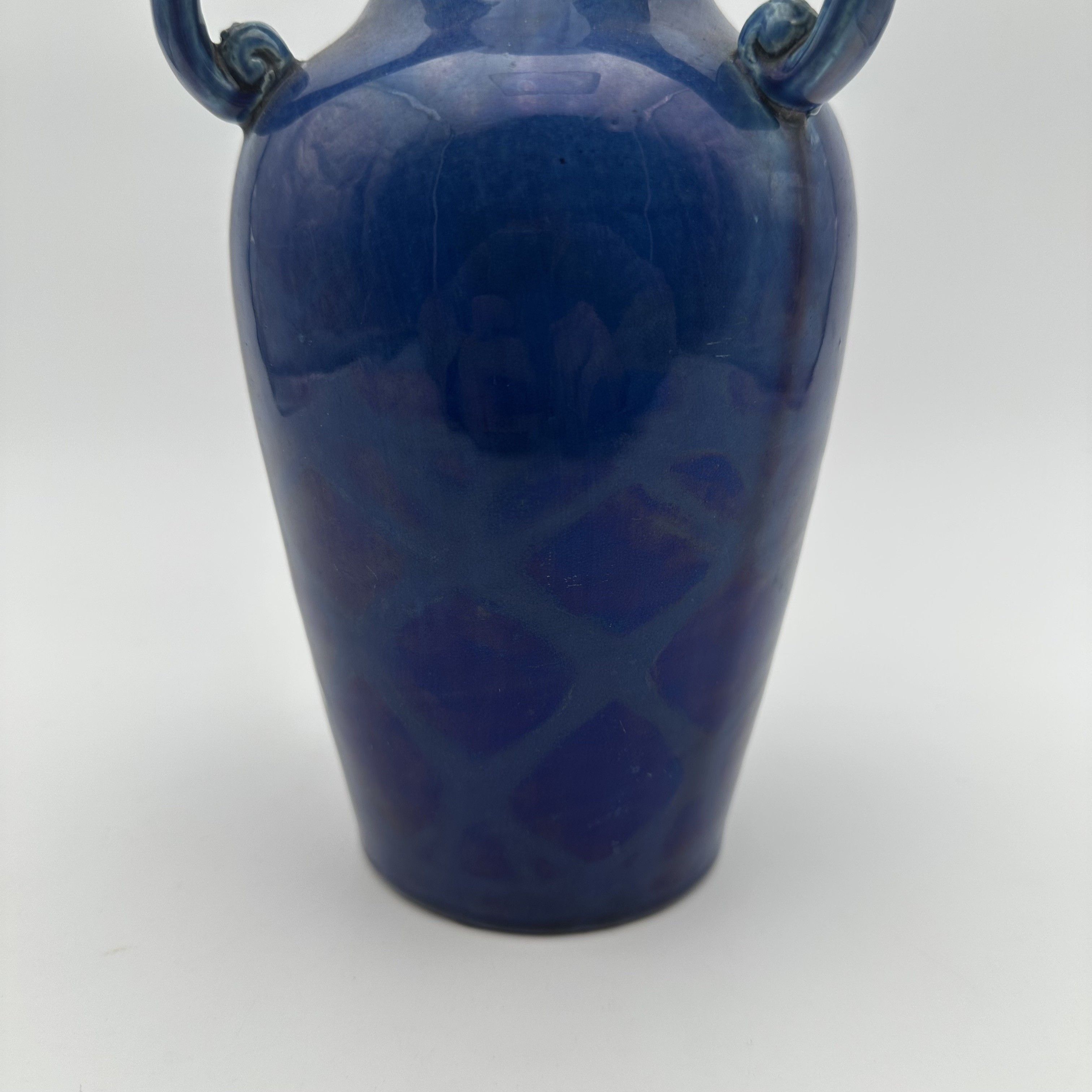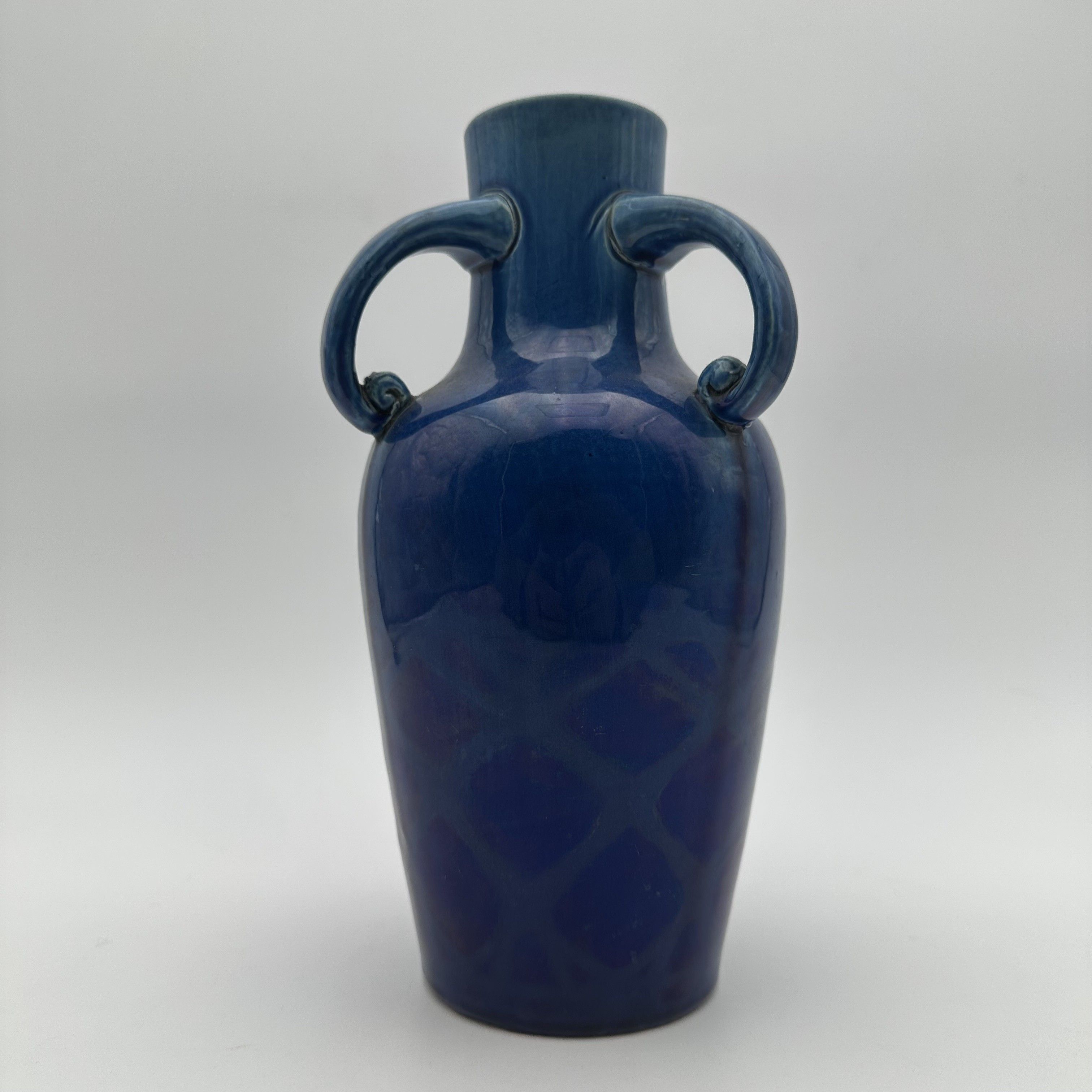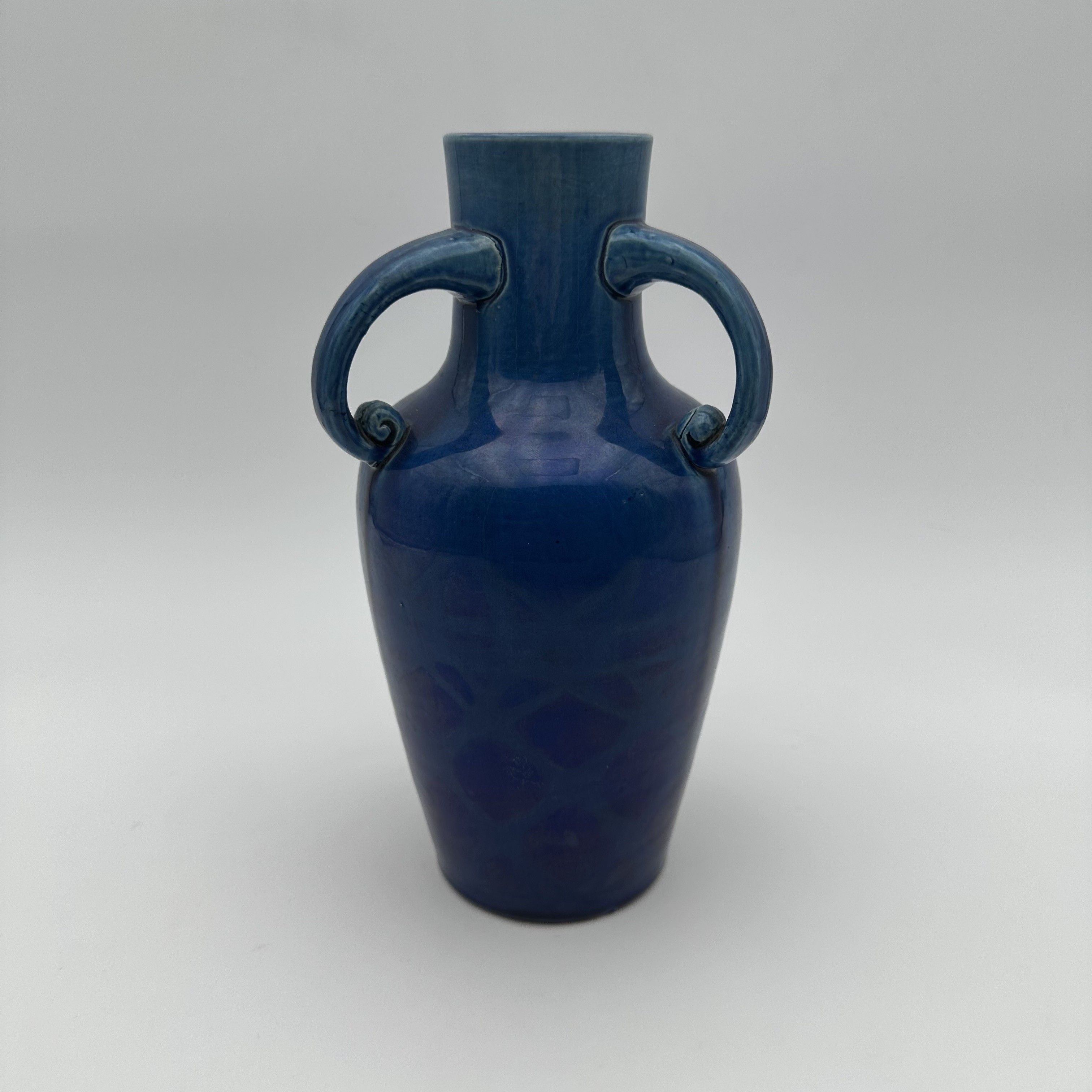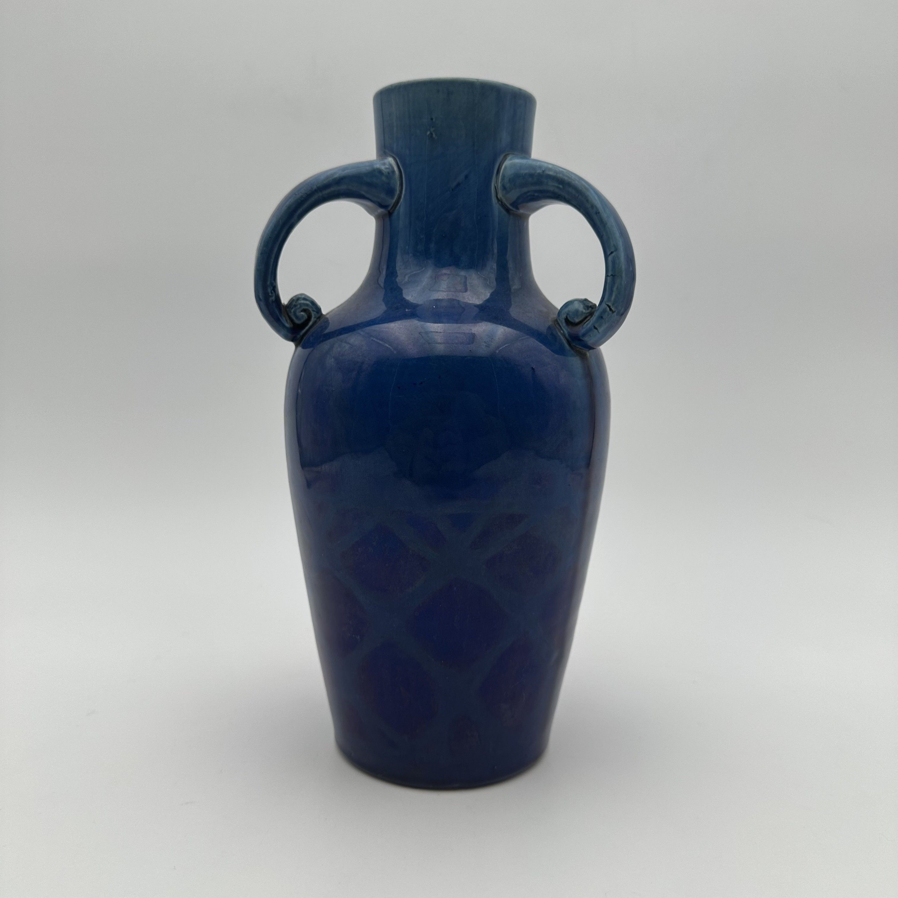This highly elegant ceramic vase is a perfect illustration of the refinement of the fire arts during the Art Deco period. Moving away from the overloaded floral decors of Art Nouveau, ceramists of the 1920s and 1930s favored a return to stylized antique forms and gave primacy to the striking beauty of monochrome glazes. Standing 25.5 cm tall, the piece adopts a classic amphora silhouette, flanked by two charming symmetrical handles ending in delicate scrolls. The true magic of the object lies in its glaze: an intense, deep cobalt blue enamel that catches the light beautifully. Upon close inspection of the lower part of the body, one discovers a subtle molded geometric relief decor evoking a scale or honeycomb pattern, revealed by the natural pooling and nuances of the glaze during firing. Offered in beautiful vintage condition, this vibrantly colored vase possesses an undeniable decorative presence.