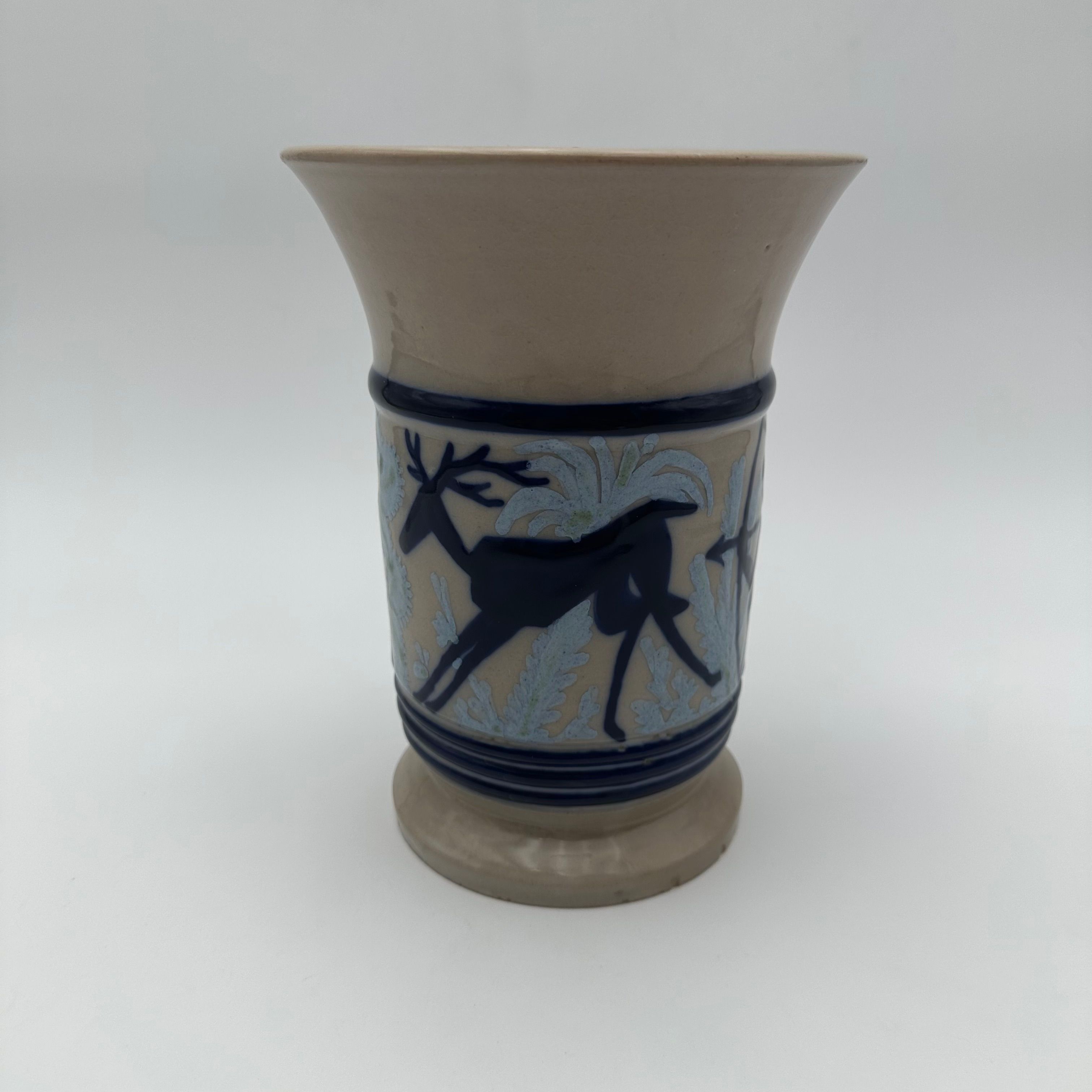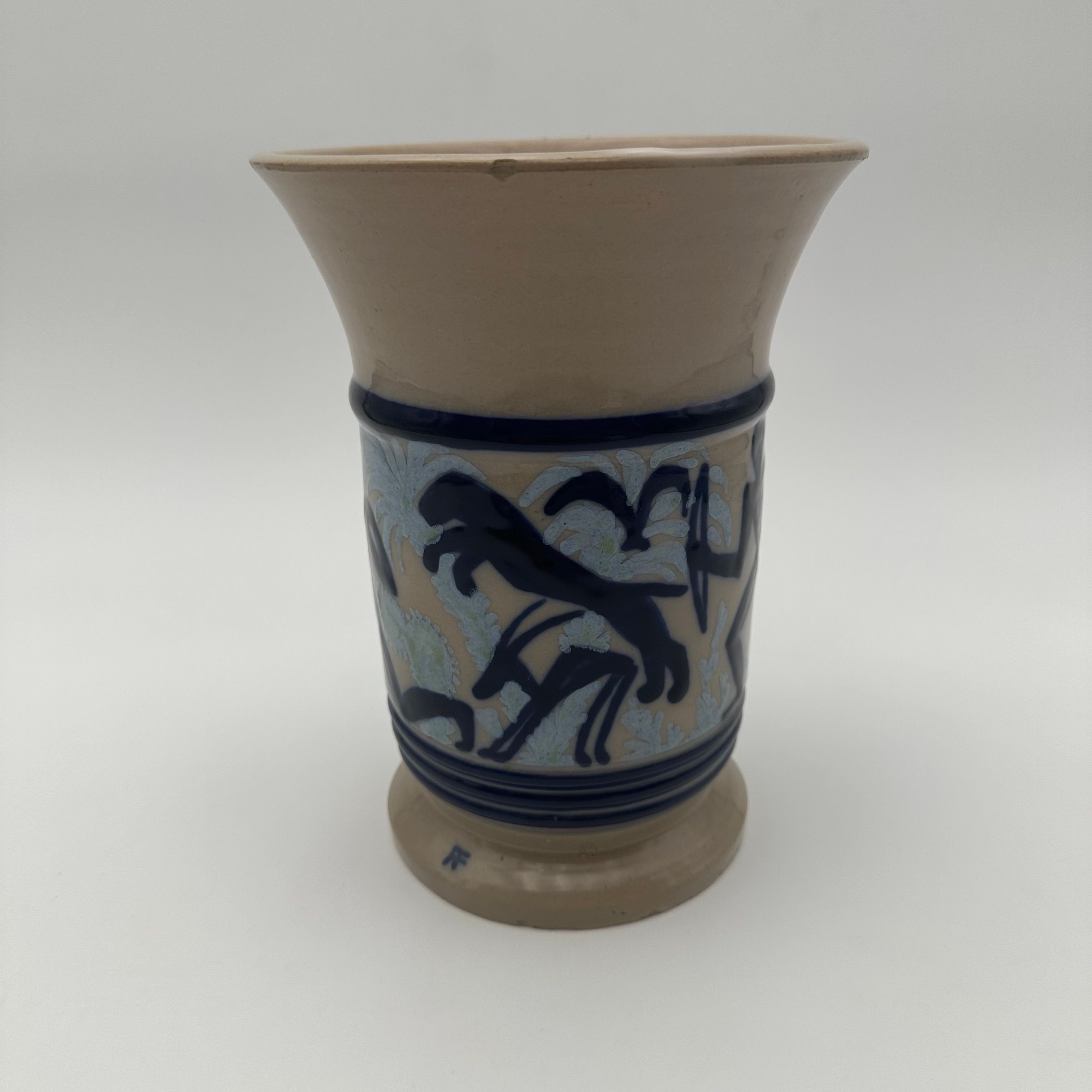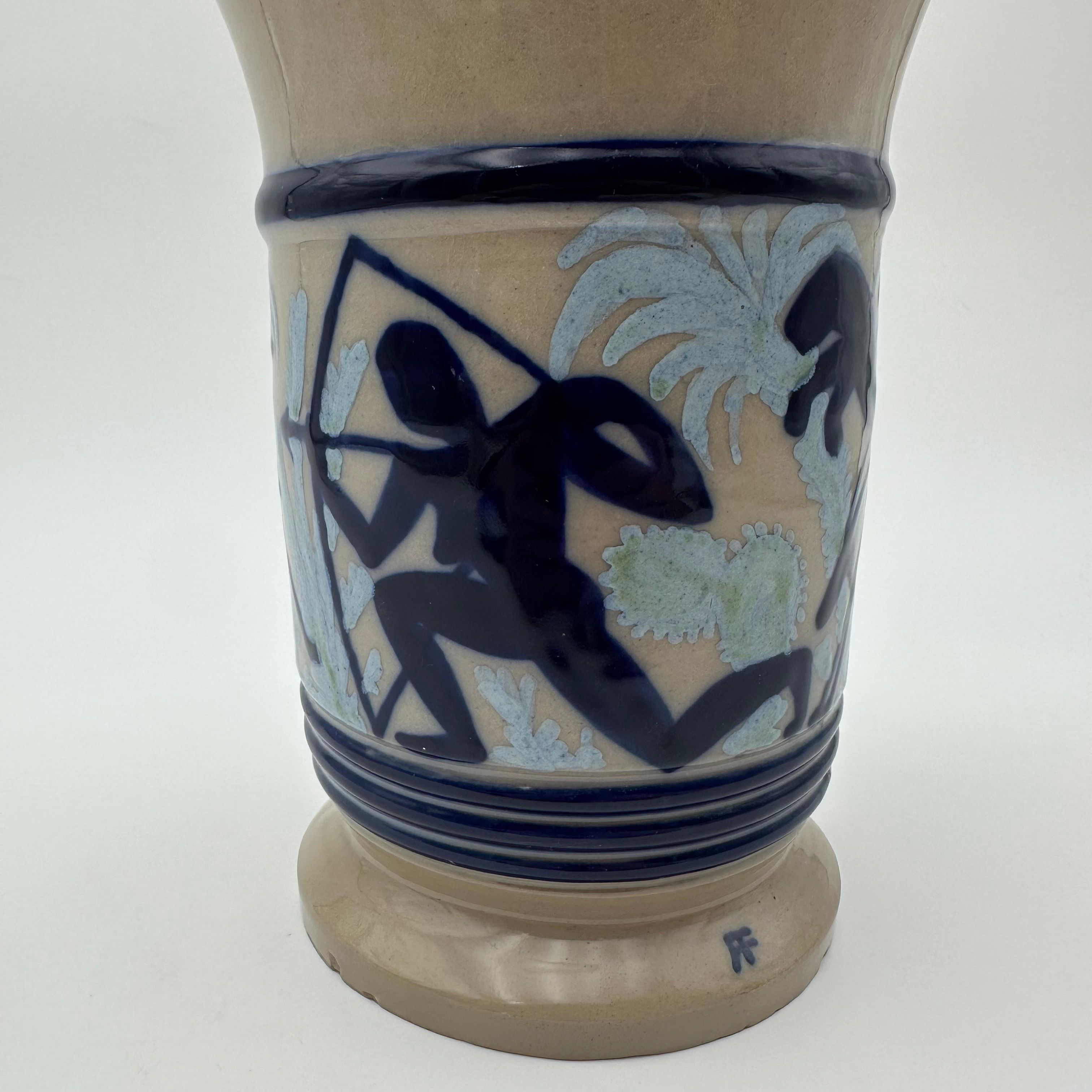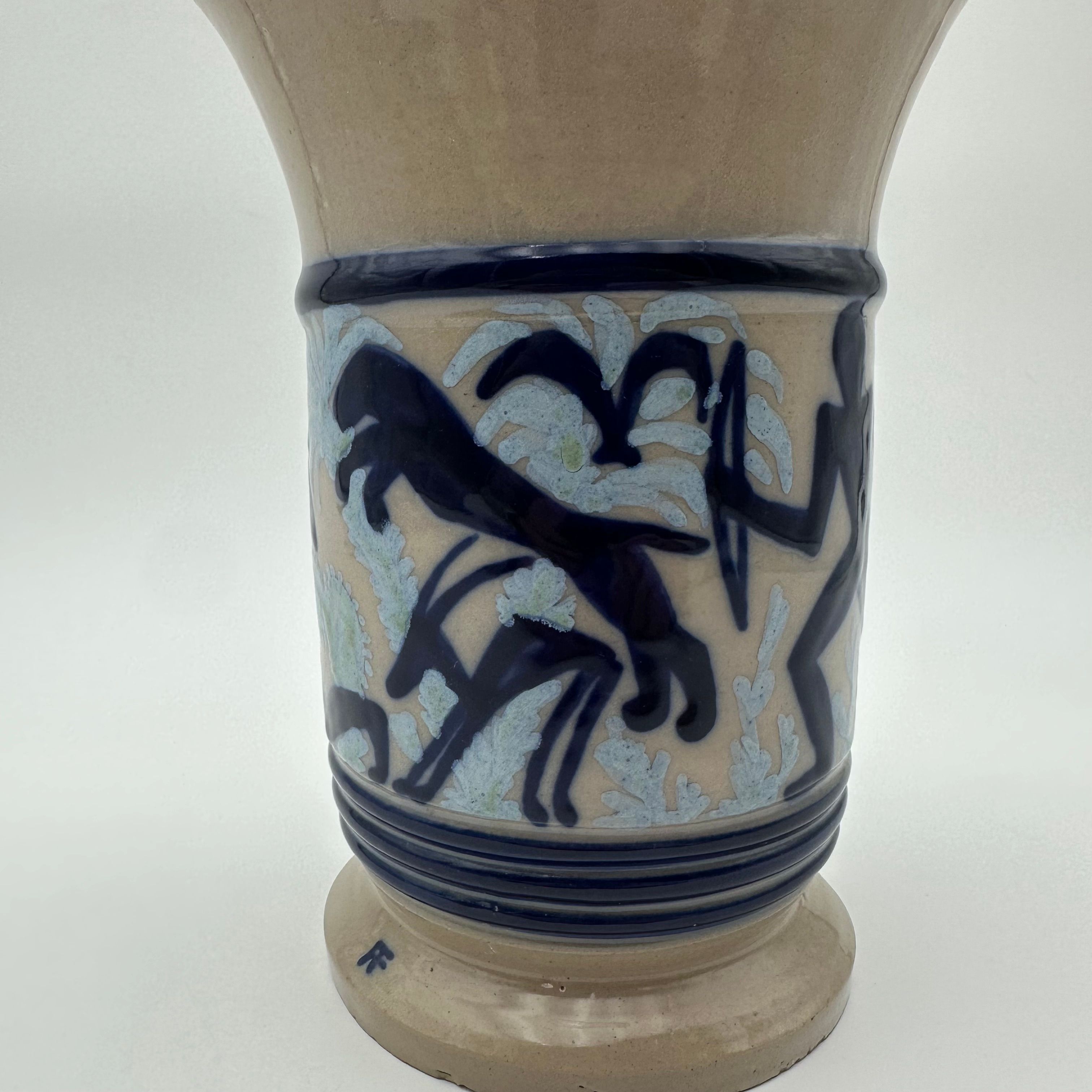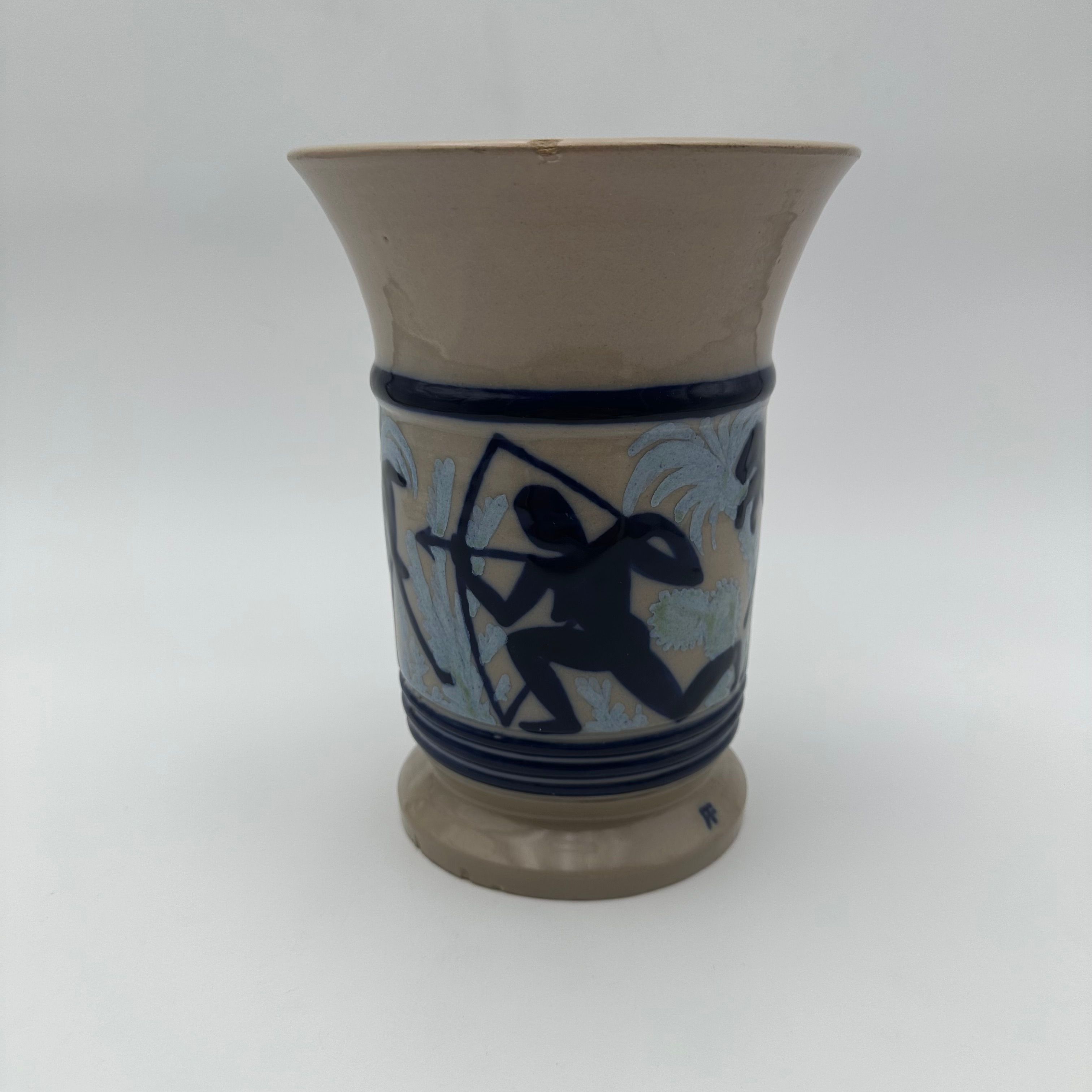 Ceramic vase featuring a stylized hunting scene depicting a man pursuing an animal within a graphic vegetal setting. Rendered in deep blue reserve decoration on a beige ground, the piece reflects the decorative aesthetic of early 20th-century production.