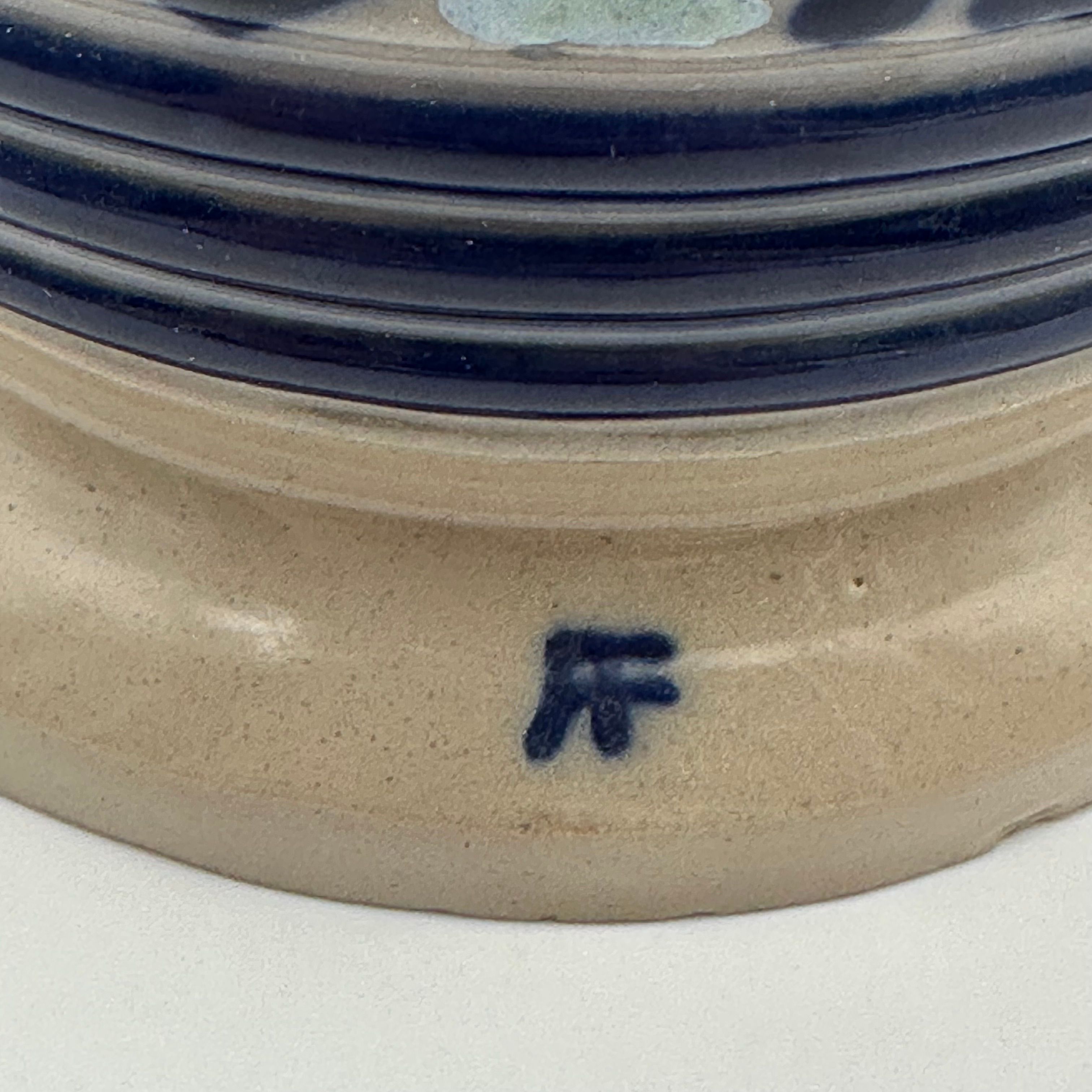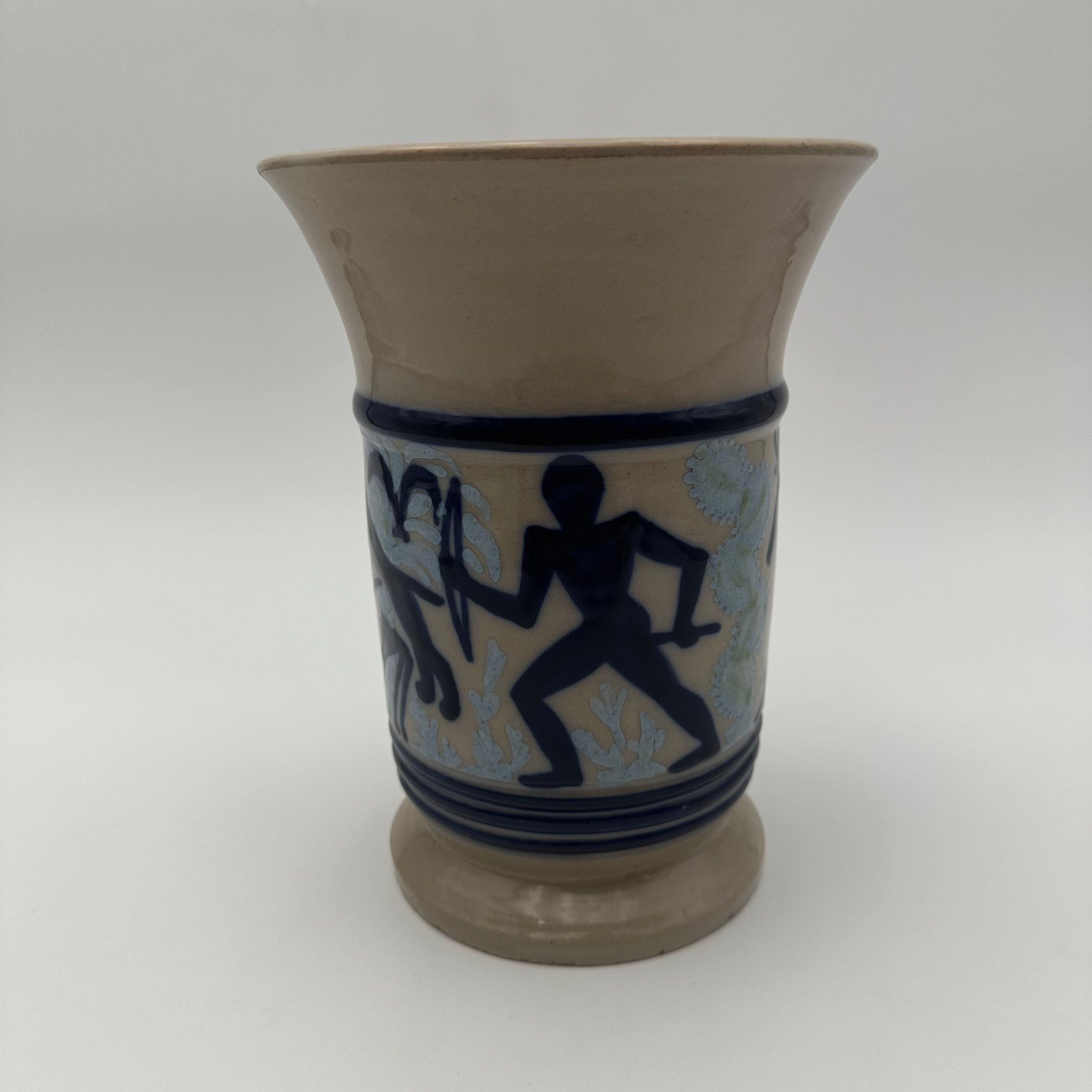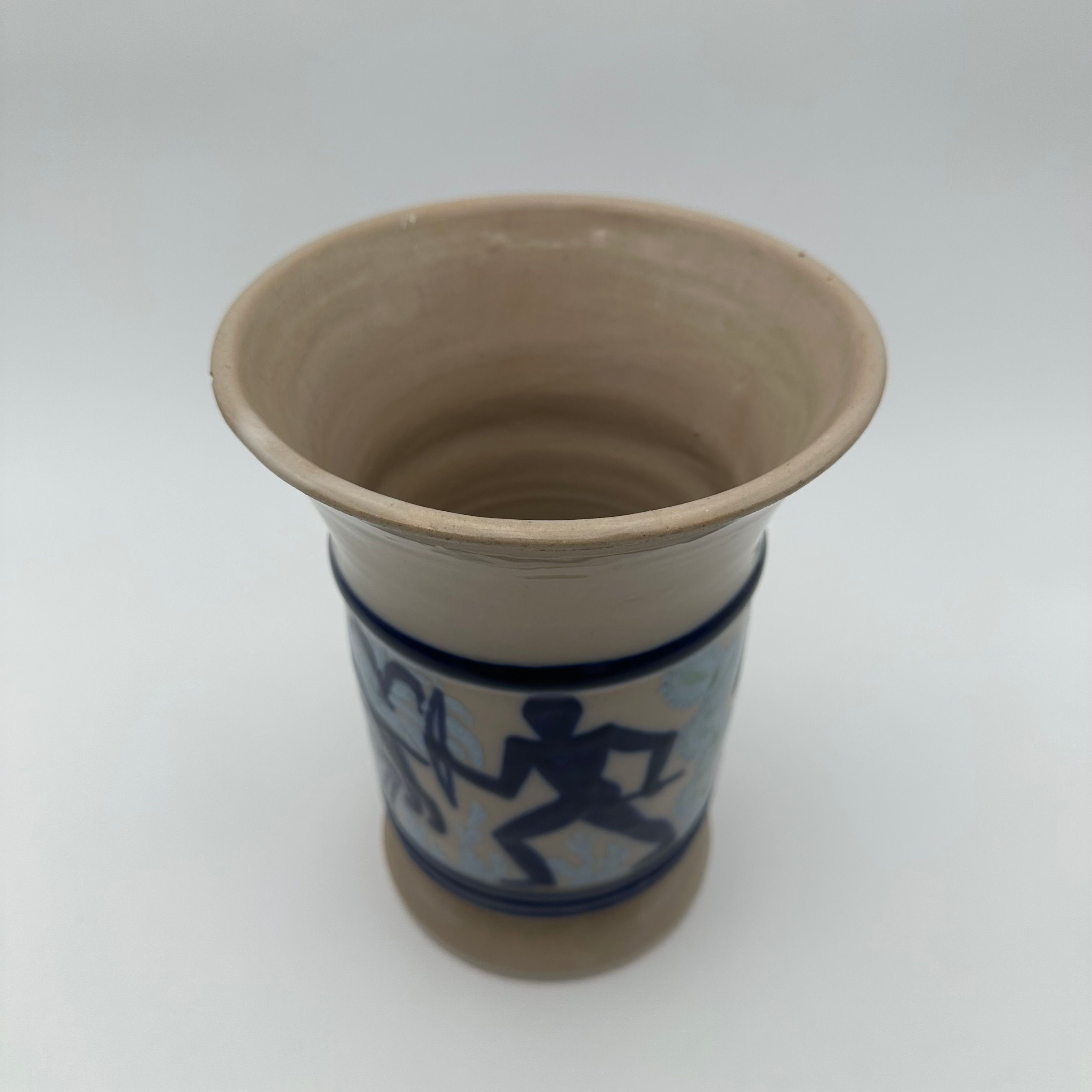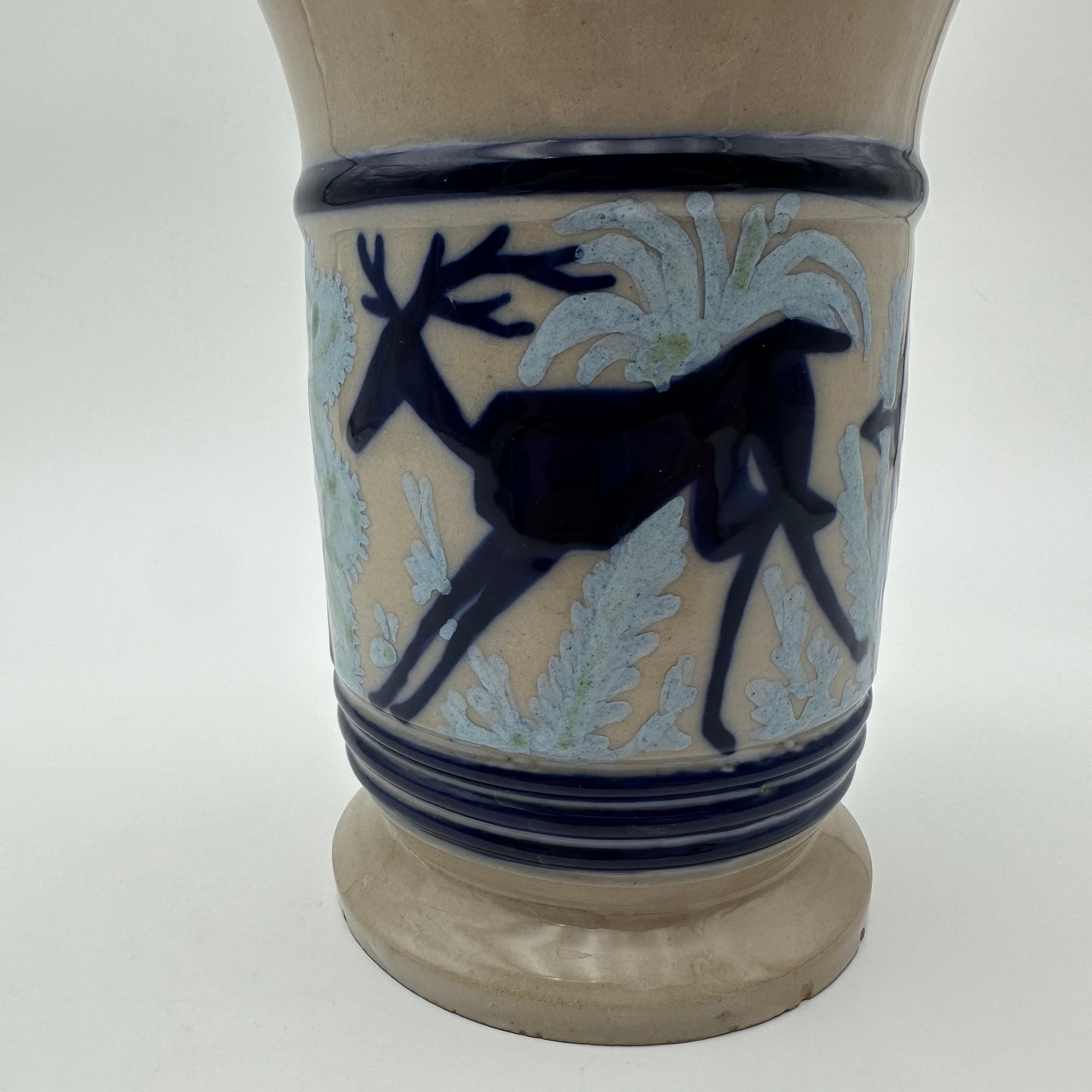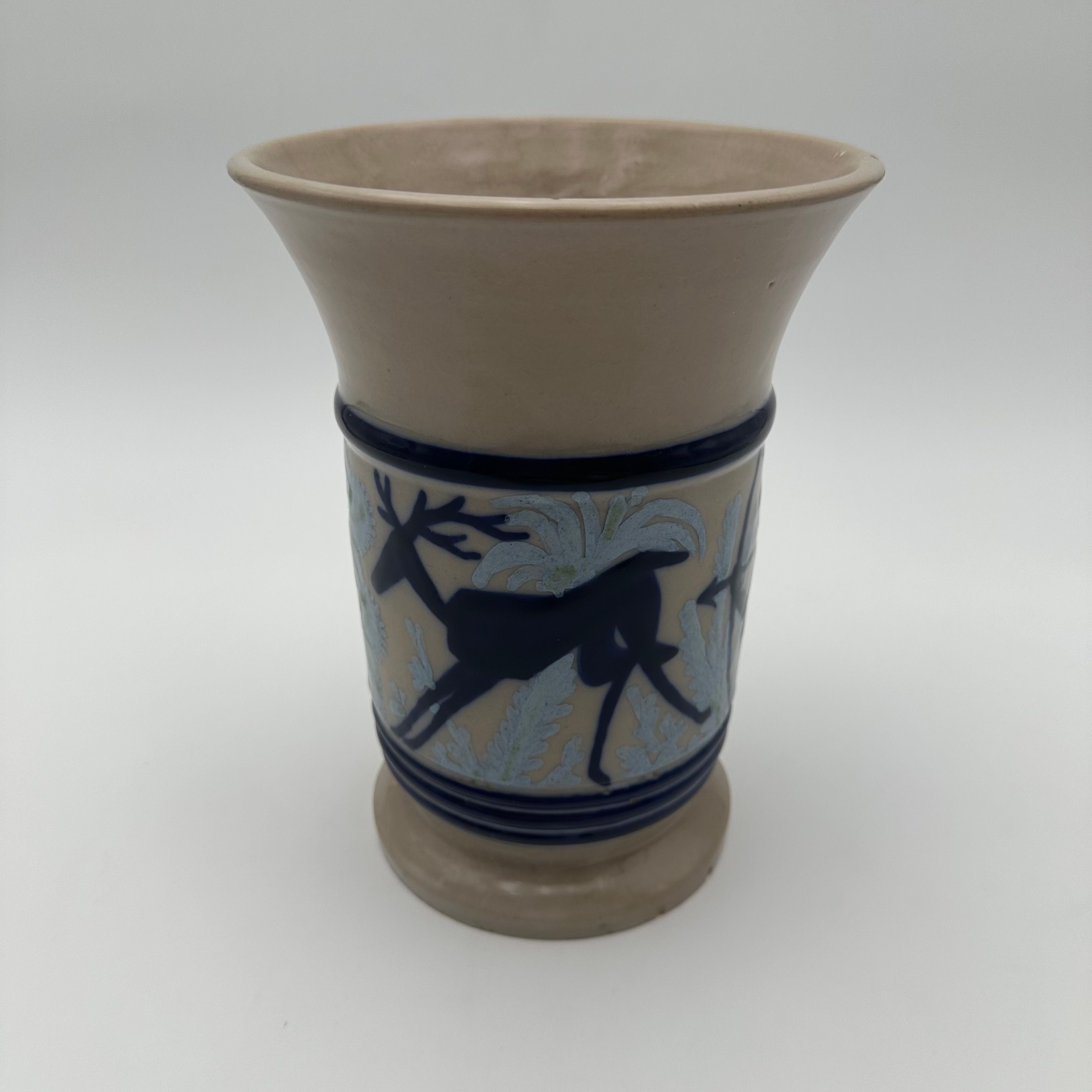Ceramic vase featuring a stylized hunting scene depicting a man pursuing an animal within a graphic vegetal setting. Rendered in deep blue reserve decoration on a beige ground, the piece reflects the decorative aesthetic of early 20th-century production.