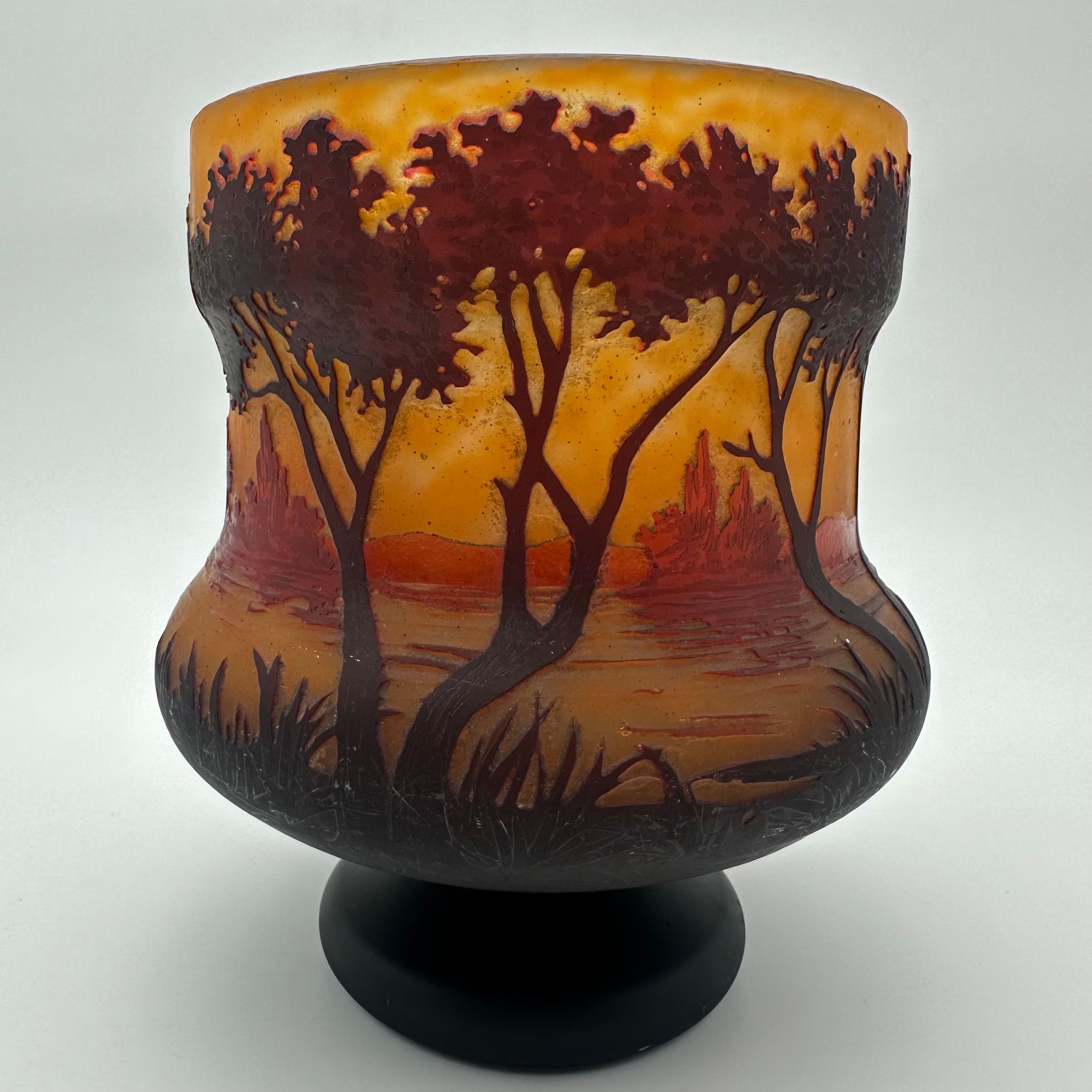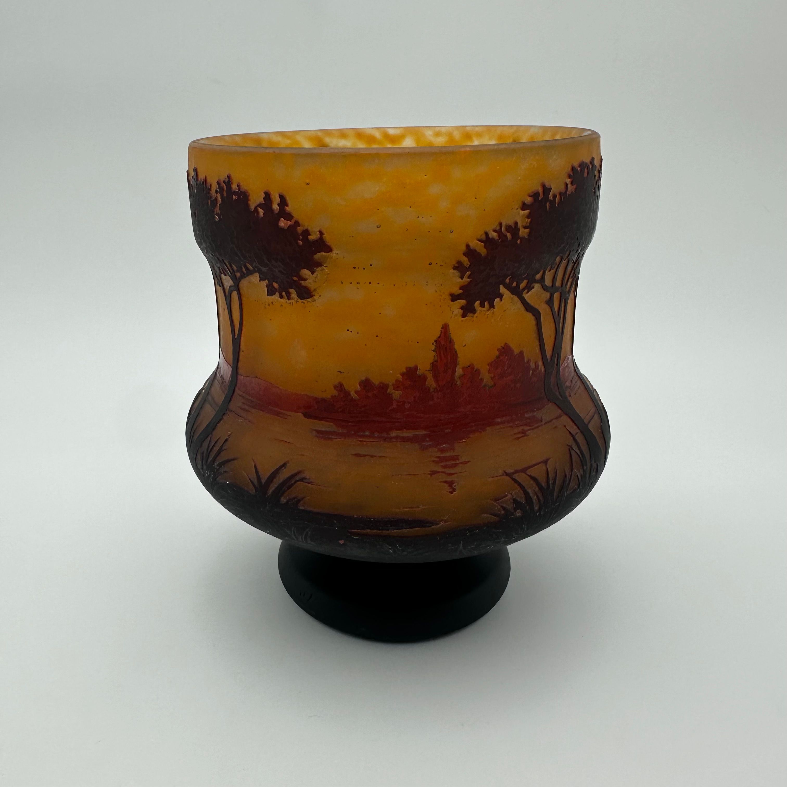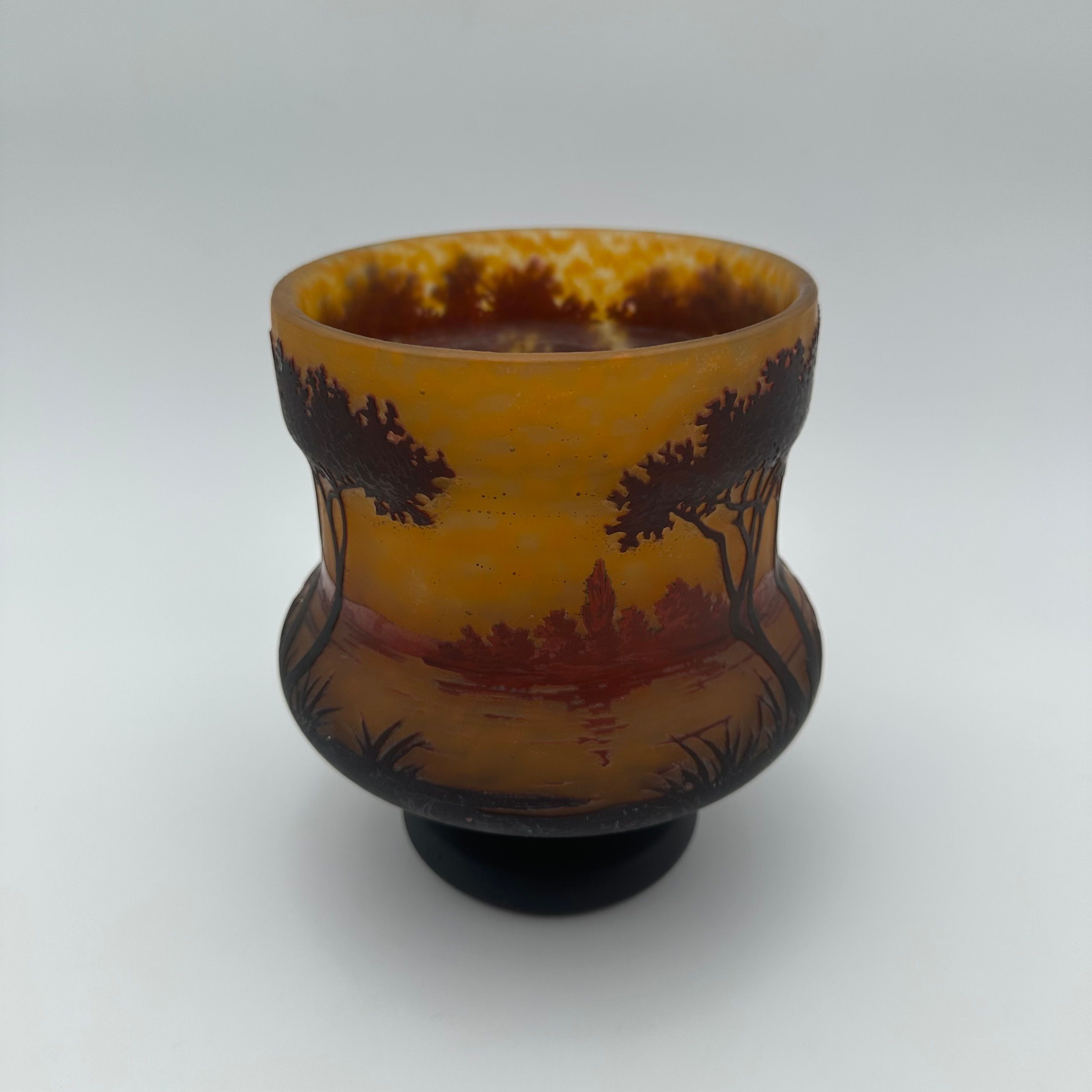 Art Nouveau cameo glass vase featuring a finely acid-etched landscape decoration depicting trees silhouetted against a sunset over water. The warm amber and deep brown overlays create a rich atmospheric effect, characteristic of the École de Nancy production at the turn of the 20th century.
