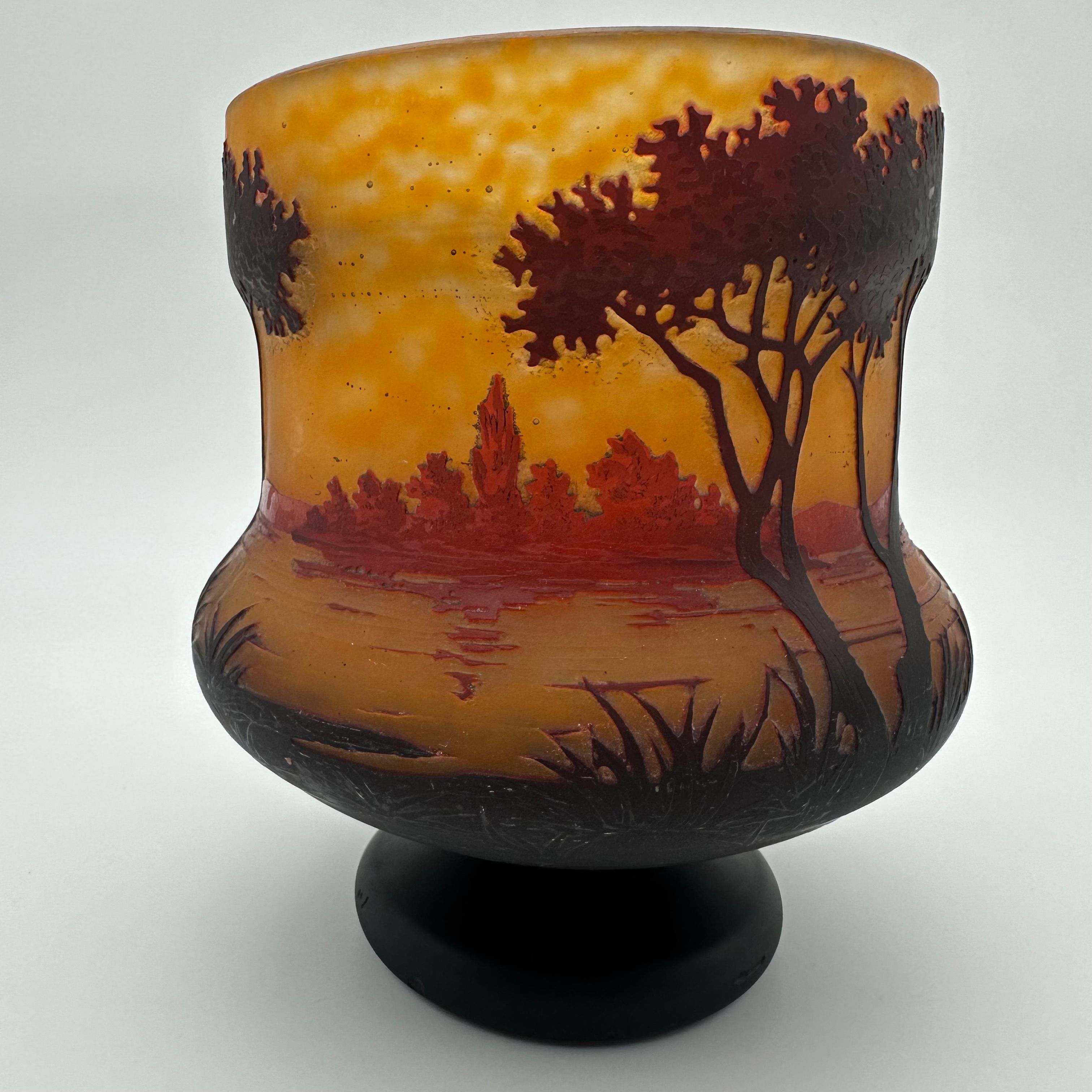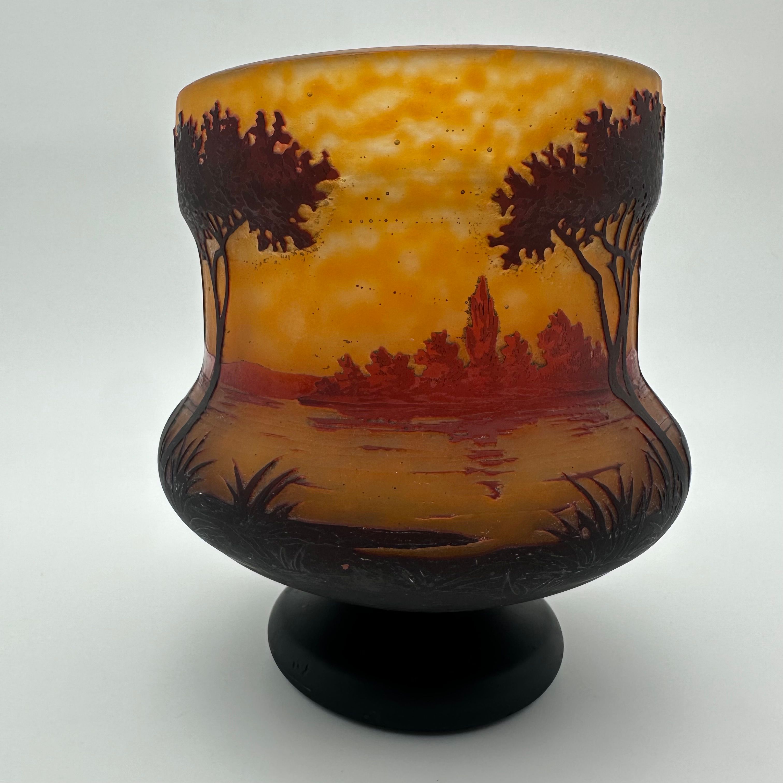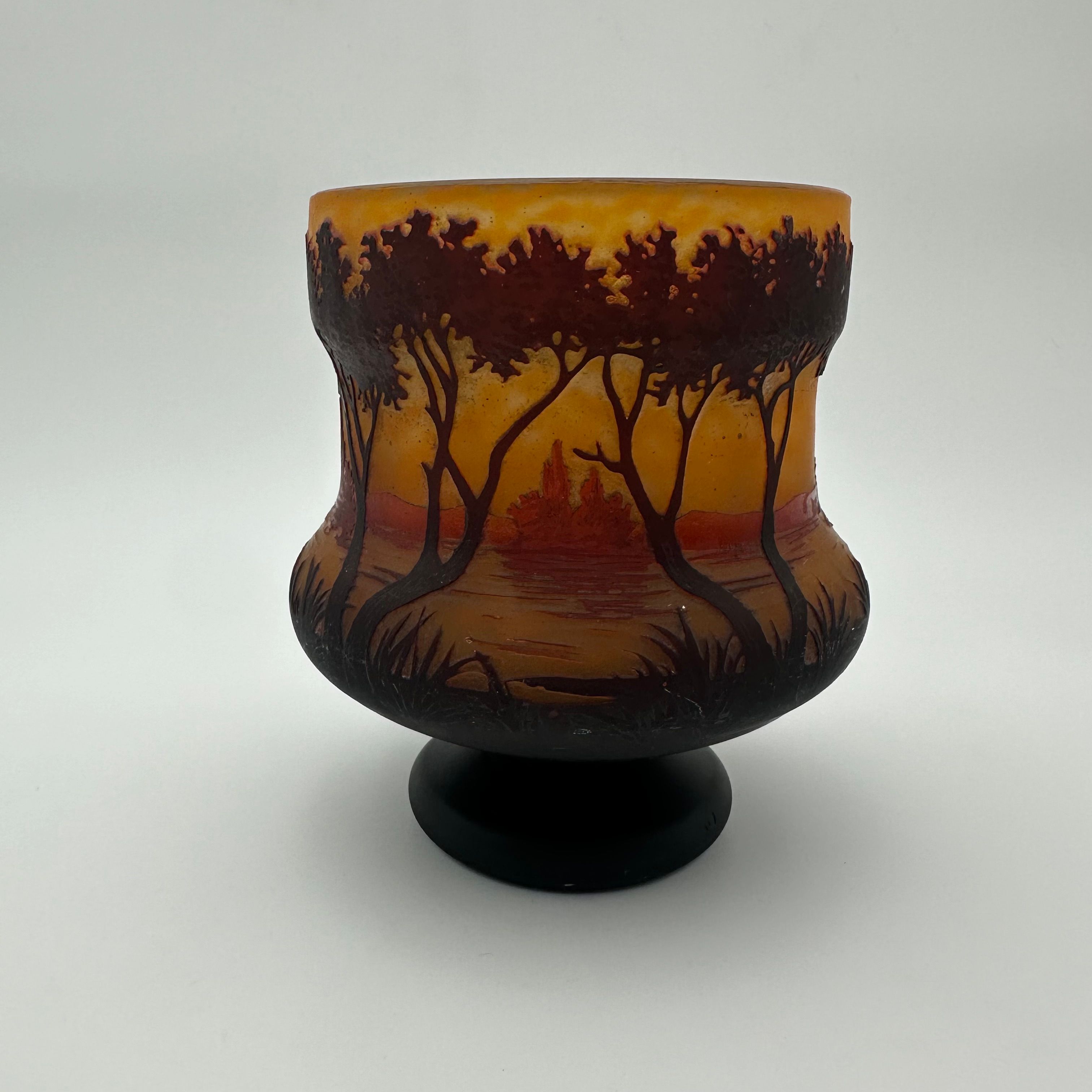 Art Nouveau cameo glass vase featuring a finely acid-etched landscape decoration depicting trees silhouetted against a sunset over water. The warm amber and deep brown overlays create a rich atmospheric effect, characteristic of the École de Nancy production at the turn of the 20th century.